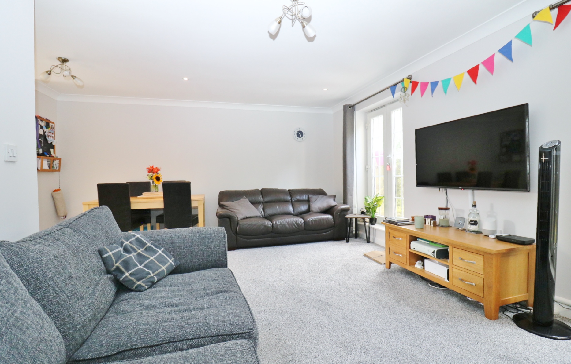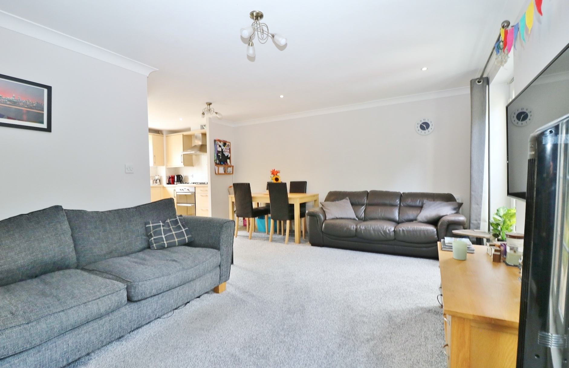 On the first floor there is a modern WC and a spacious lounge/diner which enjoys two Juliet balconies to the rear. An opening to one side leads through to the kitchen which faces the front of the property and has been fitted with a range of wall and base units with a built-in double oven and gas hob with extractor over, as well as an integrated fridge/freezer and dishwasher.