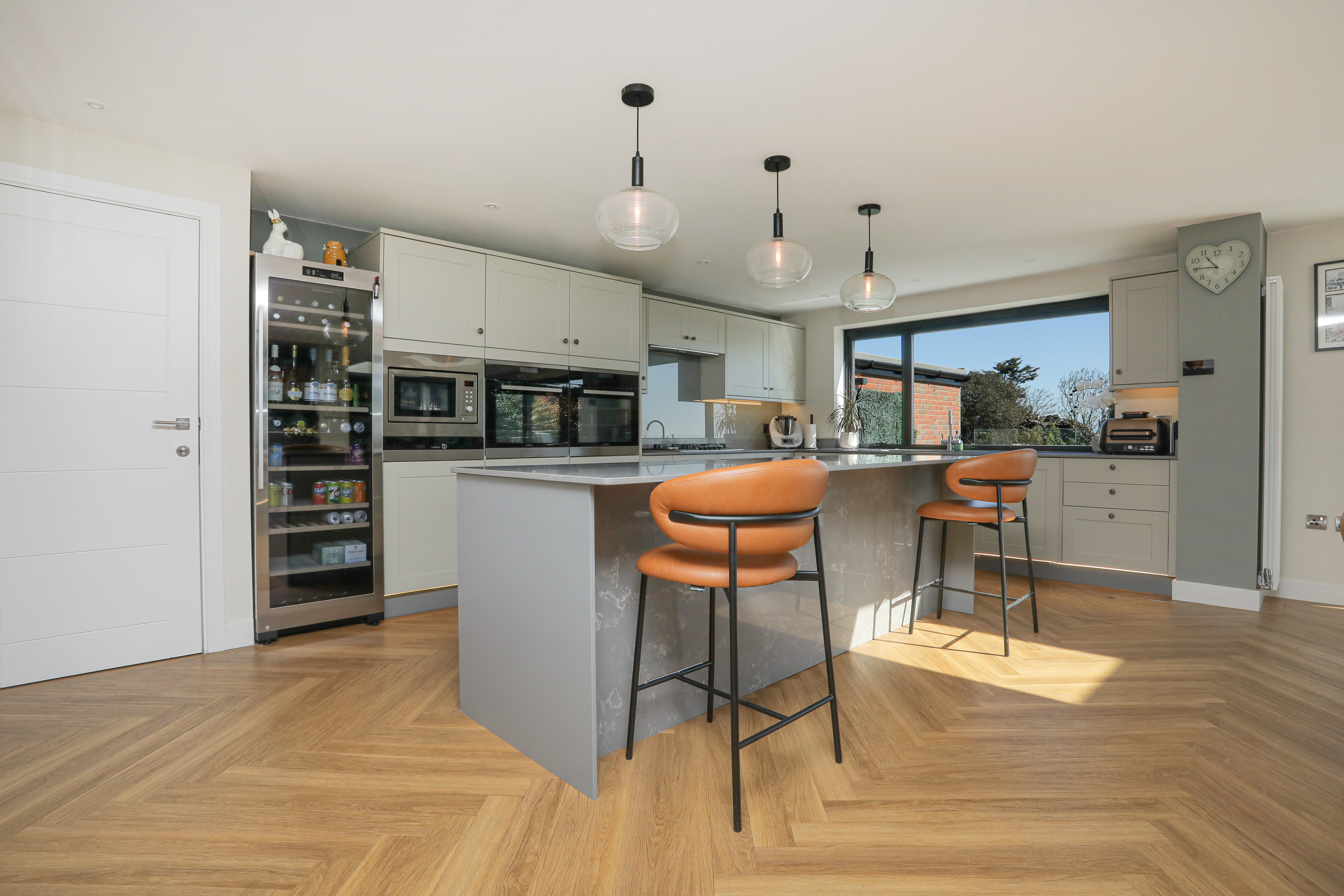 Set back from the road behind a walled front garden, the property has an impressive glass front door leading into the spacious hallway. Once over the threshold your eyes are immediately drawn to the breath-taking sea views, highlighted by the floor to ceiling triple stack sliding glass doors. The double height reception hallway leads into the open plan kitchen/dining room/lounge with Amtico flooring and two large skylights that maximise the natural light. The kitchen features a range of fitted appliances and a large kitchen island ideal for entertaining, leading to a utility room with fitted units and Miele appliances, along with a door to the garage. The elegant lounge space offers views of both the front of the house and the sea, featuring a contemporary flame-effect gas fire, a panelled wall and fitted glass cabinets.