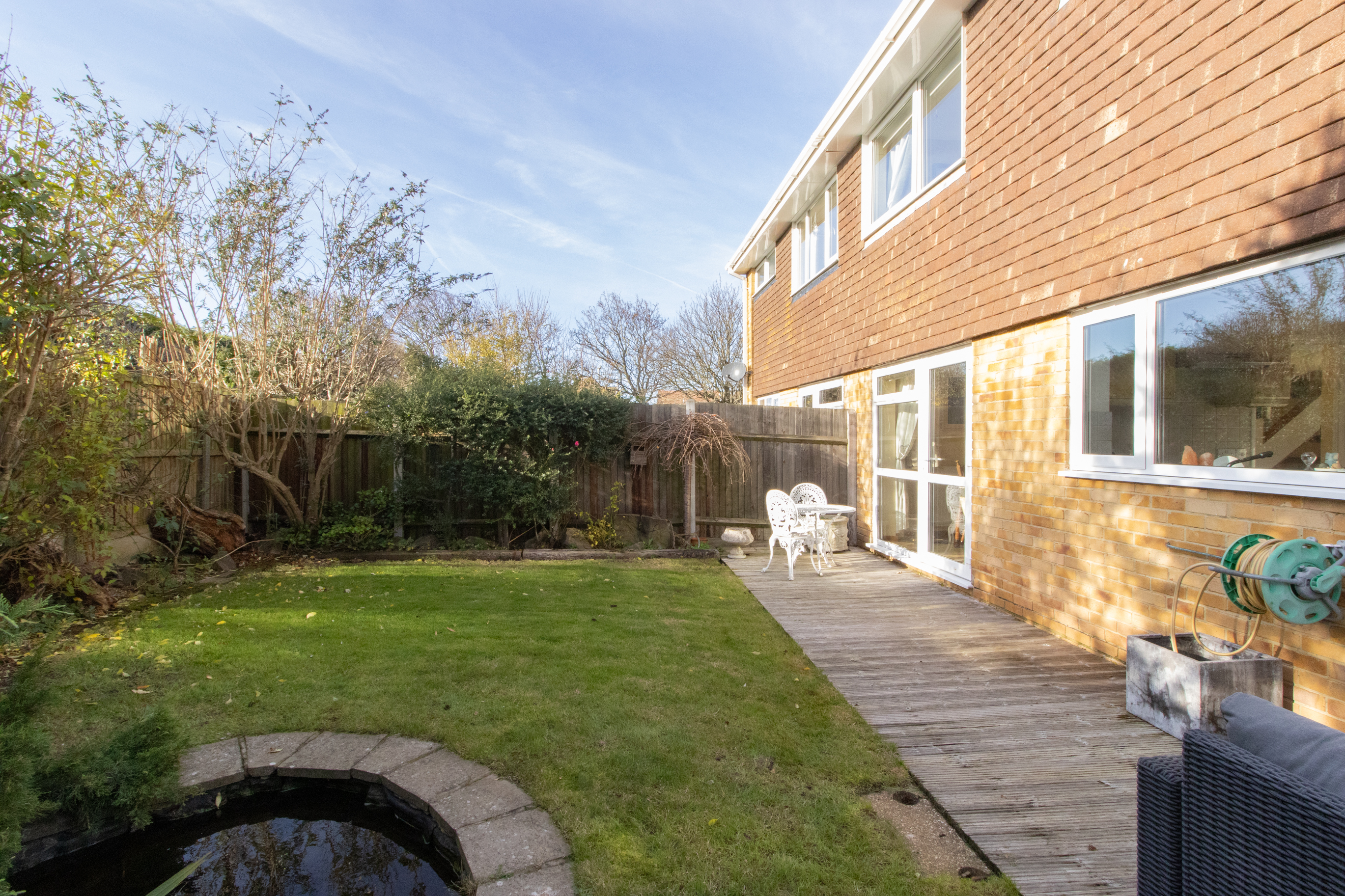 The south-facing rear garden is a true highlight, offering a tranquil and private retreat. Designed for low maintenance, it includes a lawned area, a charming pond feature, and access to the large garage.