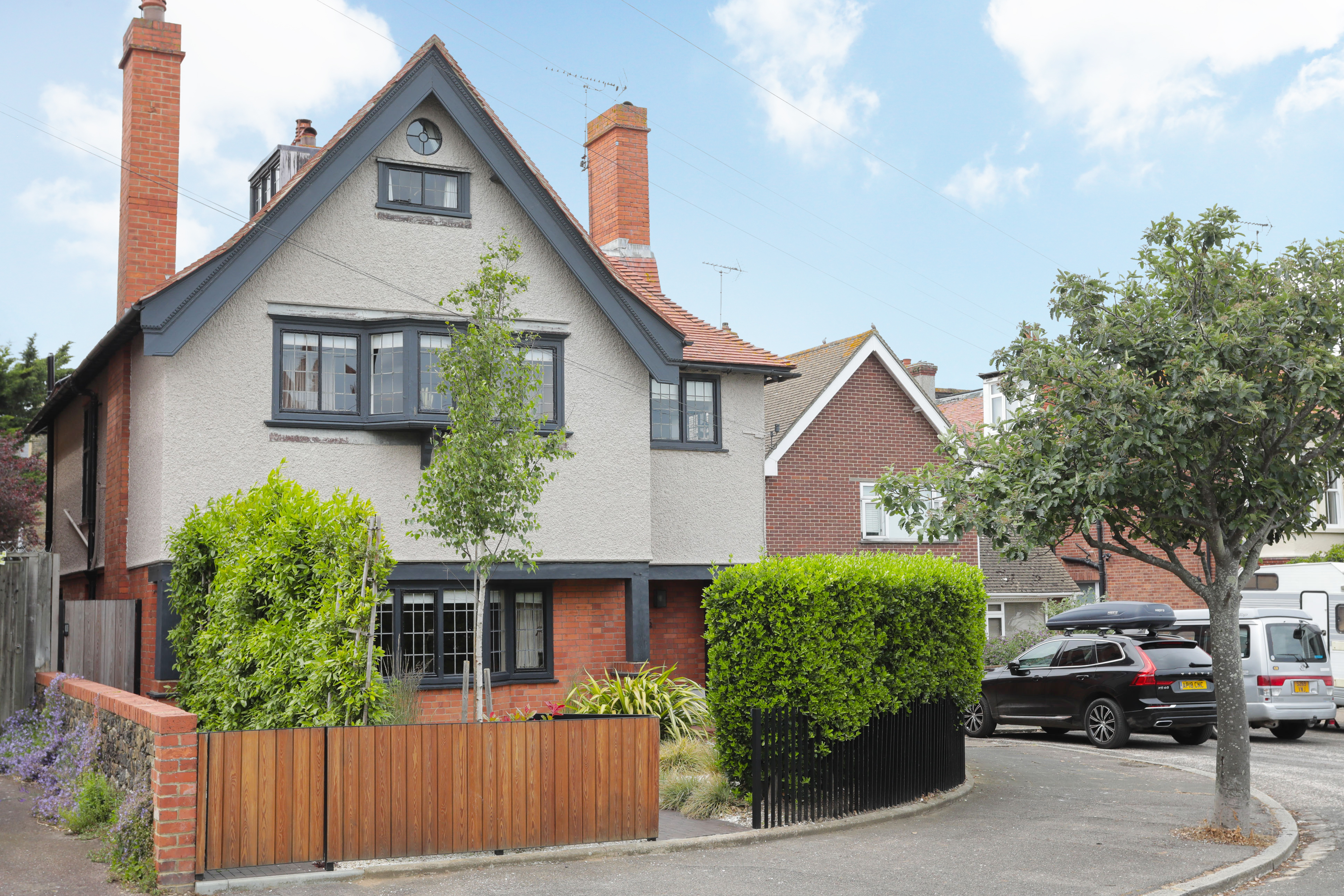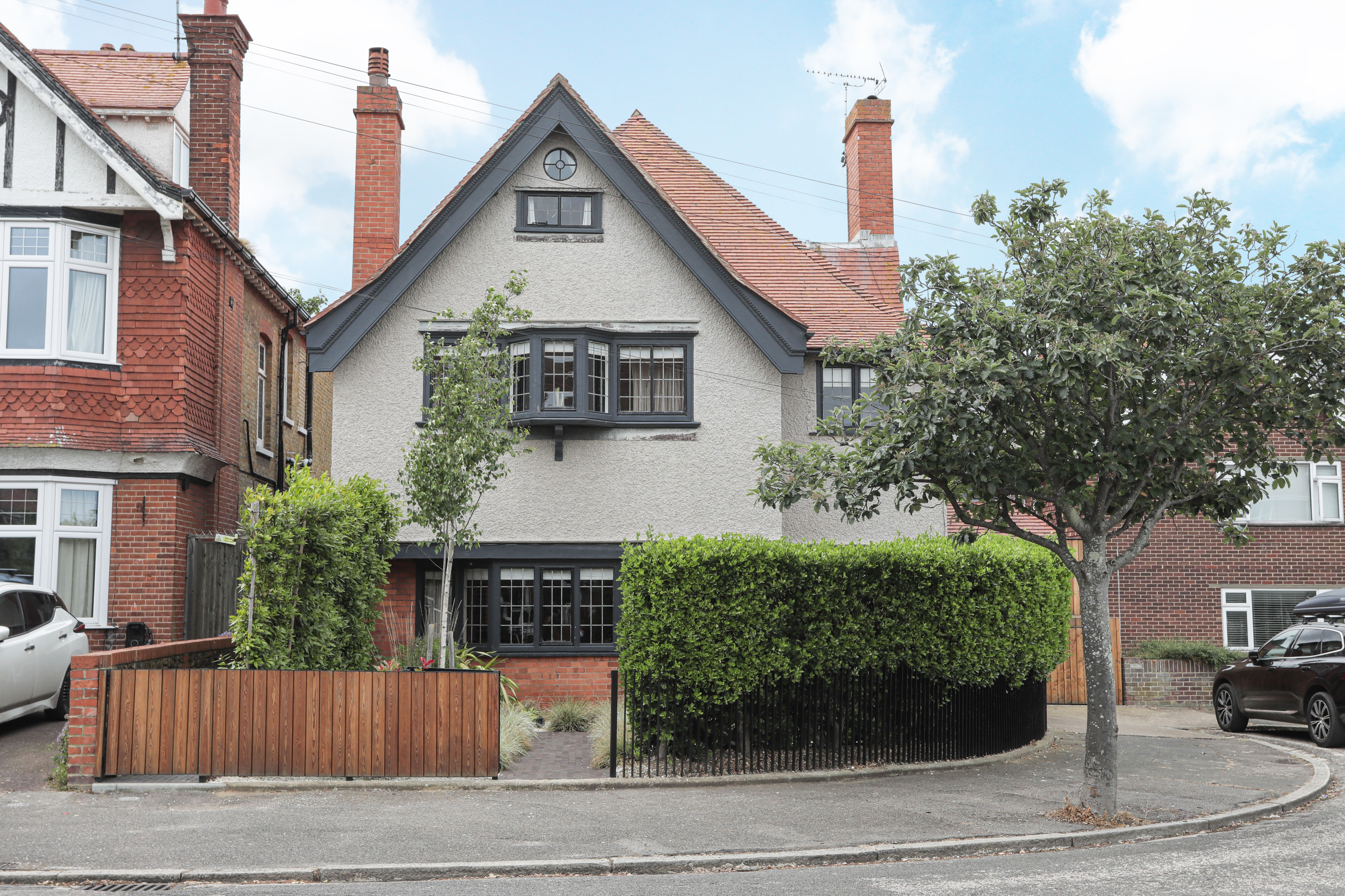 Exterior - front, the property is set back from the road with bespoke railings and larch fencing that wraps around part of the building. Two gate access into the house, main gate for the front door, and also a side gate to get to the rear garden. The fencing covers the external bike store which is wide enough for canoes or kayaks. Dedicated parking space. Dark herringbone pavers take you from the gates to the doors, with lots of planting and greenery and sensor lighting.