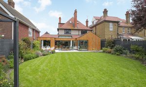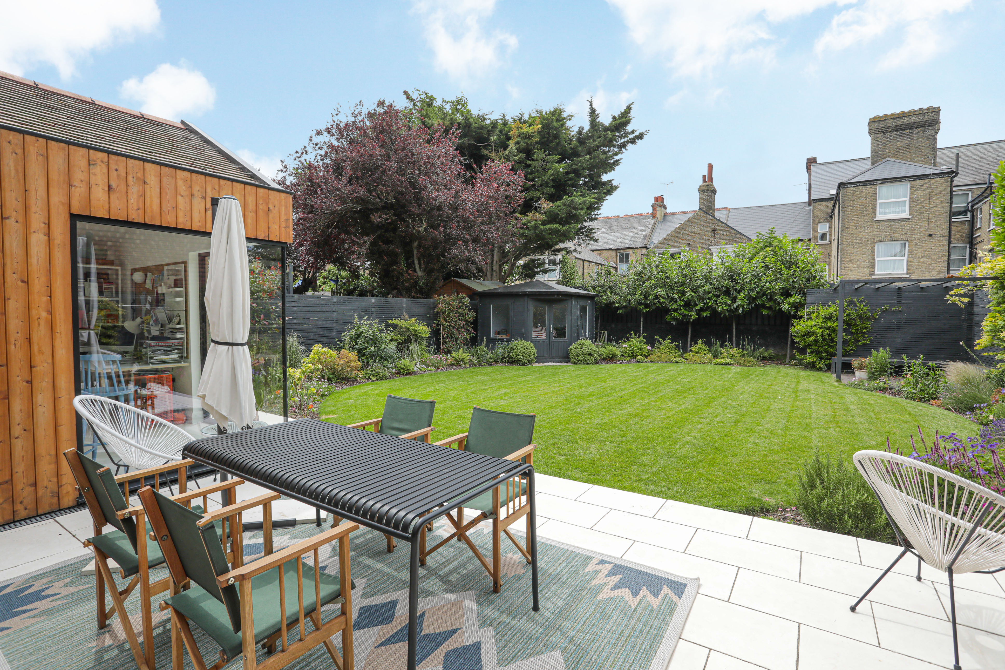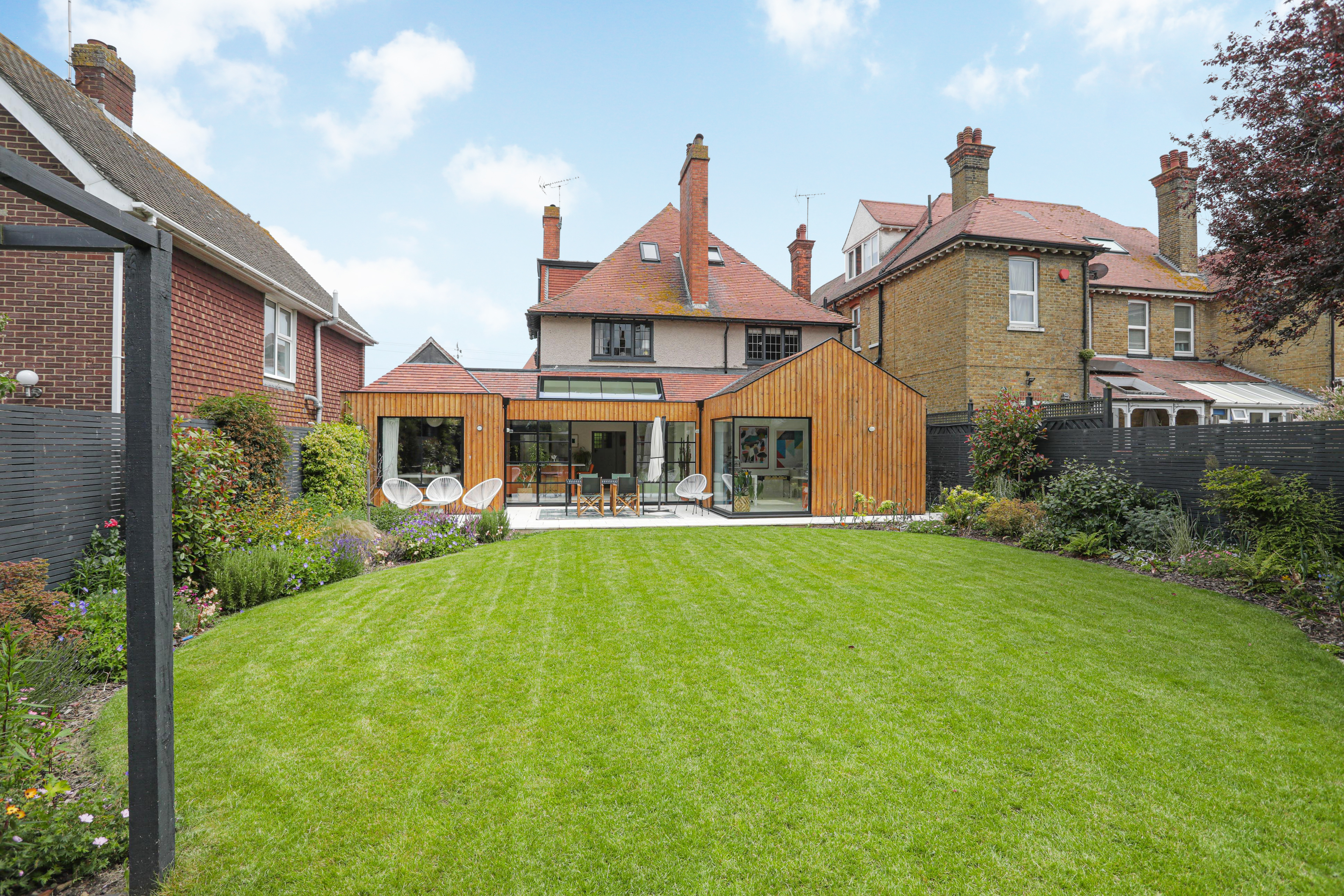 Exterior - rear, the rear reception areas have been clad in Siberian larch, and the internal limestone flooring continues to the generous patio. The lawn has been re-laid and borders both side and rear landscaped with a variety of trees, shrubs and planting.