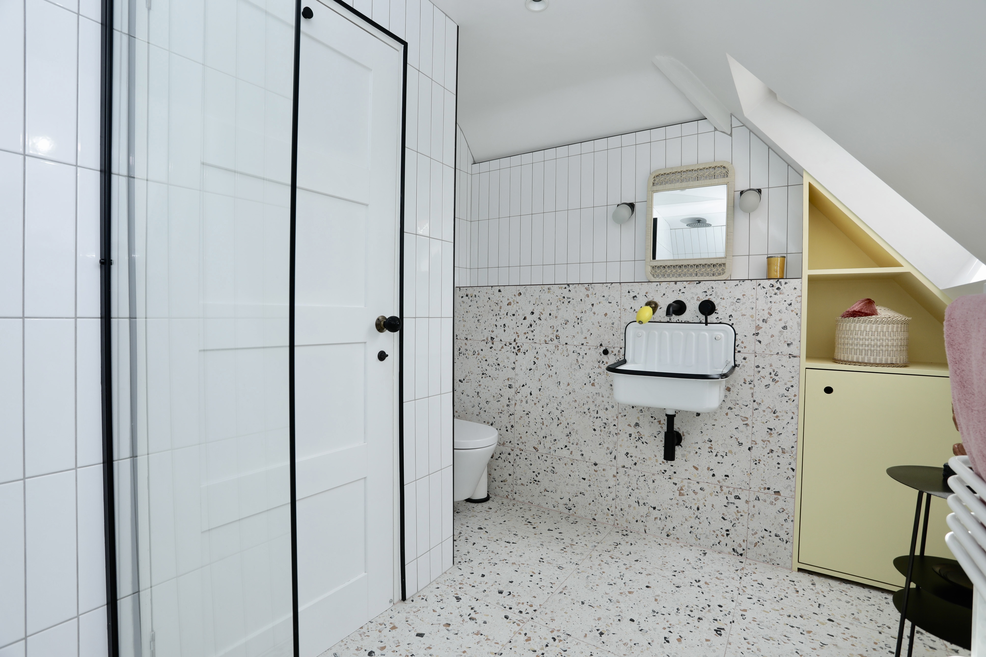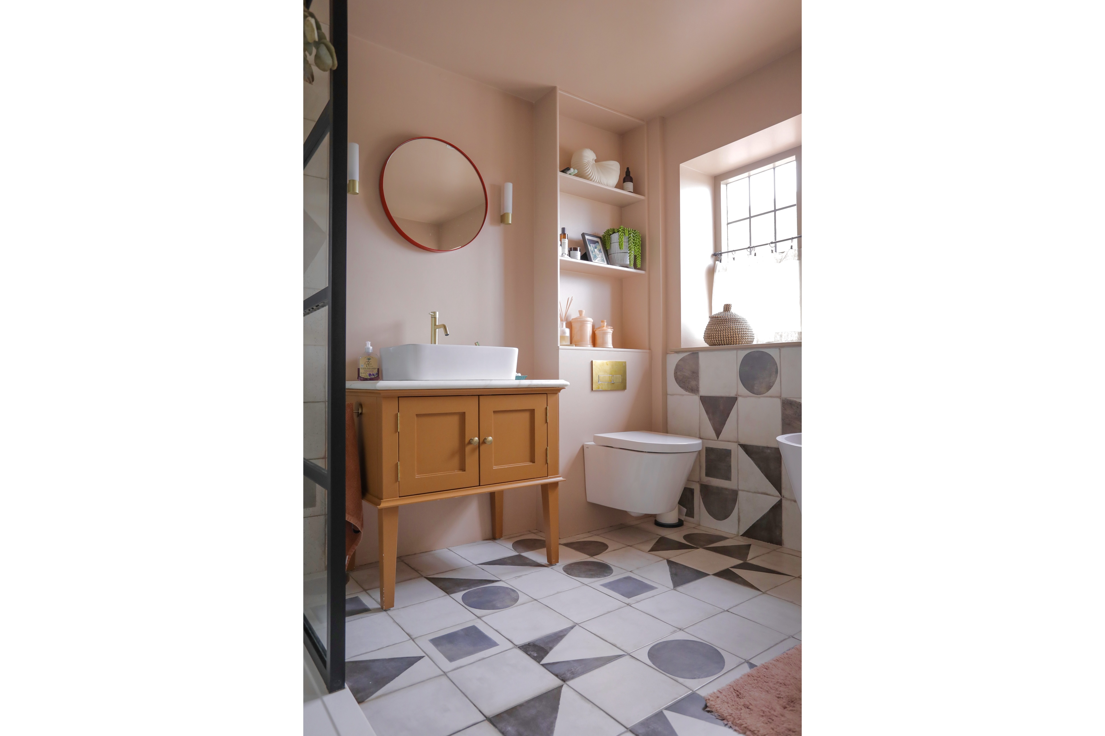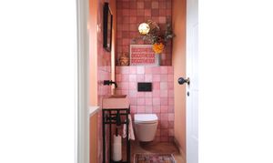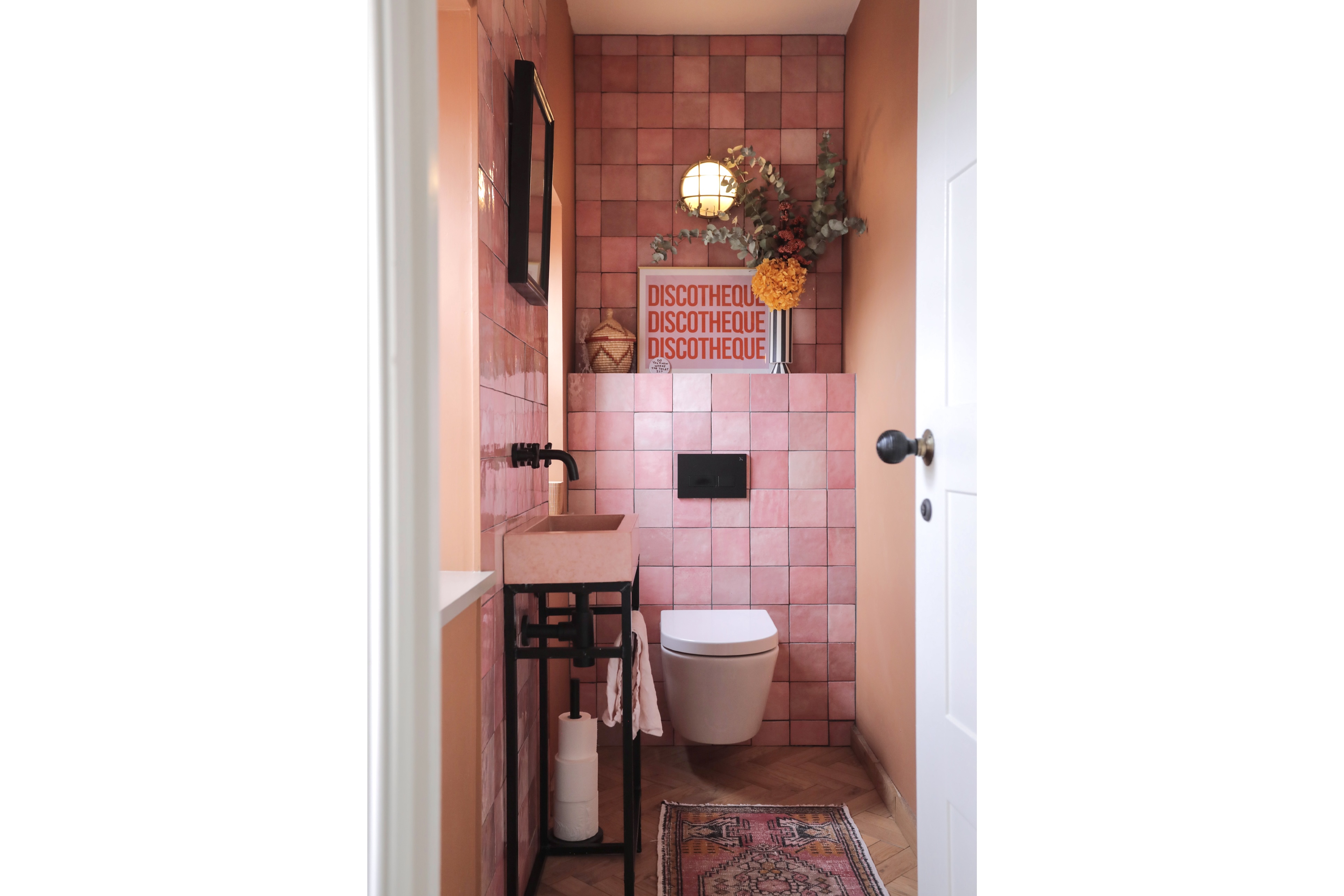 Hallway leads to WC featuring wall hung WC, tiled walls and pink concrete basin.