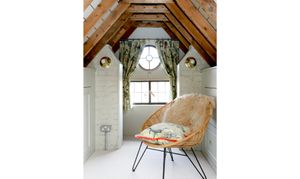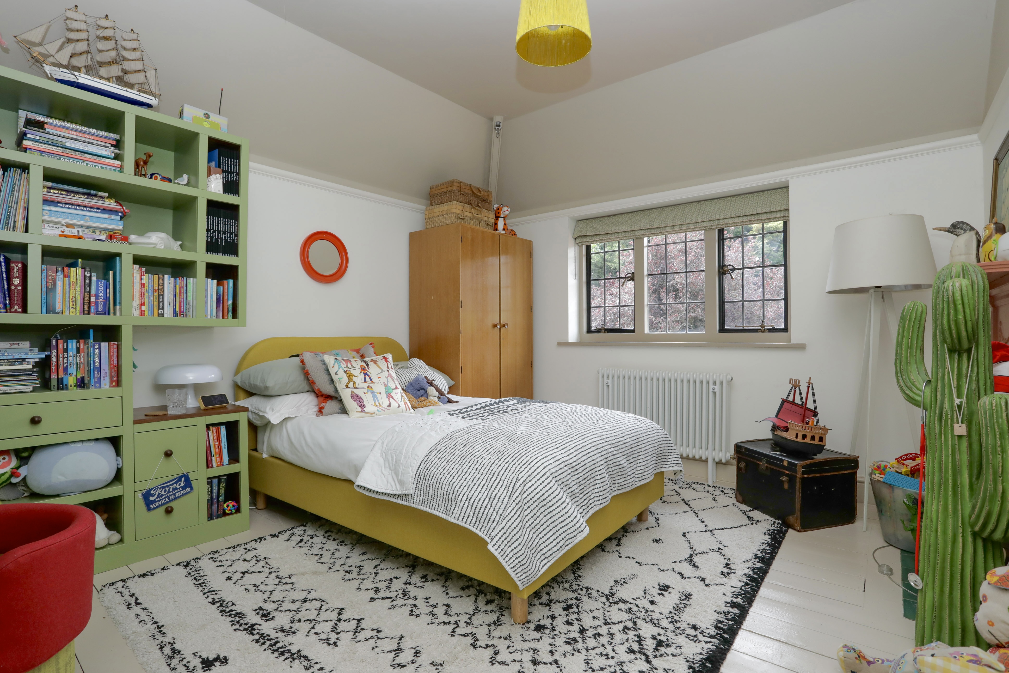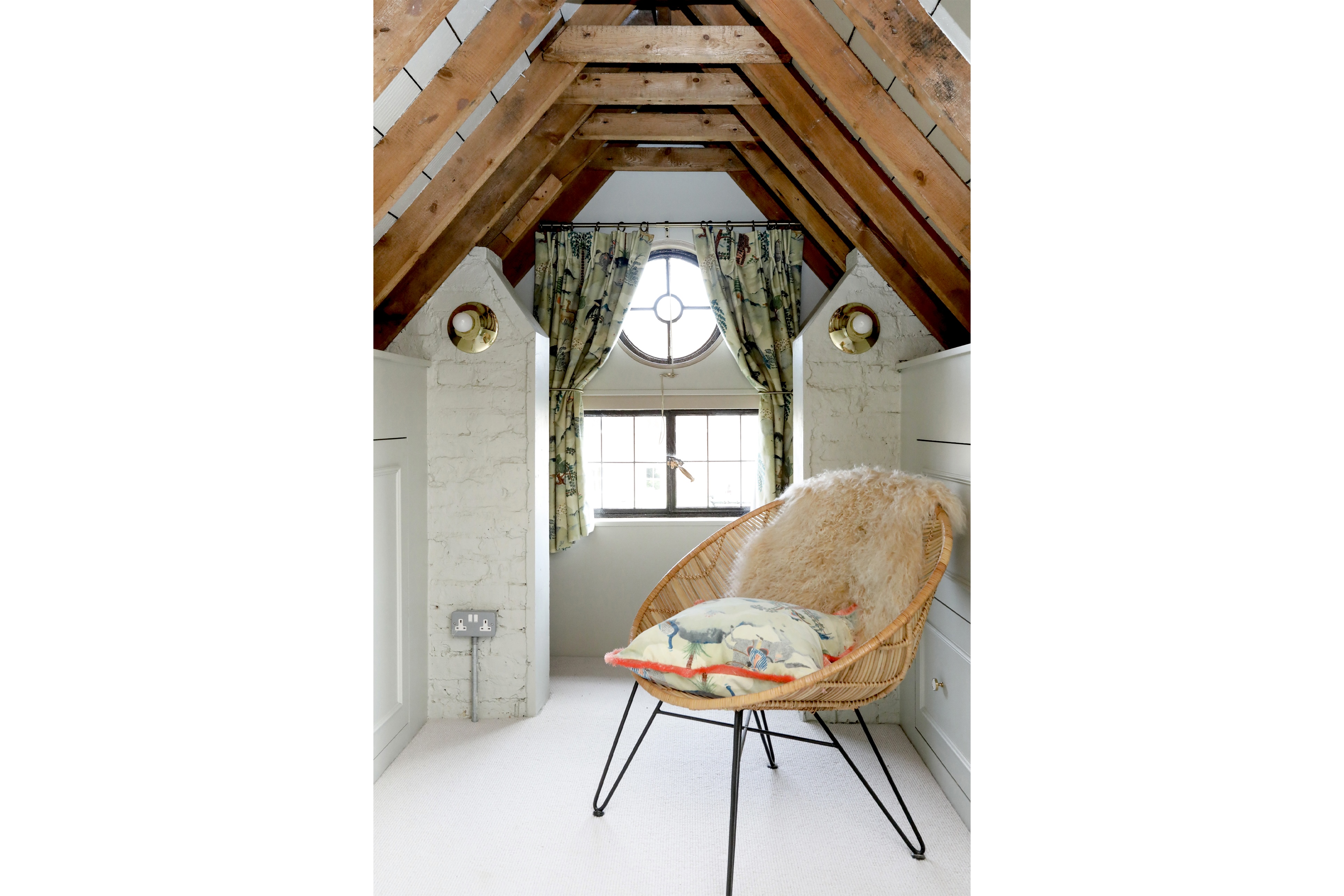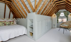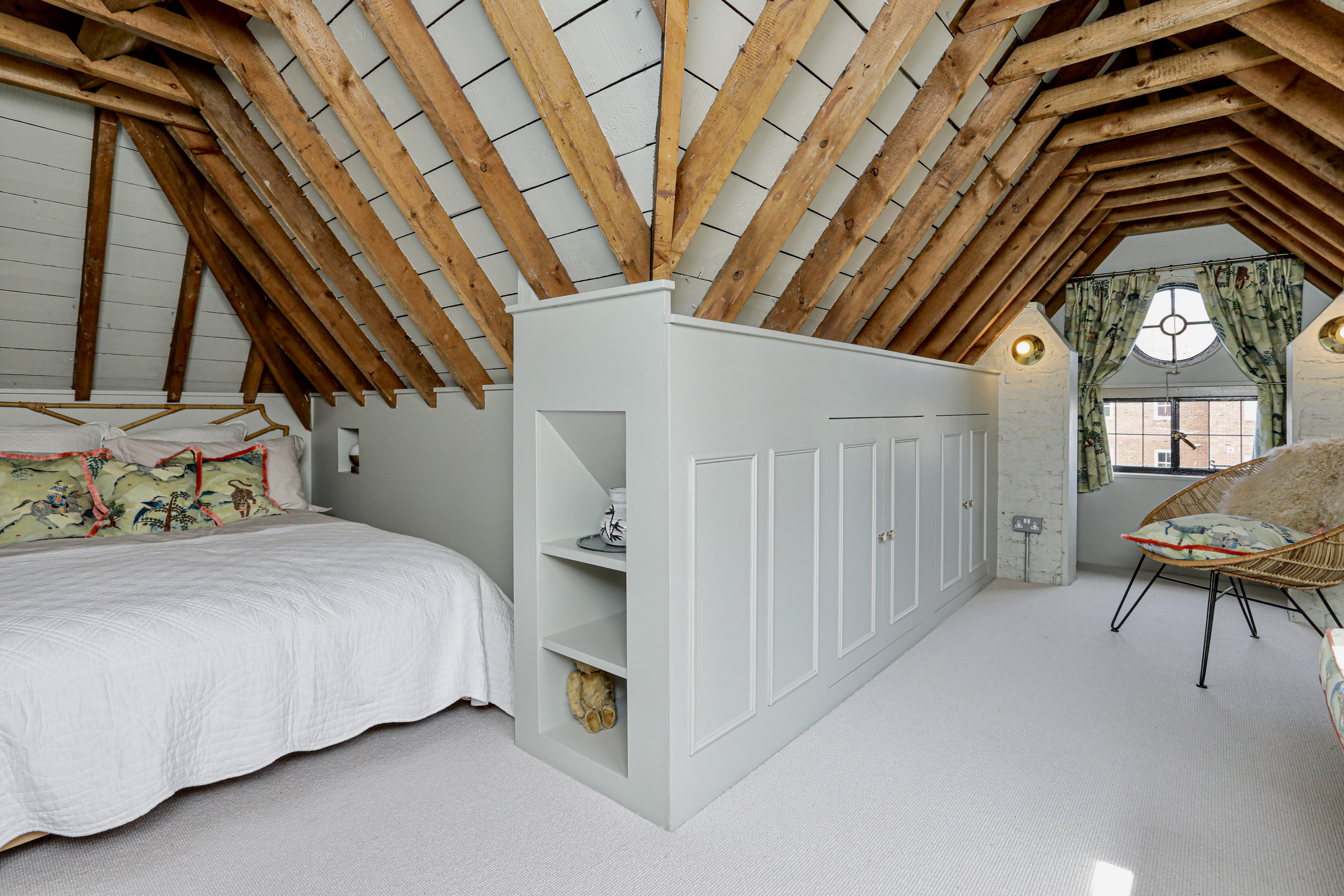Sixth bedroom in attic space with bespoke built in storage cupboards and rails, built in seat and porthole window.