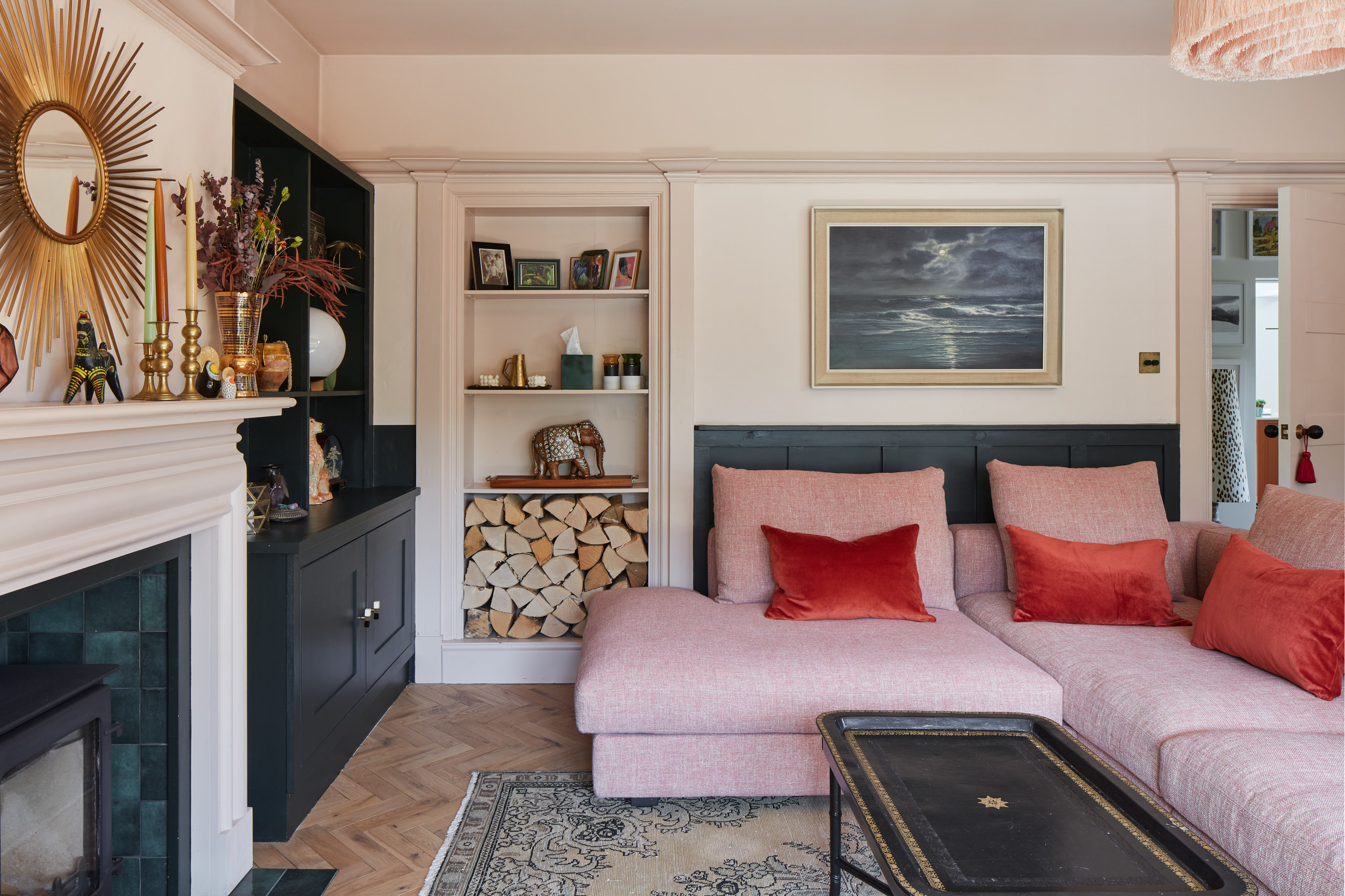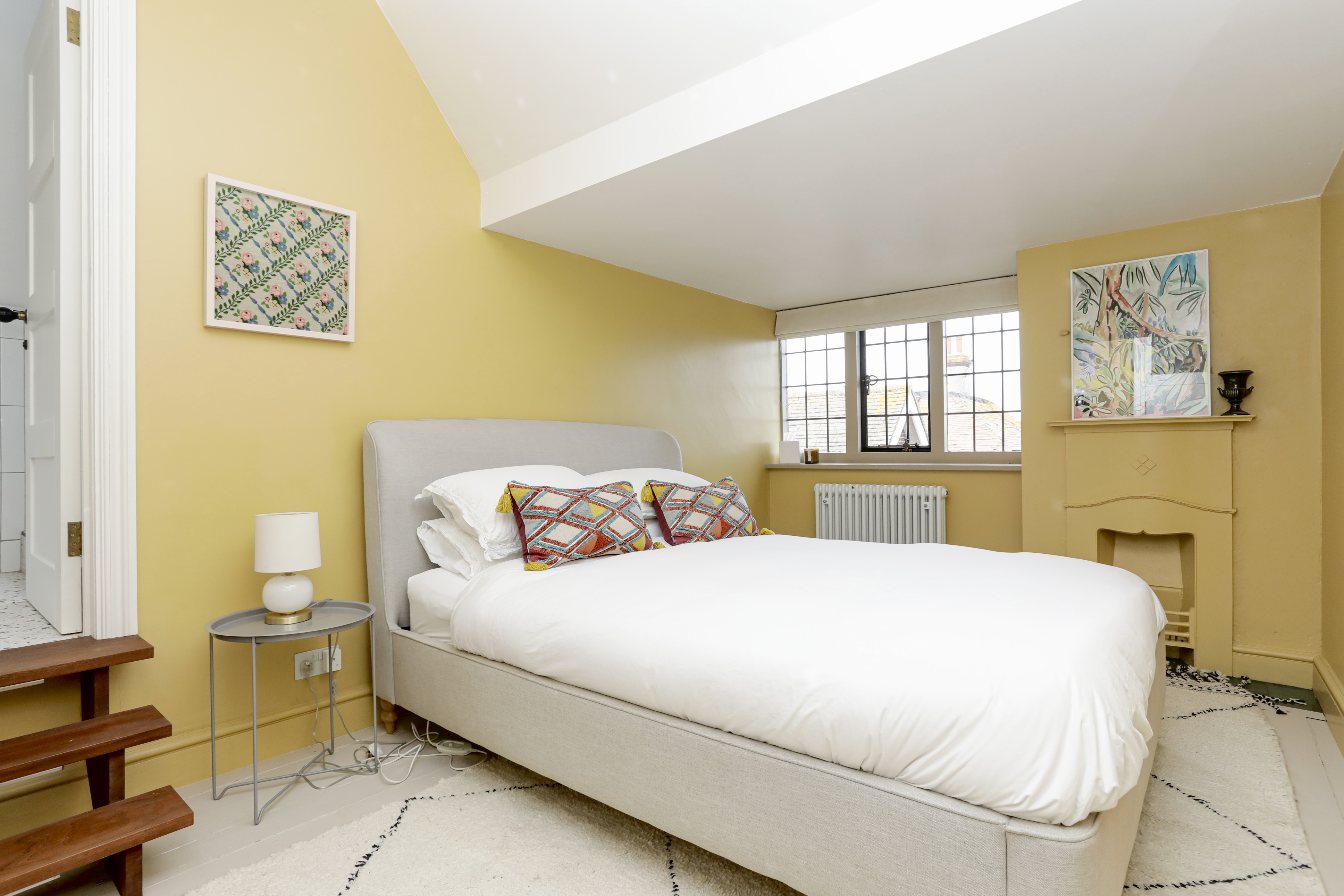 Fifth bedroom with sea views, original fireplace, painted floorboards and ensuite bathroom with large shower, wall hung WC and basin, and two Velux windows onto the rear garden.