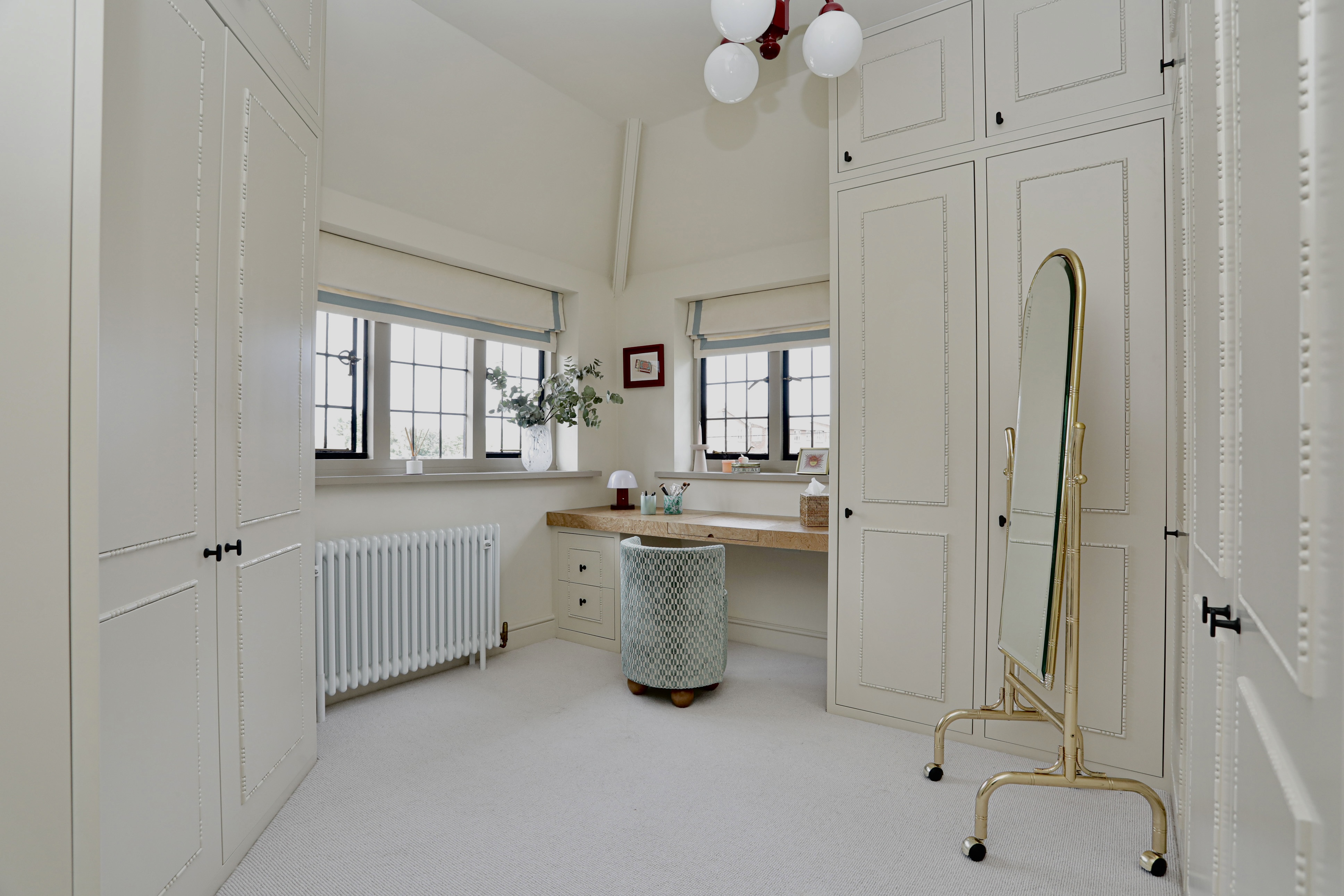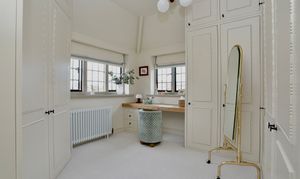 Fourth bedroom used as a walk in wardrobe with range of bespoke built in wardrobes, shoe storage, drawers and dressing table.