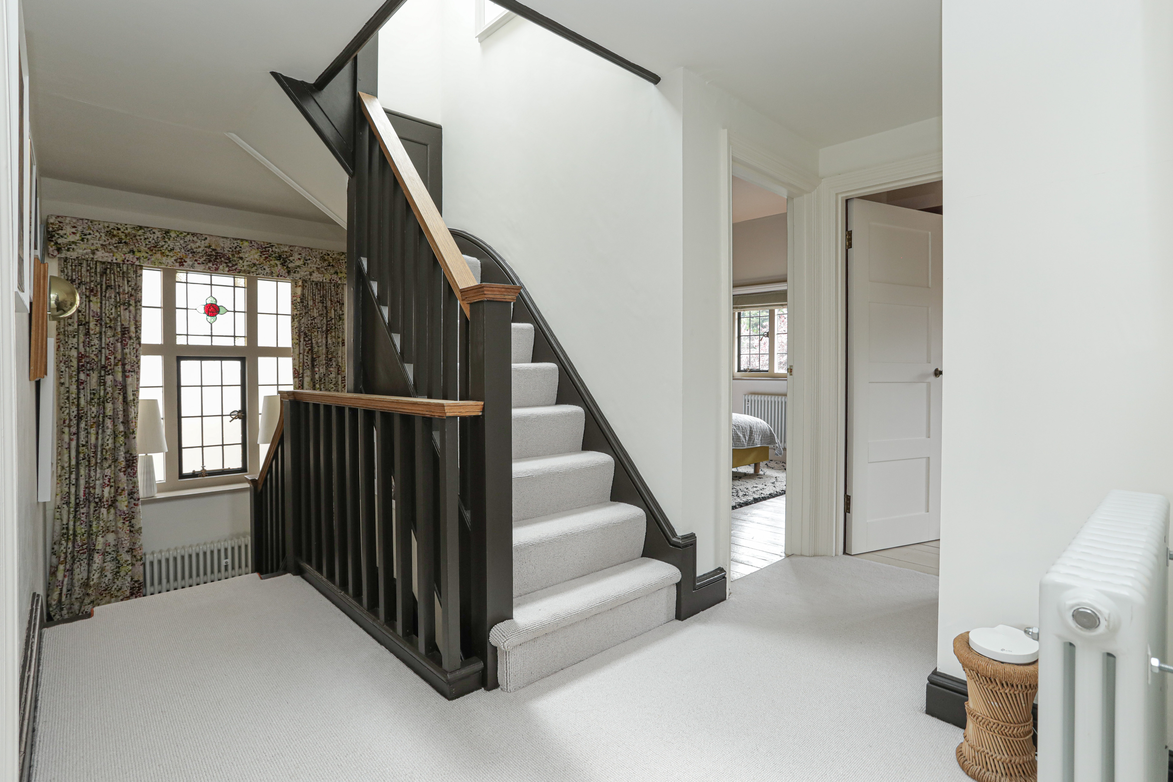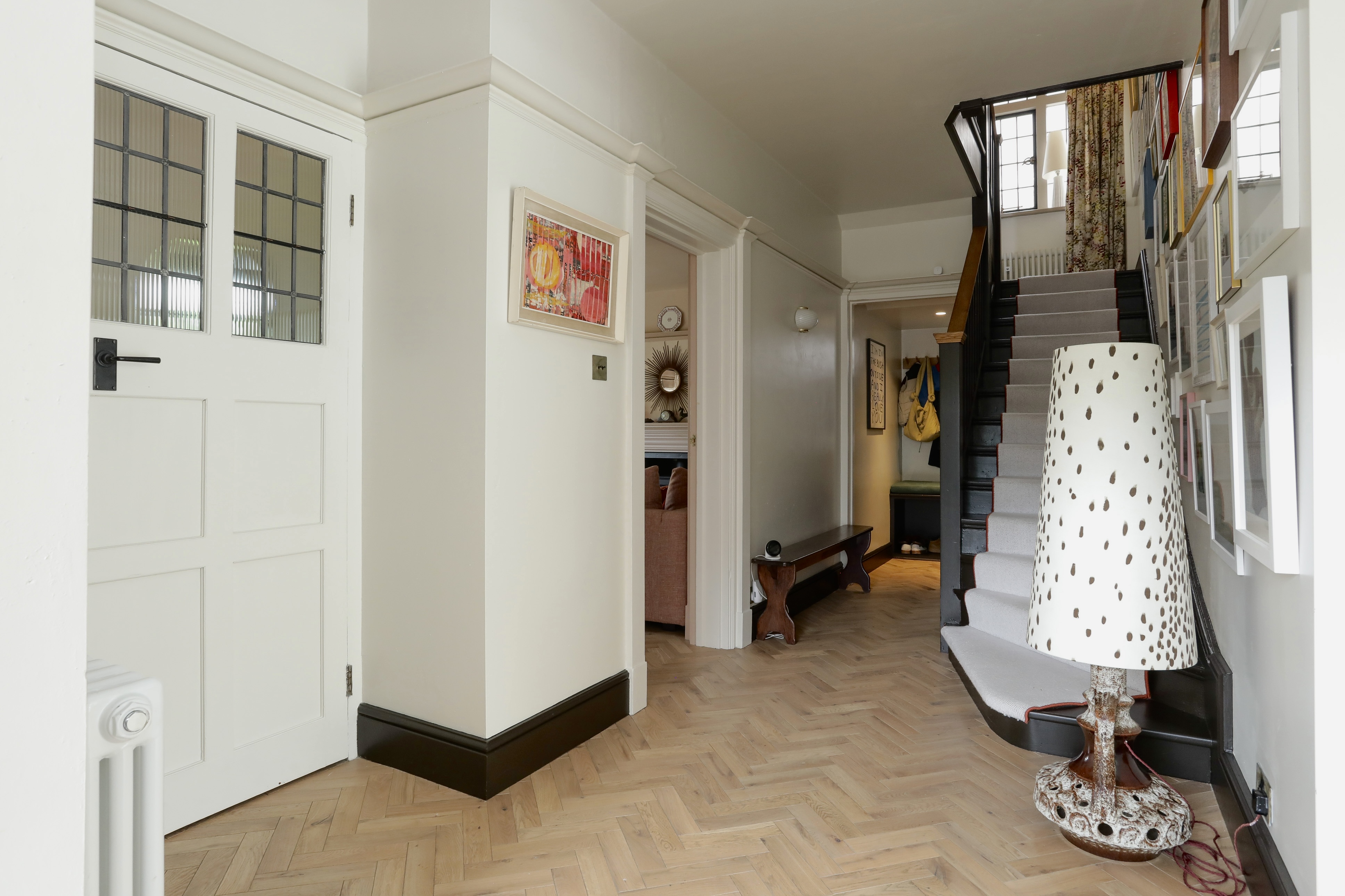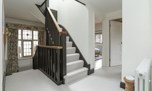 Hallway leads to the staircase to the glazed half landing, and up to the first floor landing. First floor landing has secret linen cupboard.