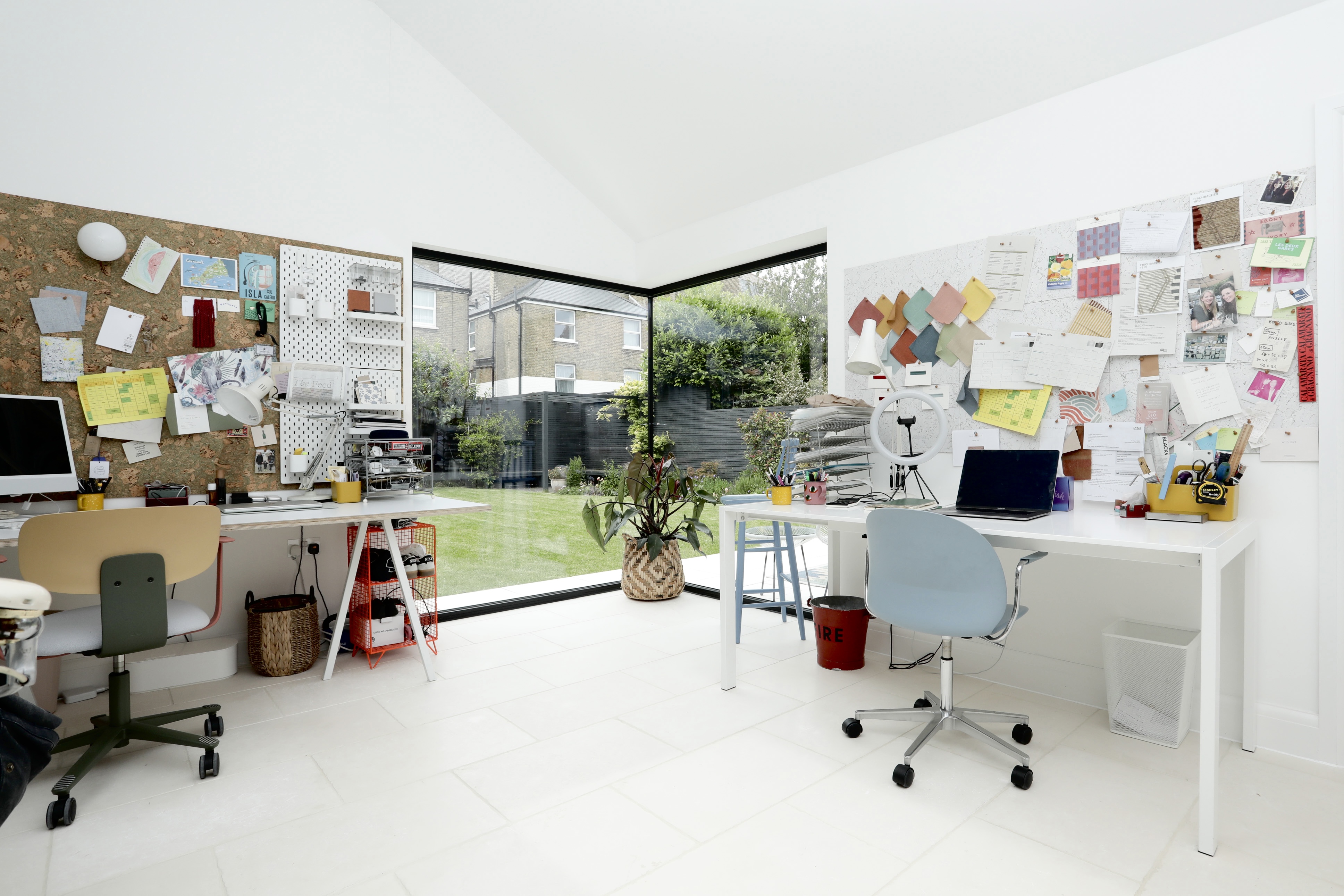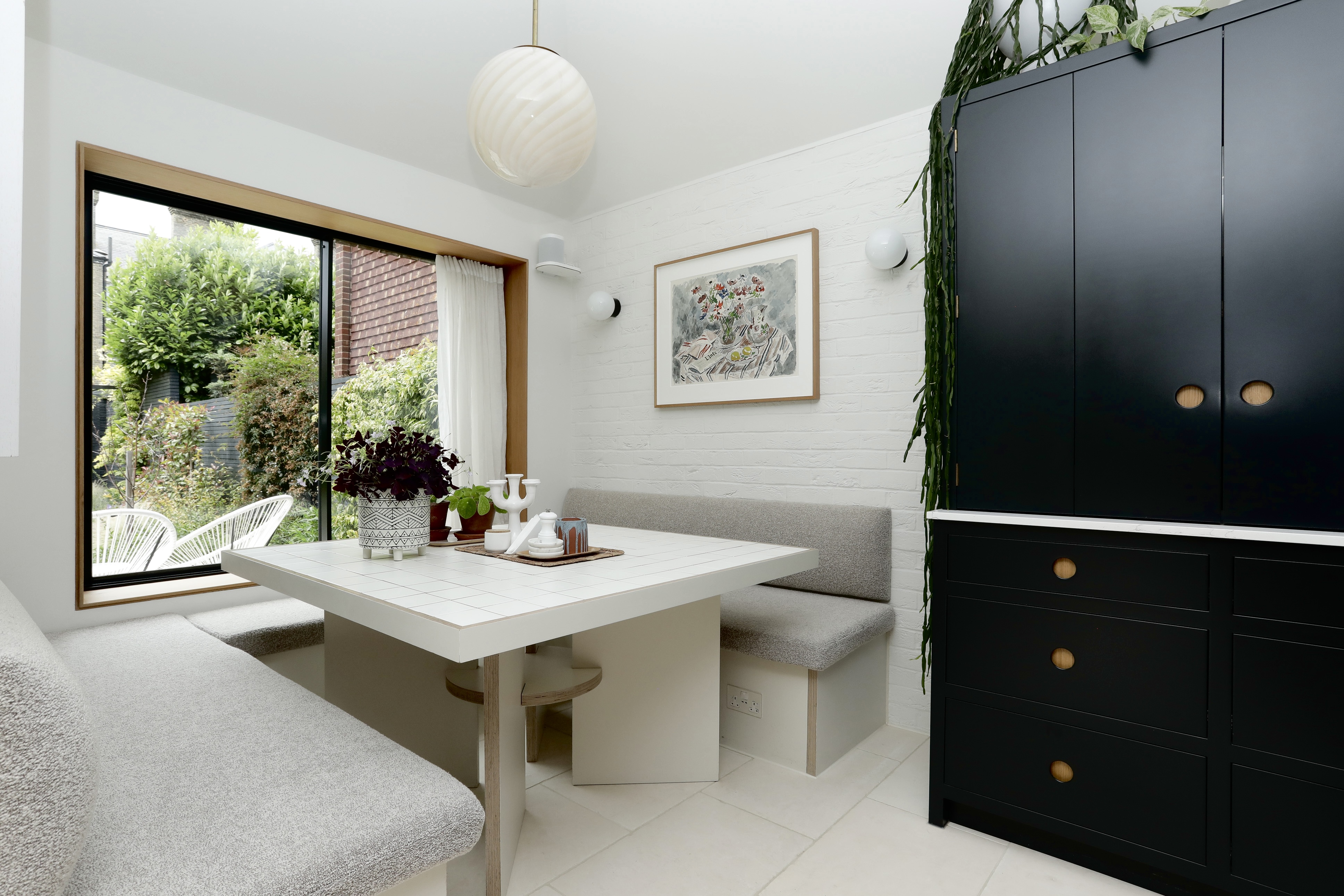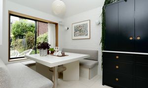 Kitchen diner features French limestone flooring (heated), bespoke handmade kitchen with quartz top, double Neff slide and hide ovens, Quooker boiling tap, BORA Pro 3 hob, hotplate and extractor system, built in larder cupboard for toaster, range of cupboards. Dining nook with built in banquette seating and large sliding oriel window overlooking the garden.