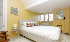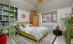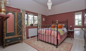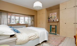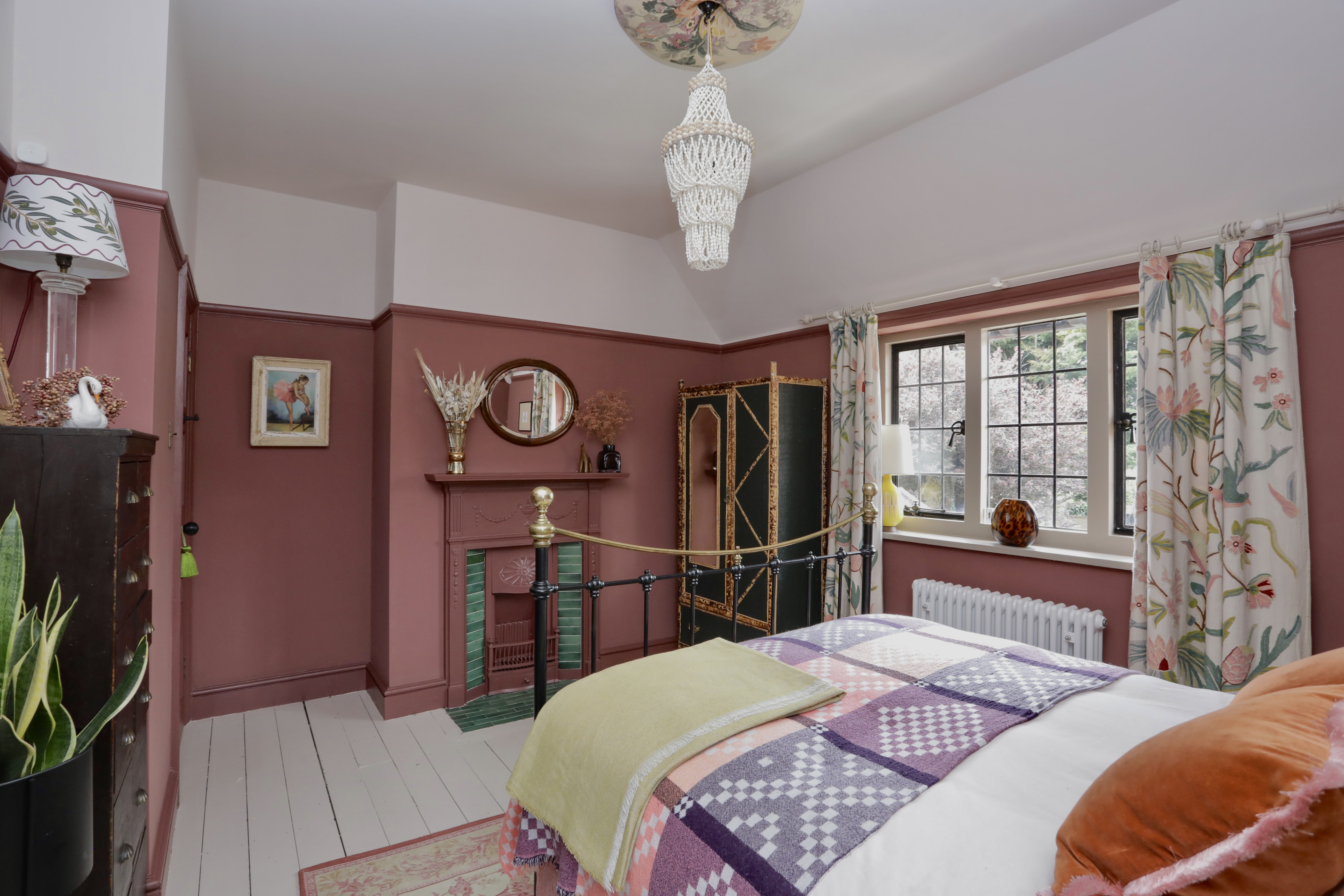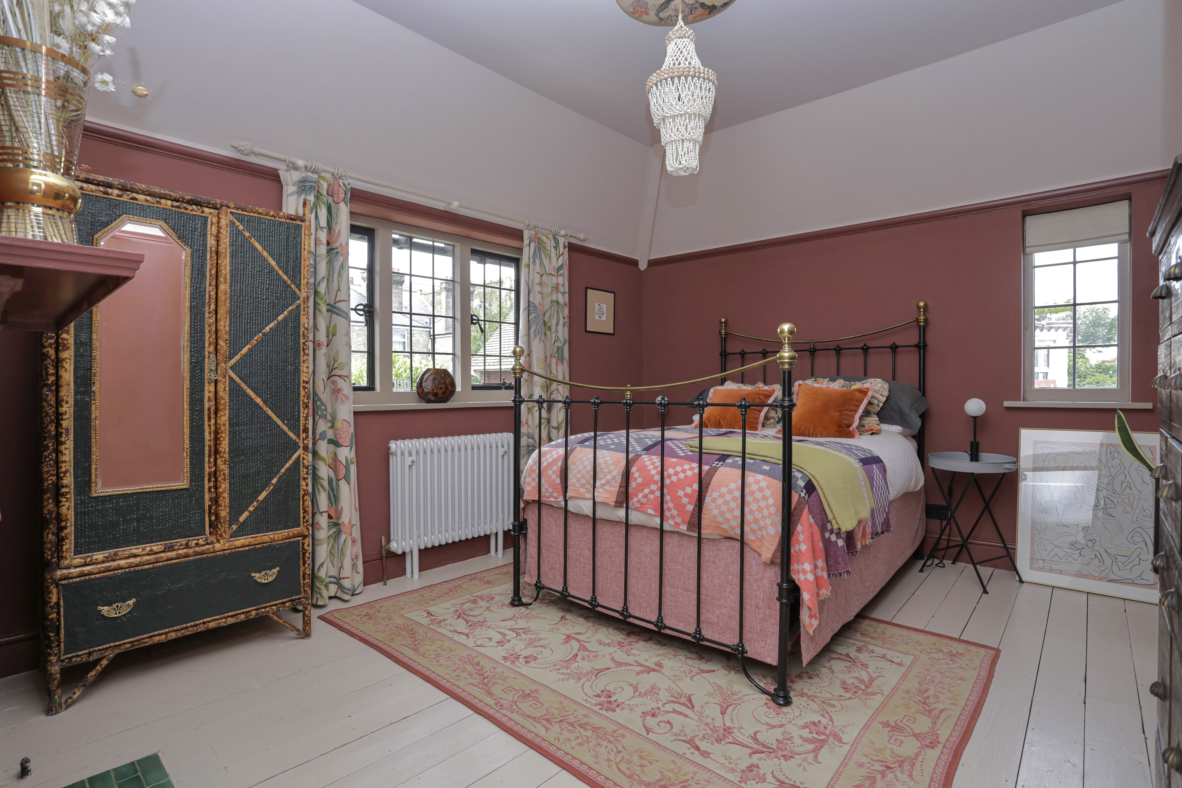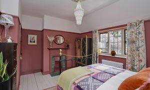 Third bedroom features dual aspect windows overlooking the garden and side of the property, painted floorboards and original fireplace.