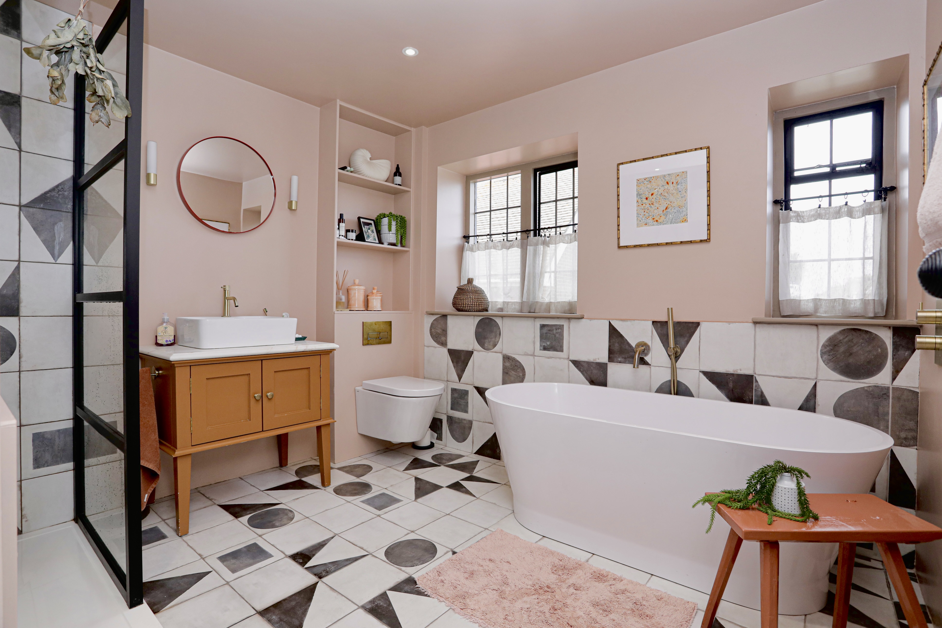 Family bathroom with underfloor heating, freestanding bath, bespoke marble topped vanity unit, shower, wall hung WC and range of bespoke built in cabinetry.