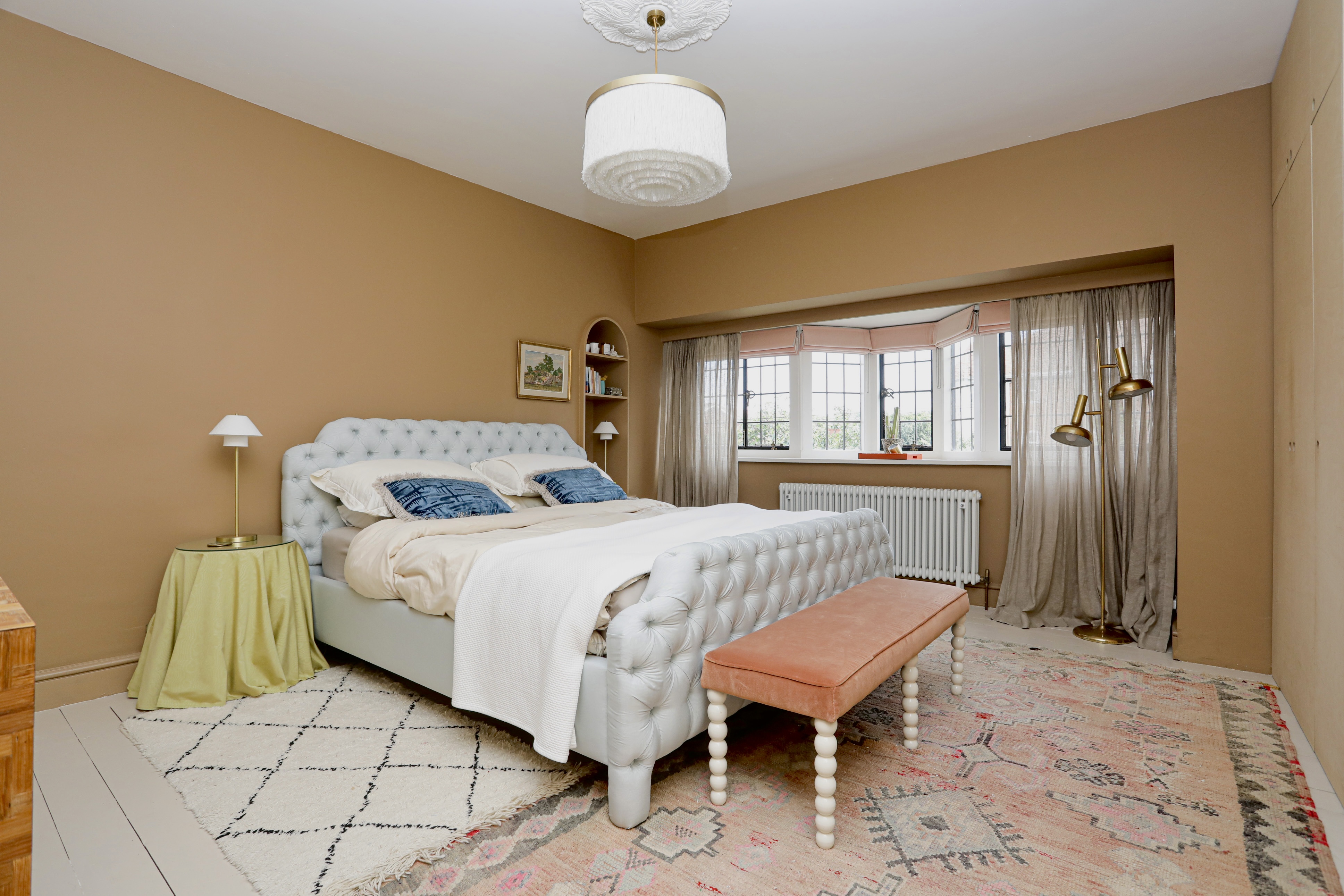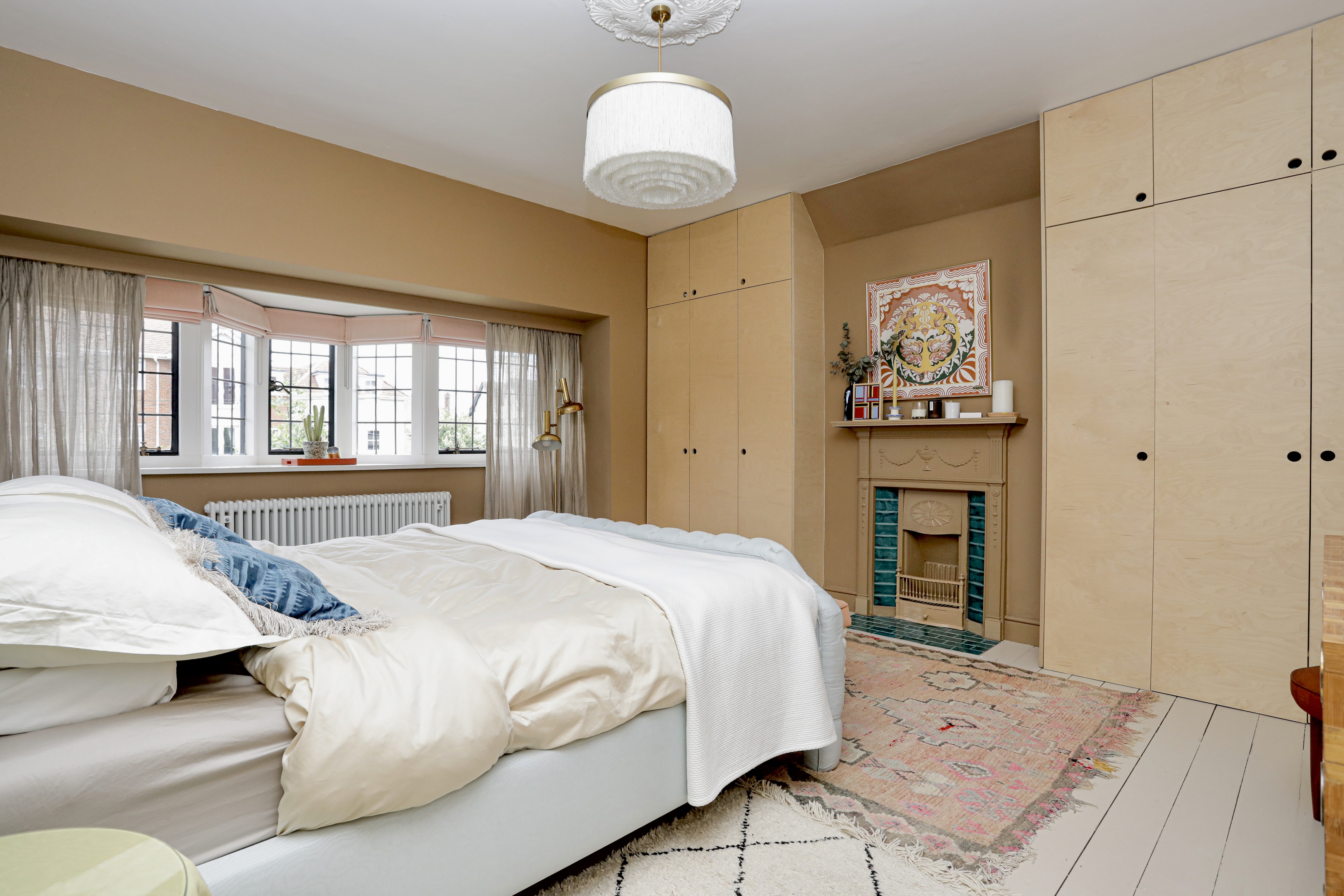 Principal bedroom is large and features the original fireplace, painted floorboards, wall to wall original windows and built in alcove wardrobes.