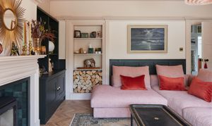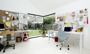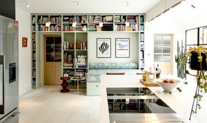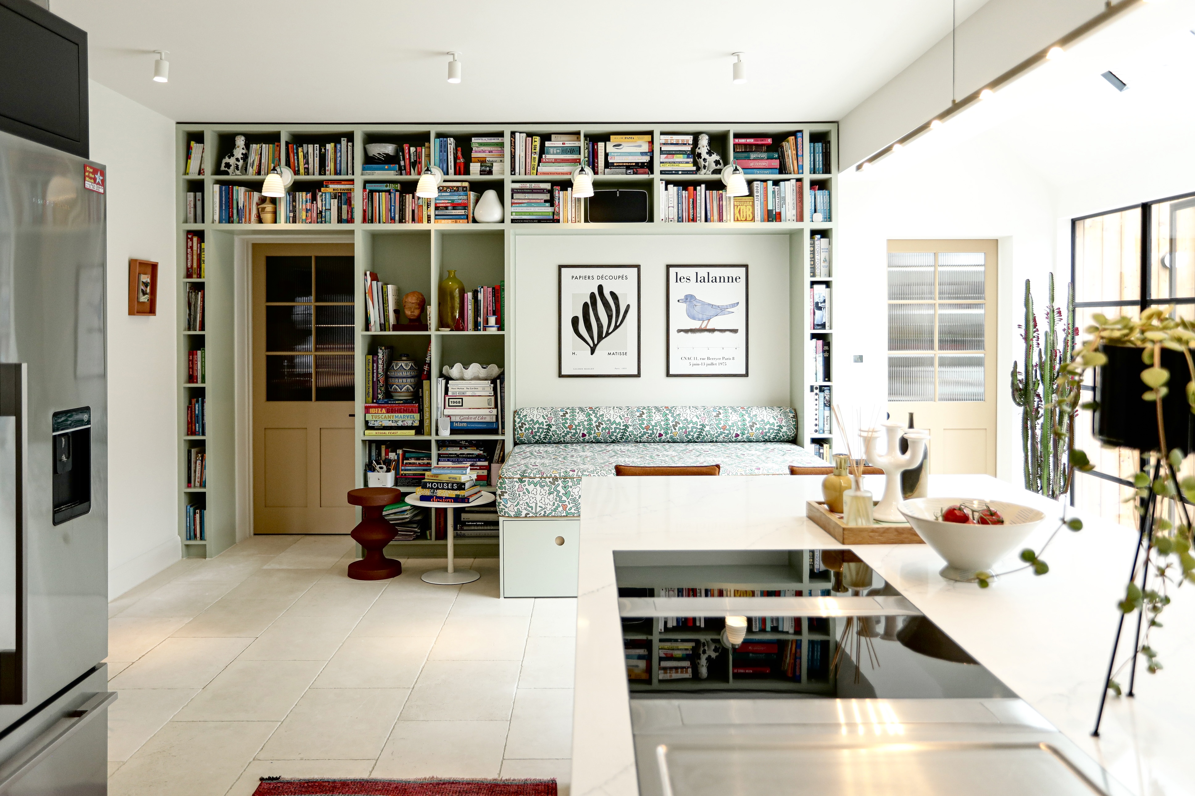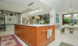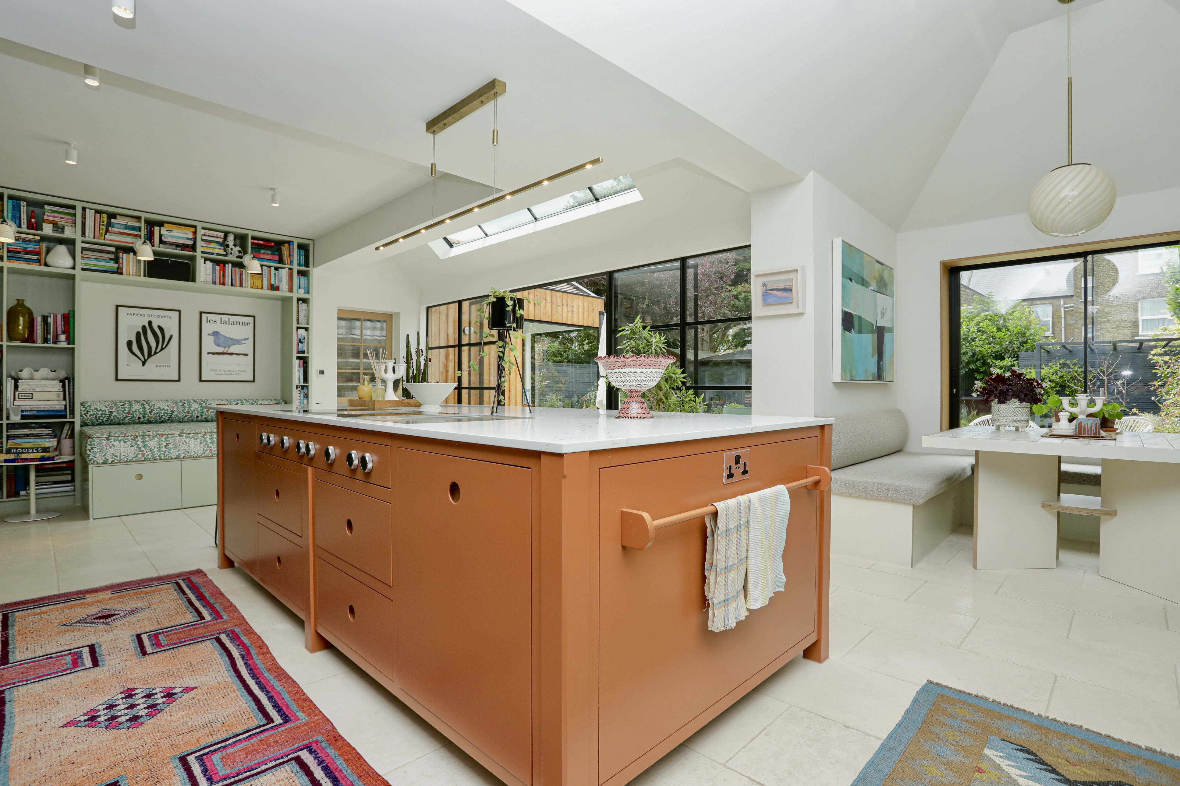 Kitchen diner features hot rolled steel glass doors, structural glazing to roofs, sliding oriel window to dining area, and a vaulted ceiling over part of the kitchen and the dining area as well as large built in bookcase daybed with storage underneath