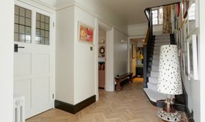 Hallway features solid oak parquet, original plate rails, original windows.