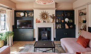 Second bedroom features built in desk and storage area, original fireplace and painted floorboards.