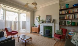 Upon entering through the raised ground floor, you are immediately greeted by a majestic entrance hall, where the soaring 3 meter ceilings create a sense of elegance and space. The rich wooden flooring flows throughout the ground floor, adding warmth and character, while the bright sunlight pouring through the box sash windows fills the rooms with a welcoming atmosphere. The main reception room, with its intricate fireplace, is a perfect place to relax or entertain, while large windows frame the stunning sea views looking down Sweyn Road, adding a sense of serenity and charm to the space. Adjacent to this, the dining room is an inviting space, enhanced by original touches like vintage wallpaper and custom-built cabinetry, which give the home its distinctive personality. The kitchen is a beautifully crafted space with bespoke woodwork and a fitted bench that serves as a central hub for family gatherings and casual meals.