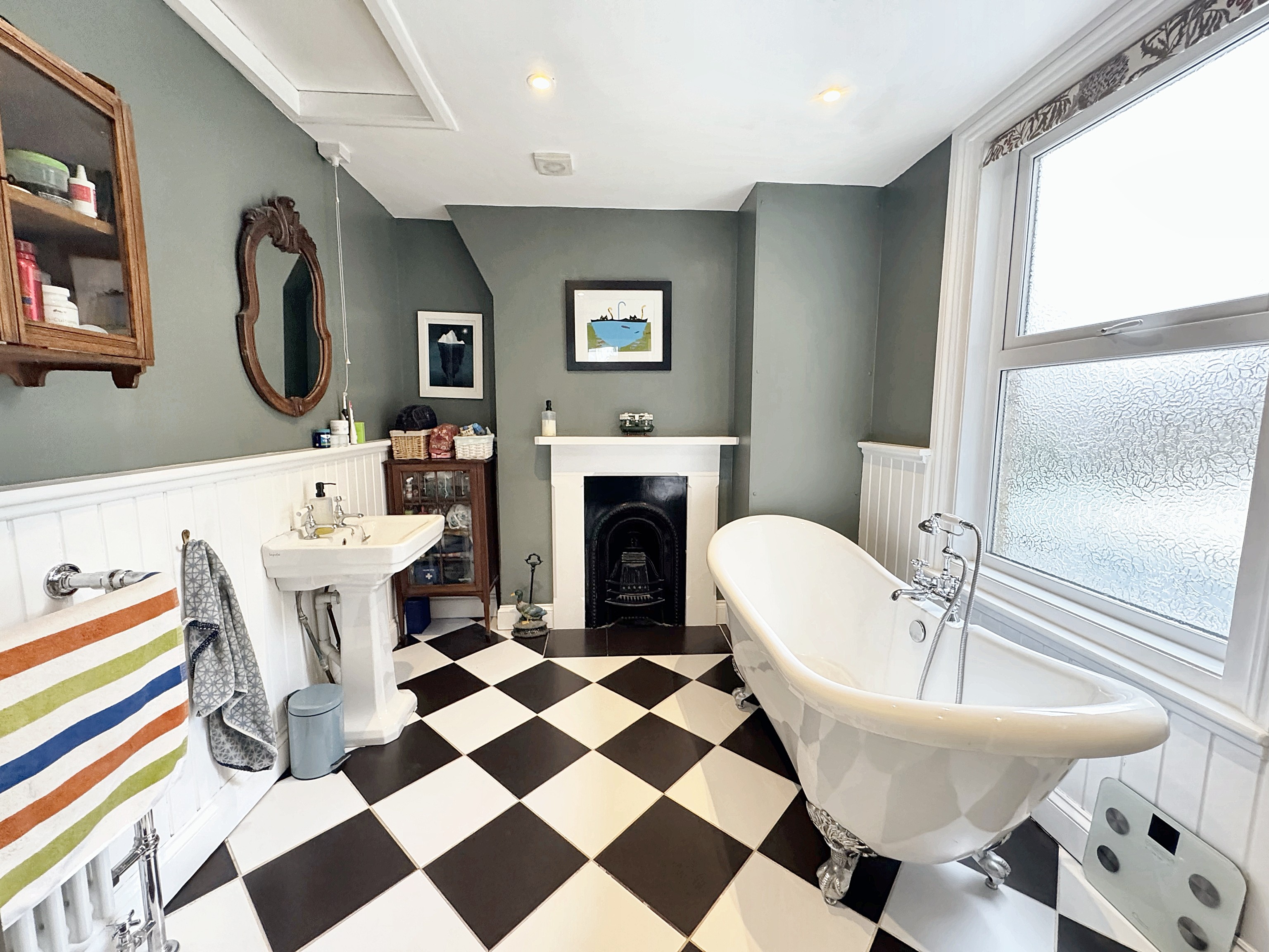 - On the first floor there are two bedrooms and the family bathroom with a stunning roll top bath