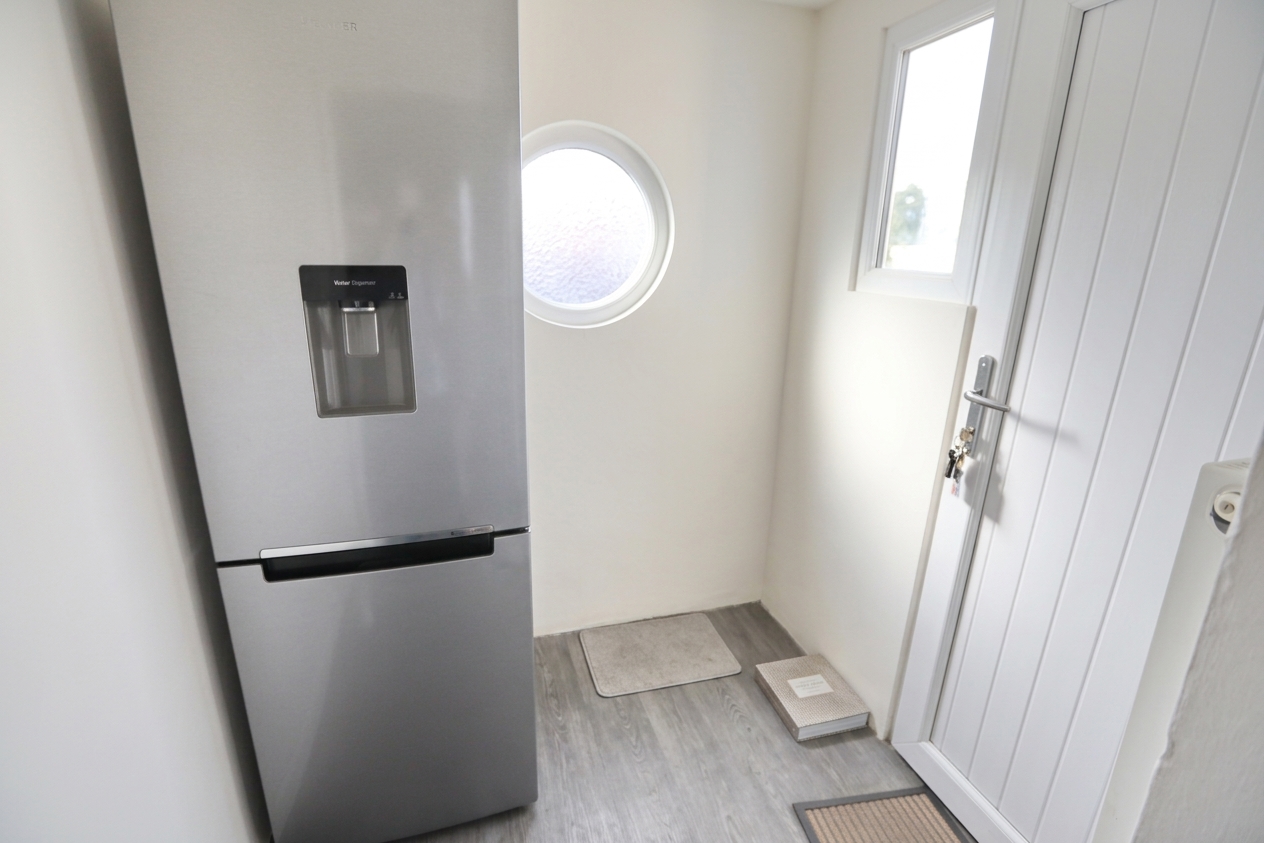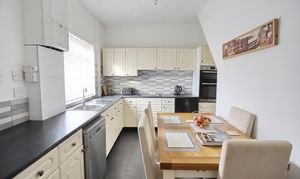 The entrance vestibule leads into the spacious lounge with ample room for sofas and further furniture, fitted cupboards to either side of the chimney breast and carpeted flooring. The dining kitchen is fitted with wall/base units and work surfaces, integrated double oven and hob, space for appliances, attractive flooring and this leads into the utility/storage room with rear door access.