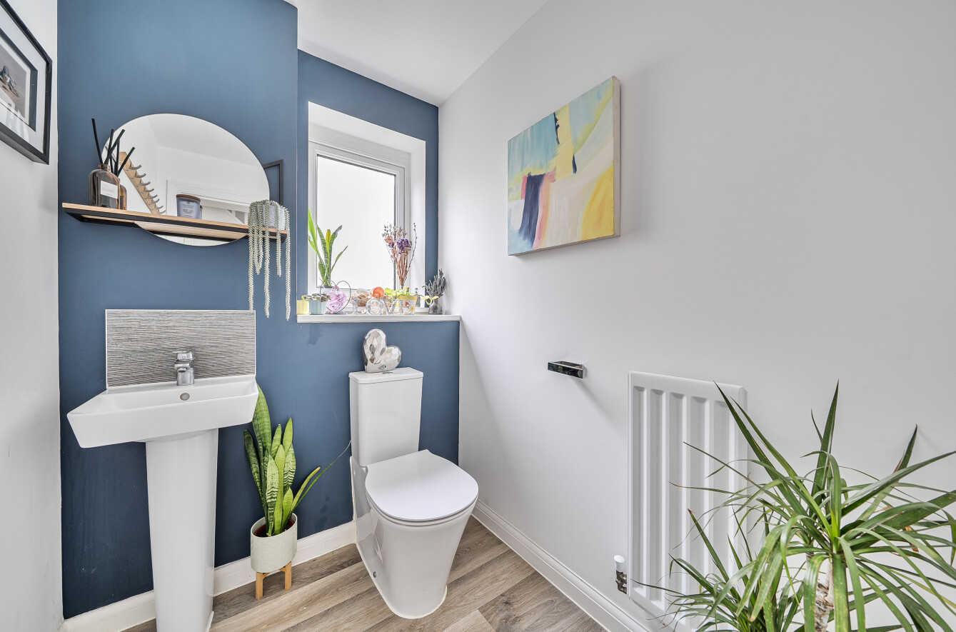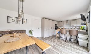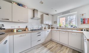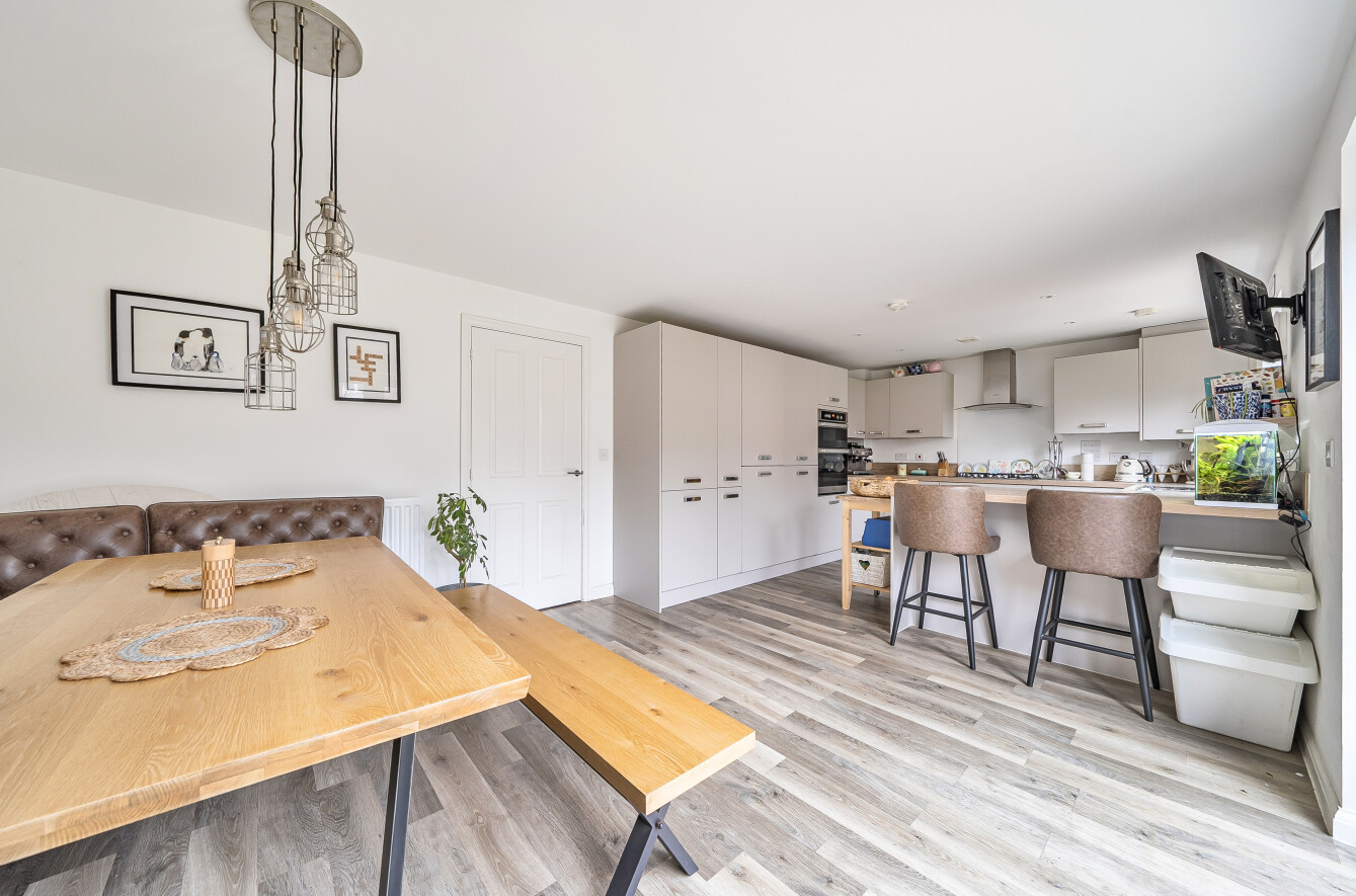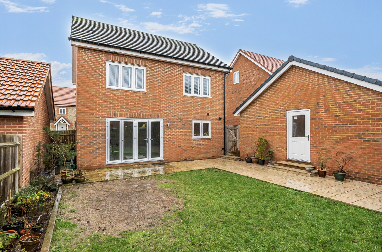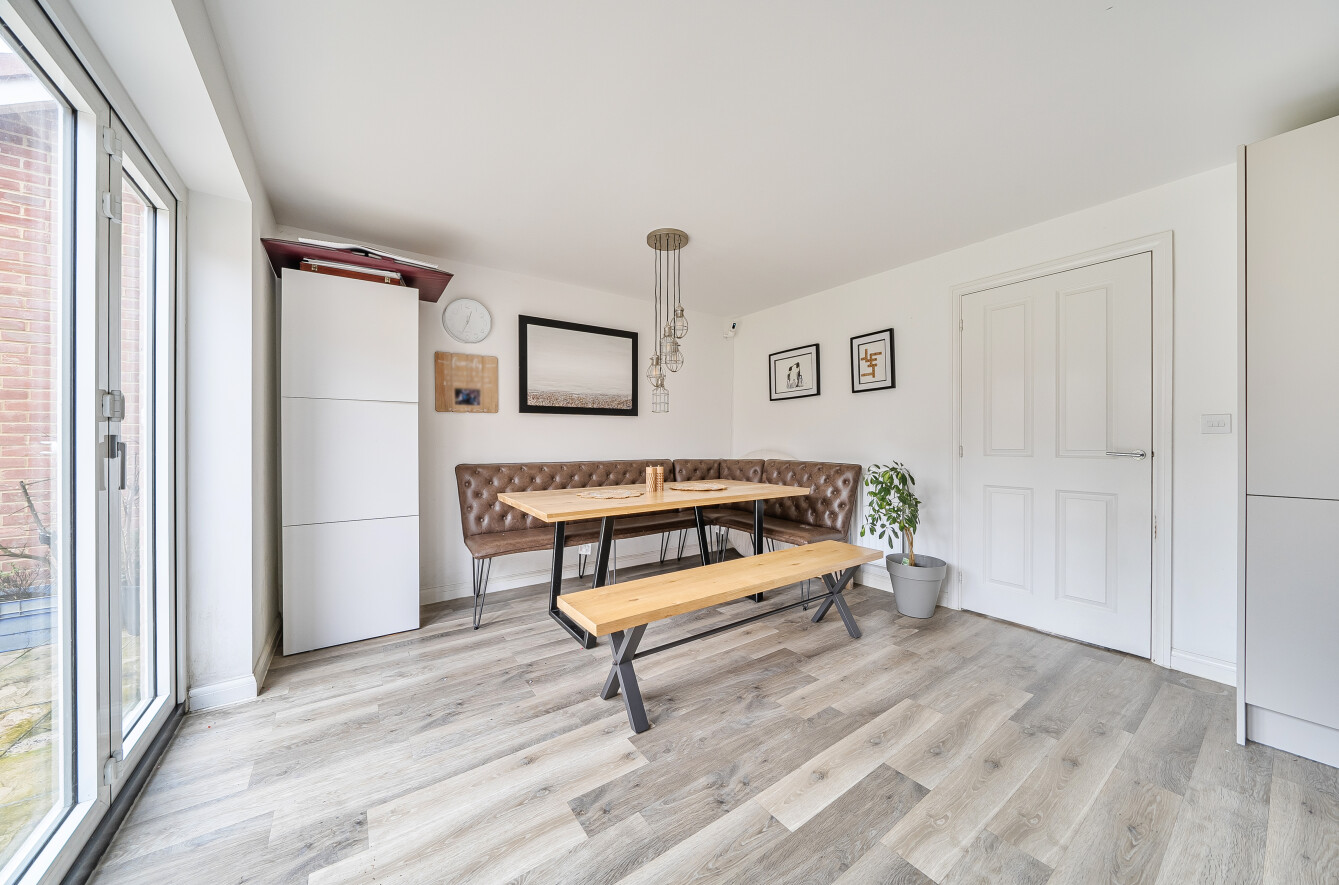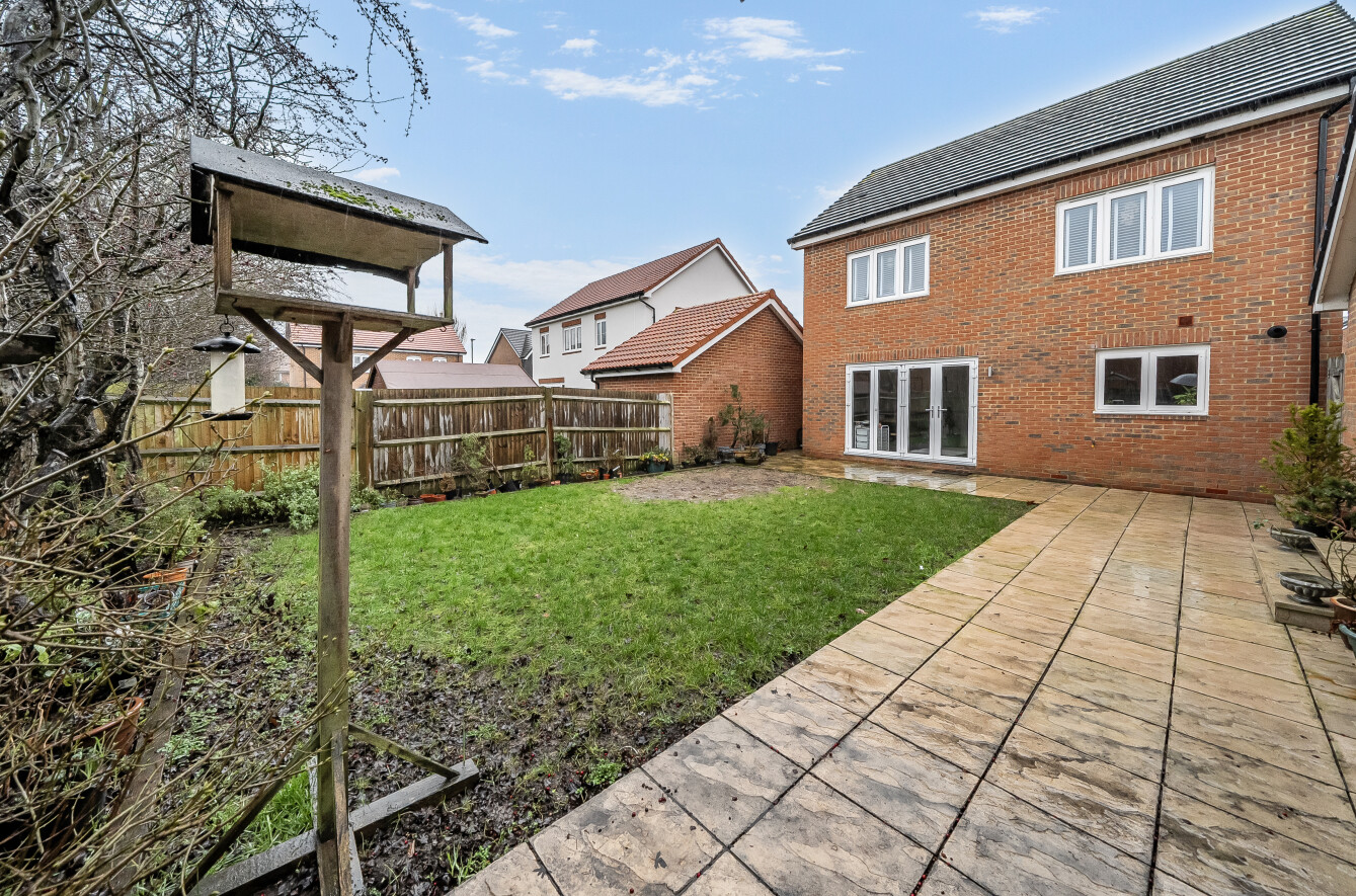 The accommodation begins with a welcoming entrance hall and cloakroom. A bright dual-aspect sitting room provides an excellent family living space, while the spacious kitchen/family room forms the heart of the home. Bi-folding doors from the dining area open directly onto the rear garden, creating a seamless indoor–outdoor feel. The kitchen is well appointed with integrated appliances including an electric oven, gas hob with cooker hood, fridge, freezer, dishwasher and washing machine. A study completes the ground floor accommodation. To the first floor are four bedrooms and a modern family bathroom. The principal bedroom features built-in mirror-fronted wardrobes and an en-suite shower room.