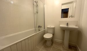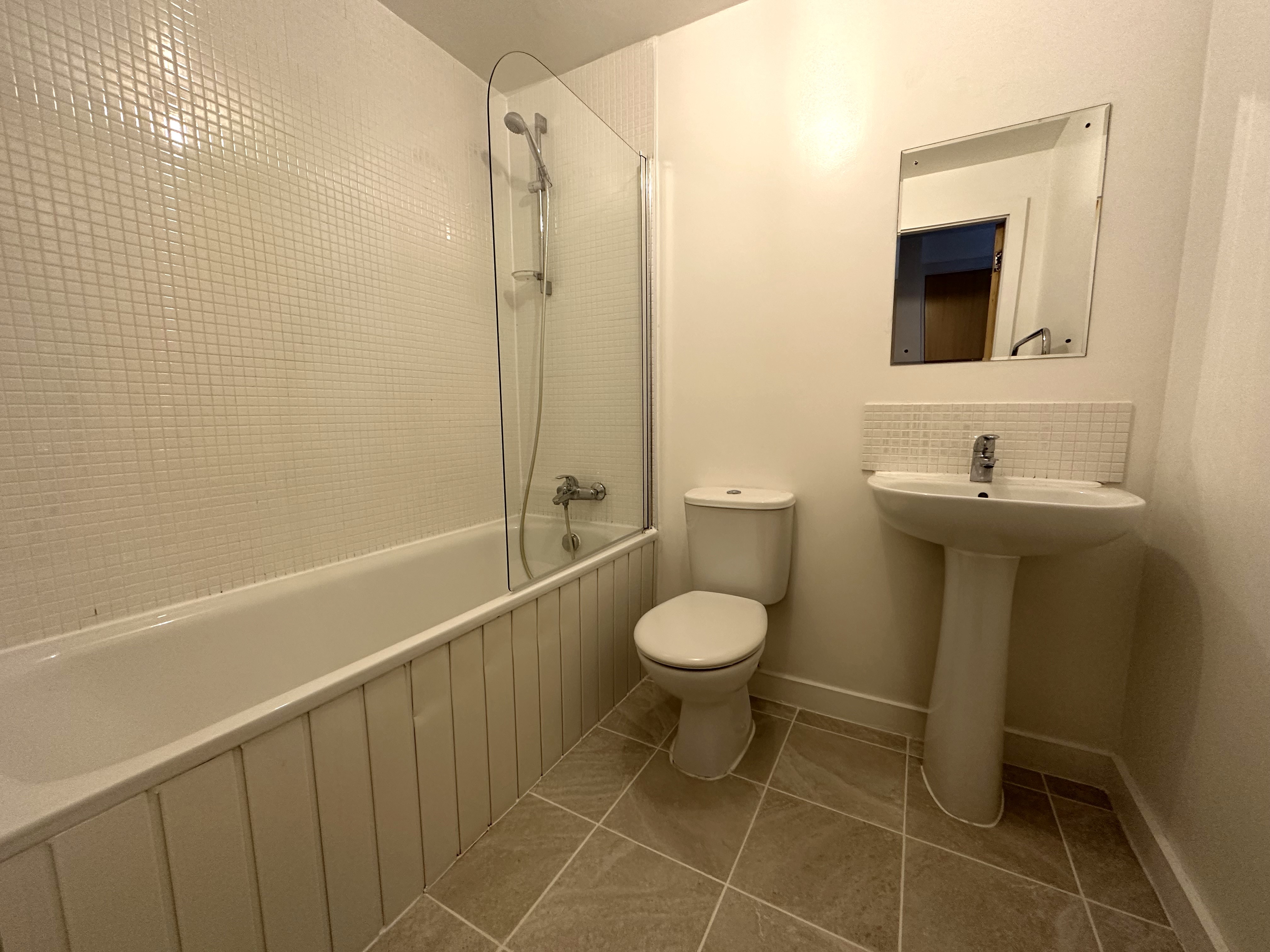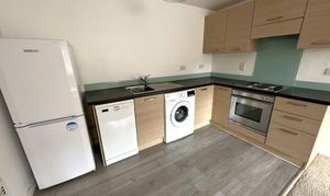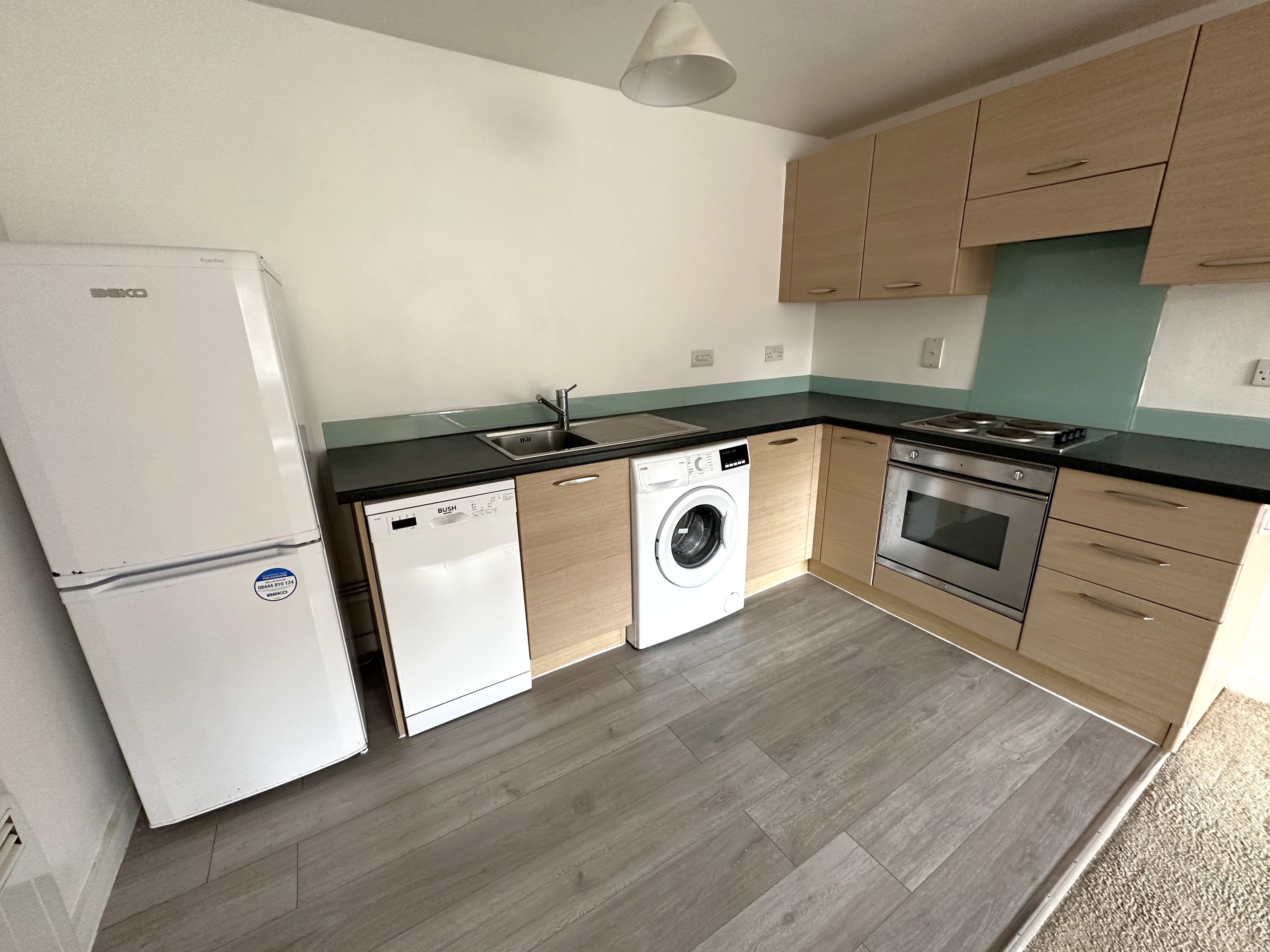 The property briefly comprises of an entrance hallway with storage cupboard, open plan living room and kitchen, including high quality appliances such as a fridge/freezer, washing machine, dishwasher, and an electric oven with hob and overhead extractor fan. The two bedrooms are nicely sized, one is a double and the other is a single, and both have some wardrobe space provided. Finally, there is the bathroom which has a modern white bathroom suite, including toilet, sink, and bath with overhead shower.