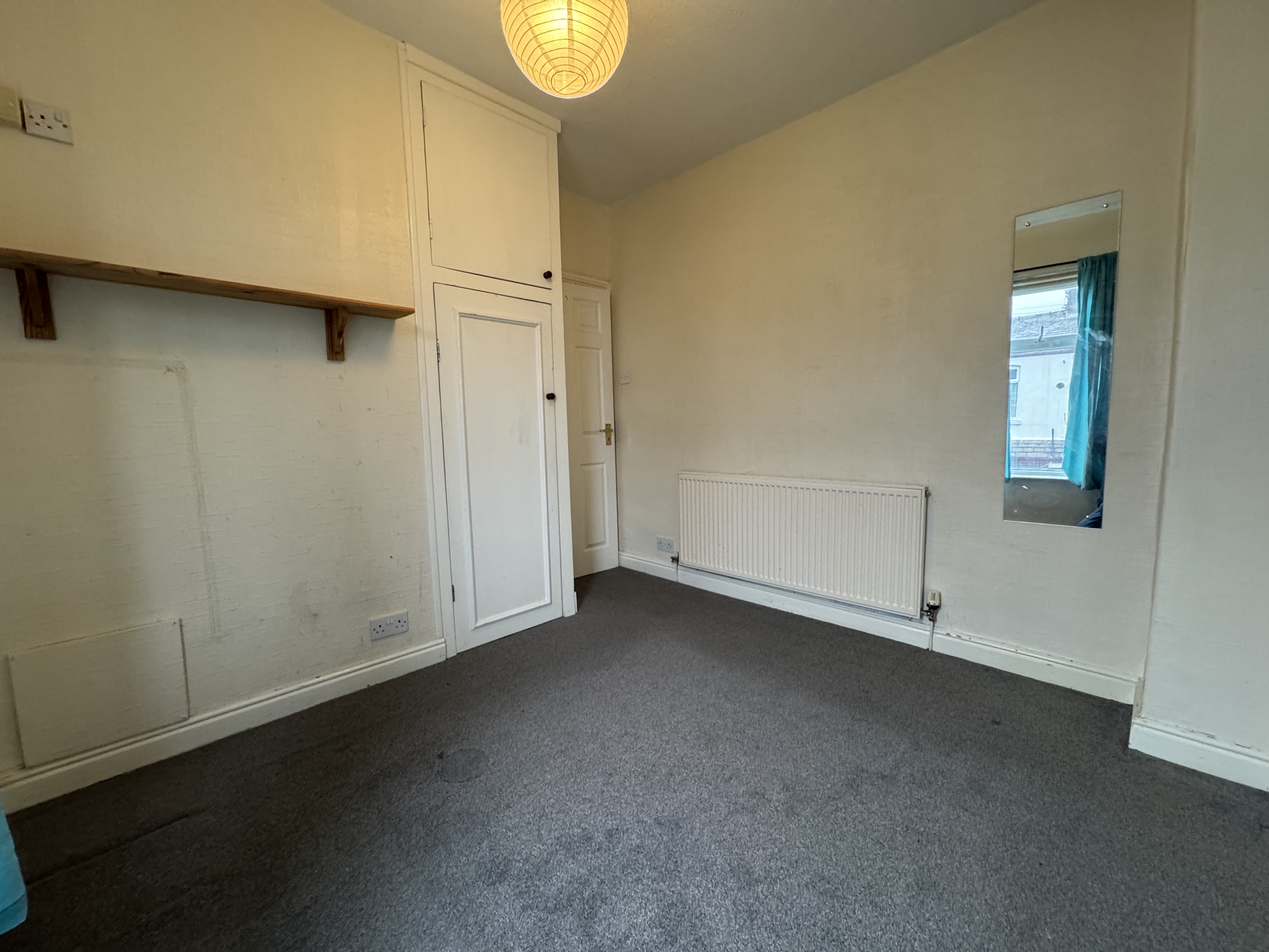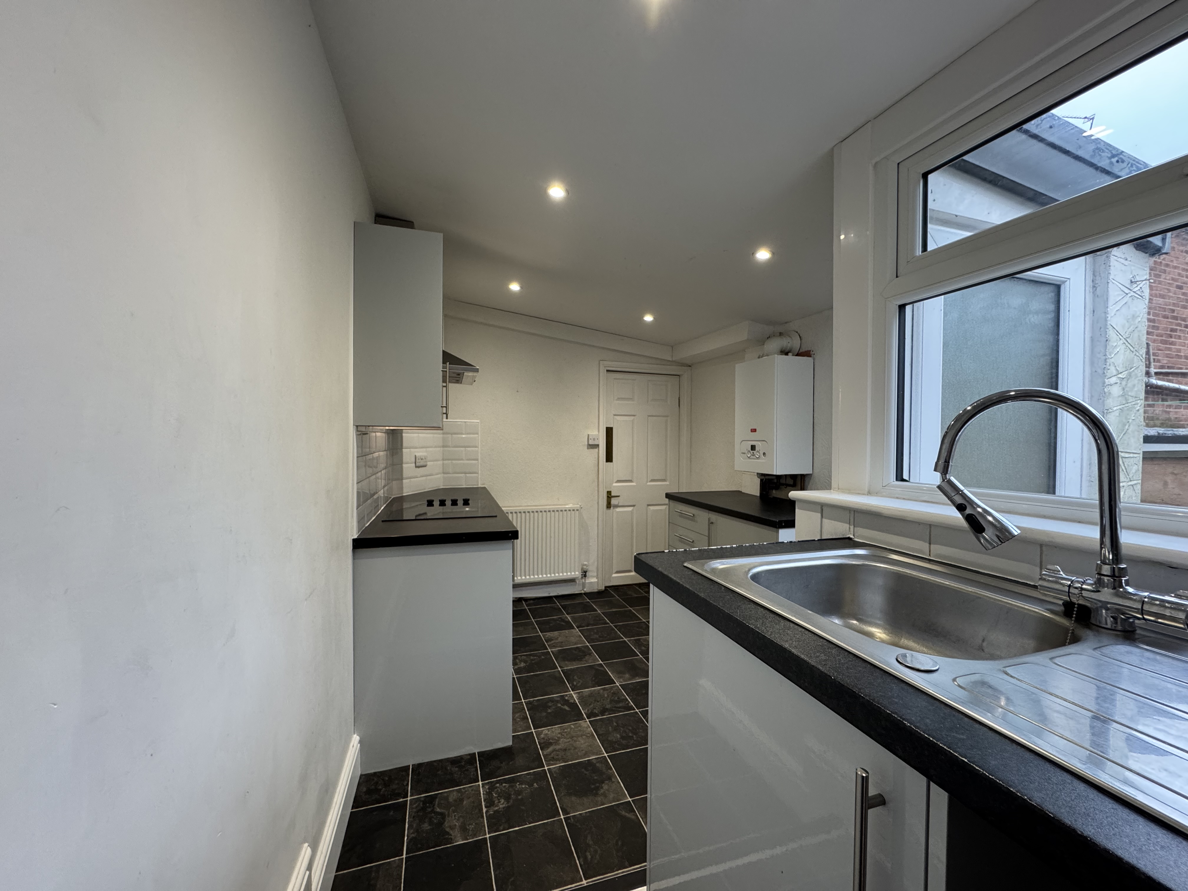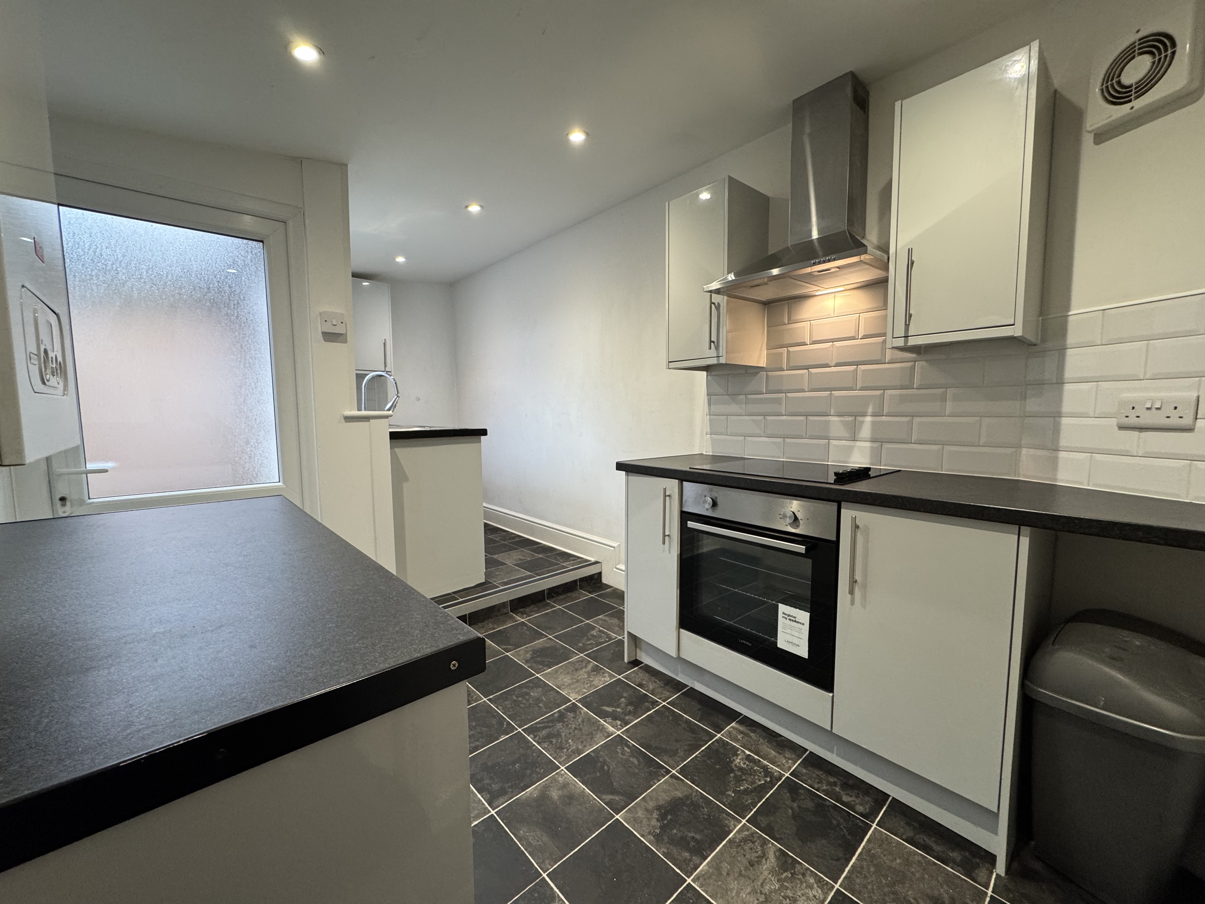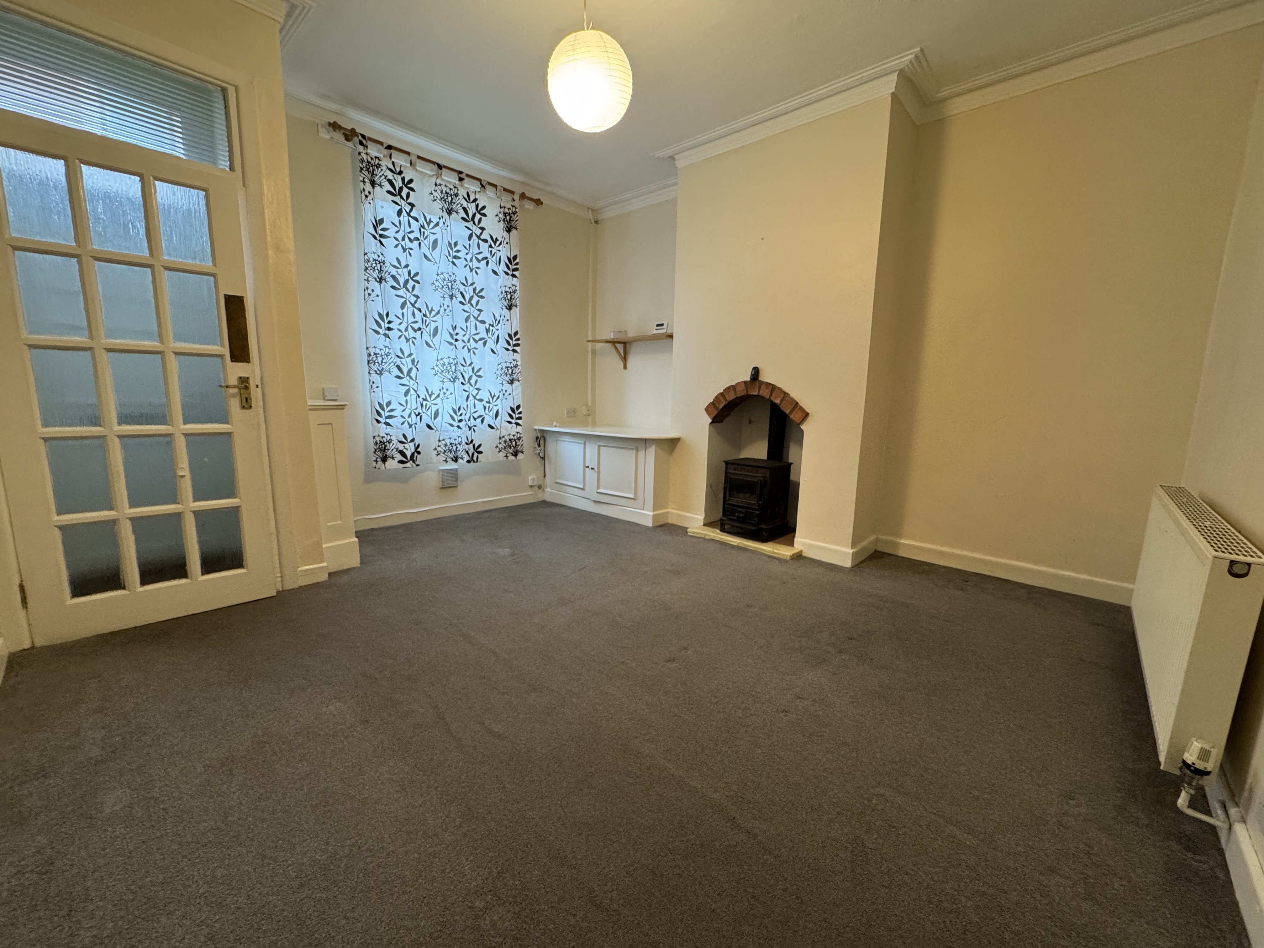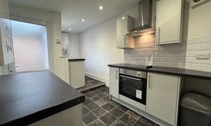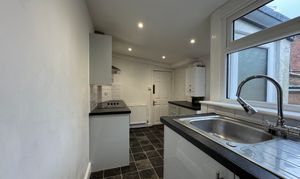 As you enter the property, you will find yourself in a small entrance vestibule which leads through to the first of the two reception rooms. This room has some cupboard space, and a fire in the centre of the main wall, it also gives access to the second reception room and subsequently the kitchen which is at the back of the house. The second reception room houses the stairs with a storage cupboard underneath, and is ideal for a dining room as it leads through to the kitchen. The kitchen is spread across two levels and provides plenty of cupboard and counter space, as well as a sink and hobs with oven and overhead extractor fan. There’s also space for appliances under the sink and countertop to the right of the door.