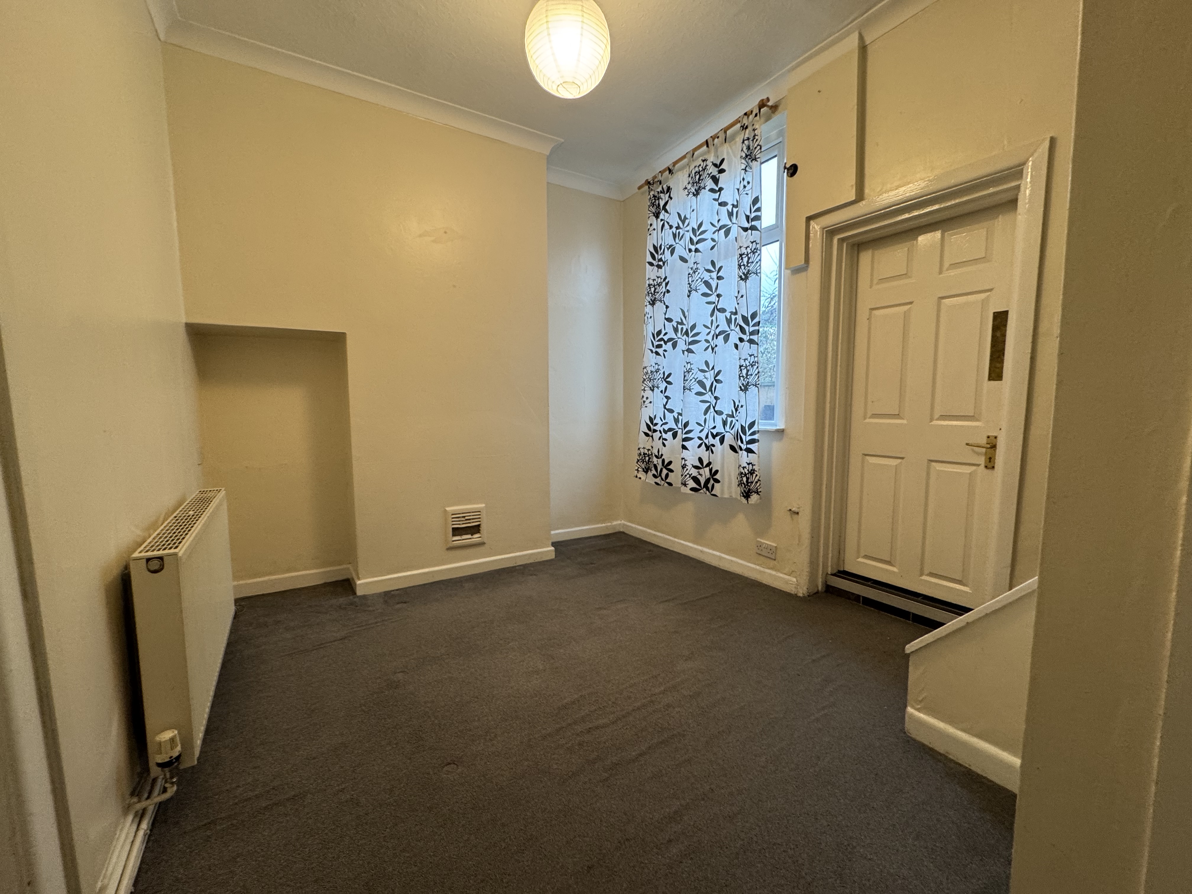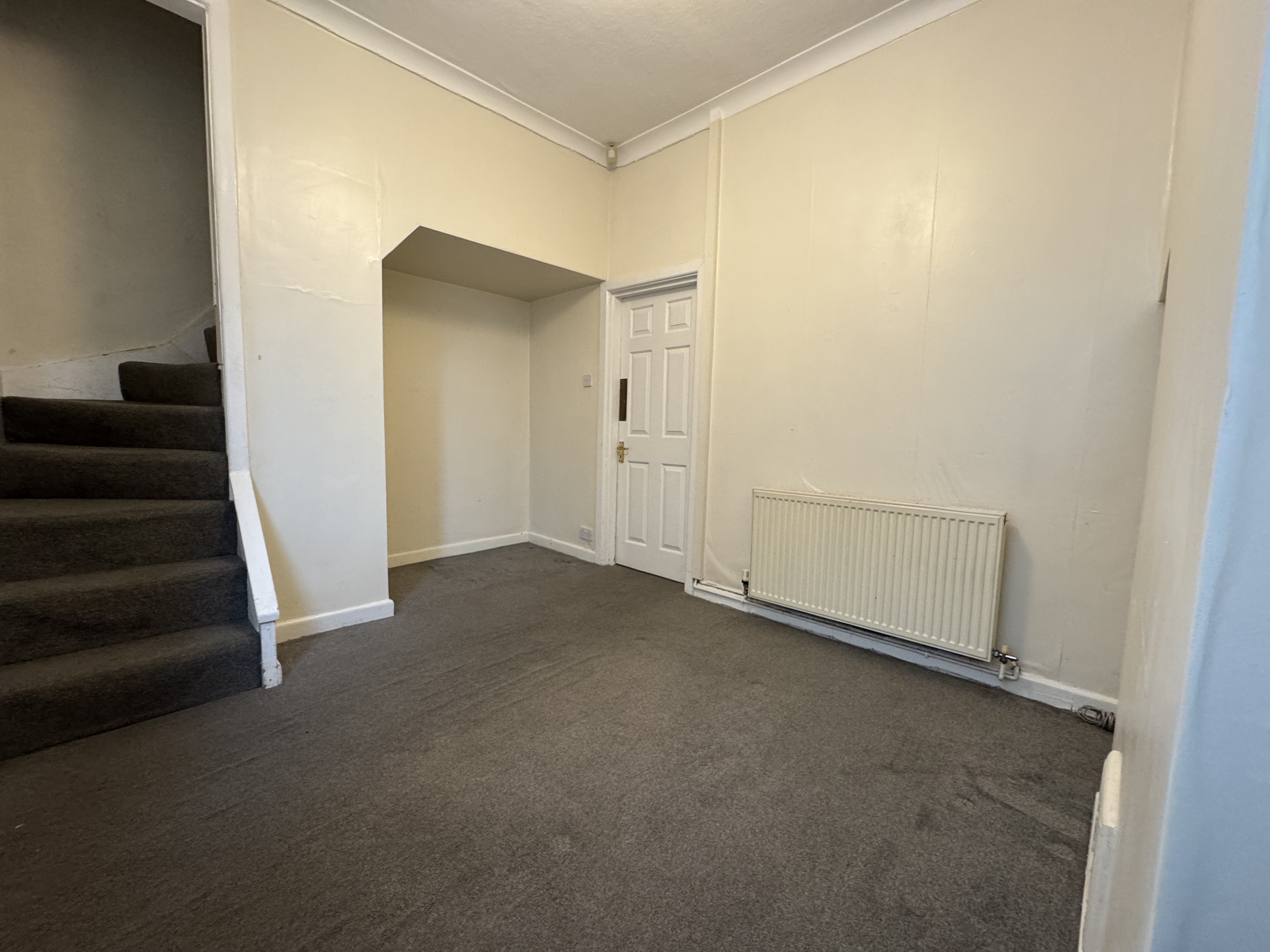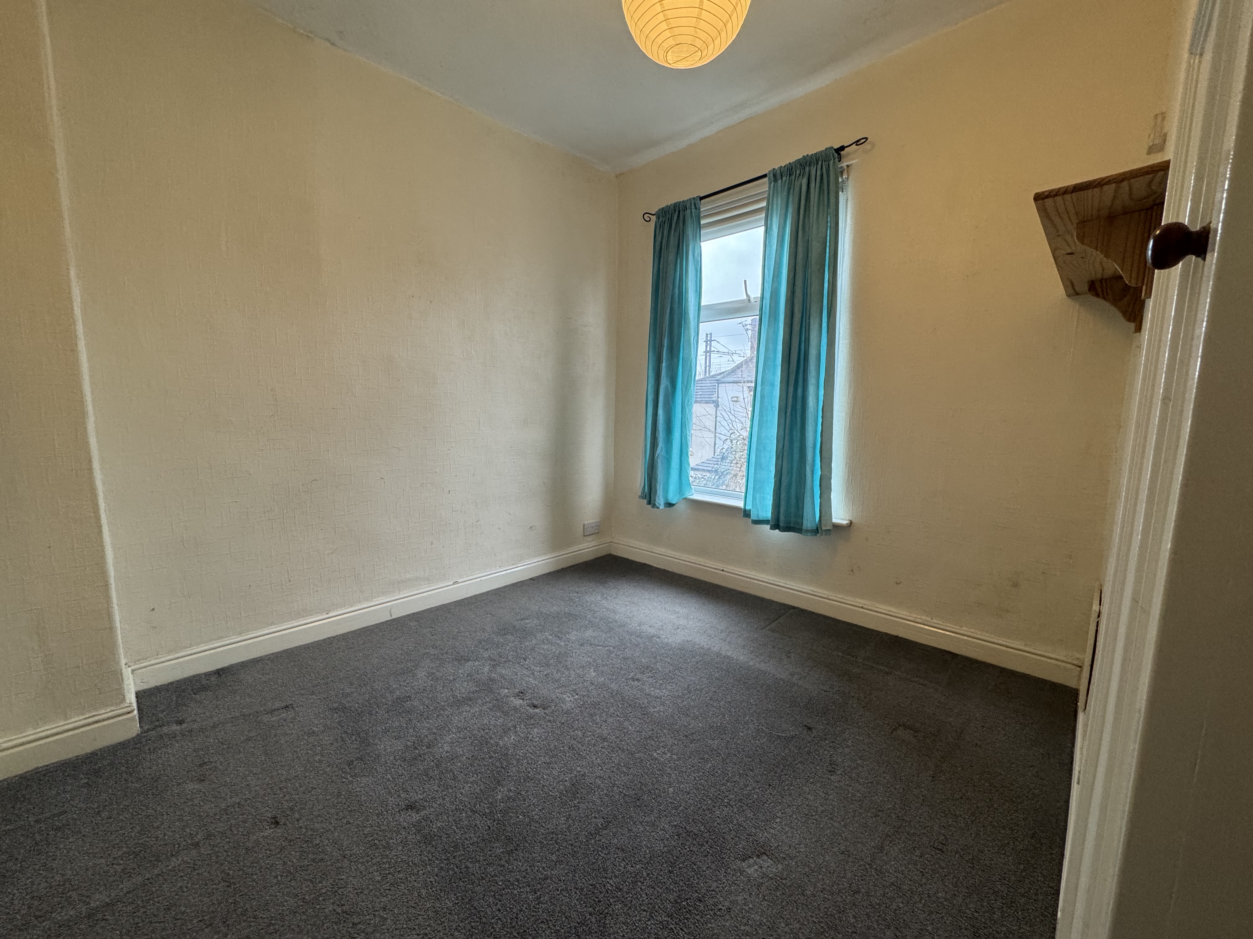 As you enter the property, you will find yourself in a small entrance vestibule which leads through to the first of the two reception rooms. This room has some cupboard space, and a fire in the centre of the main wall, it also gives access to the second reception room and subsequently the kitchen which is at the back of the house. The second reception room houses the stairs with a storage cupboard underneath, and is ideal for a dining room as it leads through to the kitchen. The kitchen is spread across two levels and provides plenty of cupboard and counter space, as well as a sink and hobs with oven and overhead extractor fan. There’s also space for appliances under the sink and countertop to the right of the door.