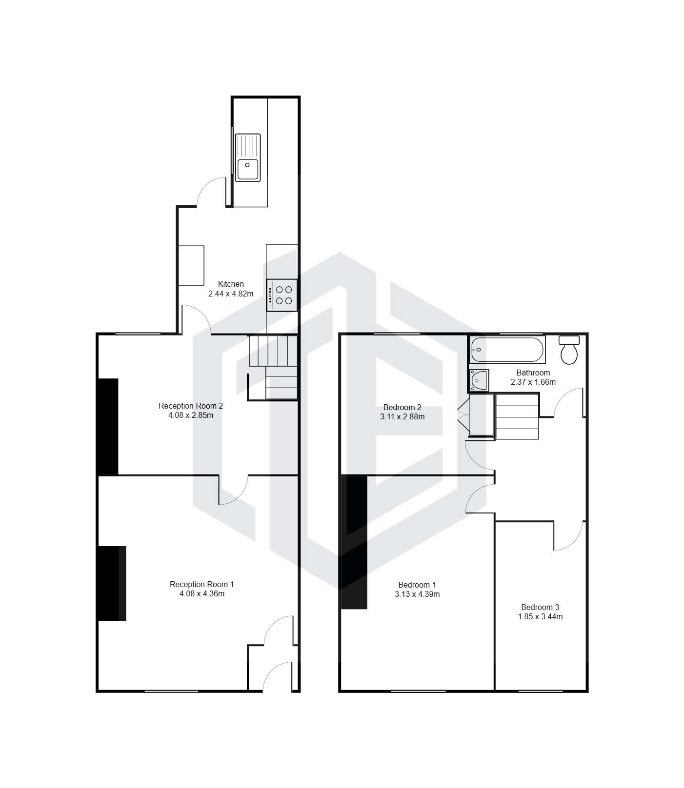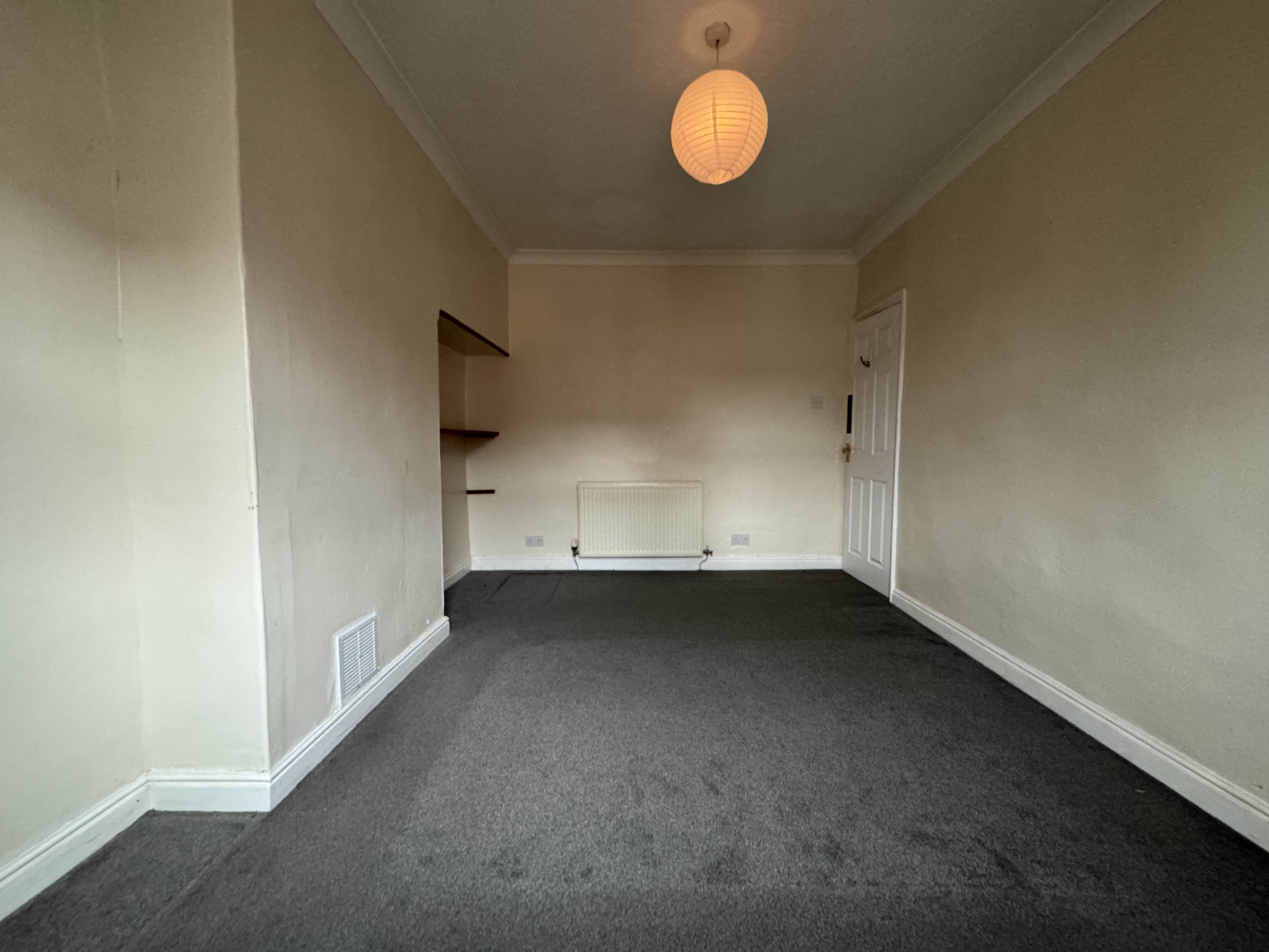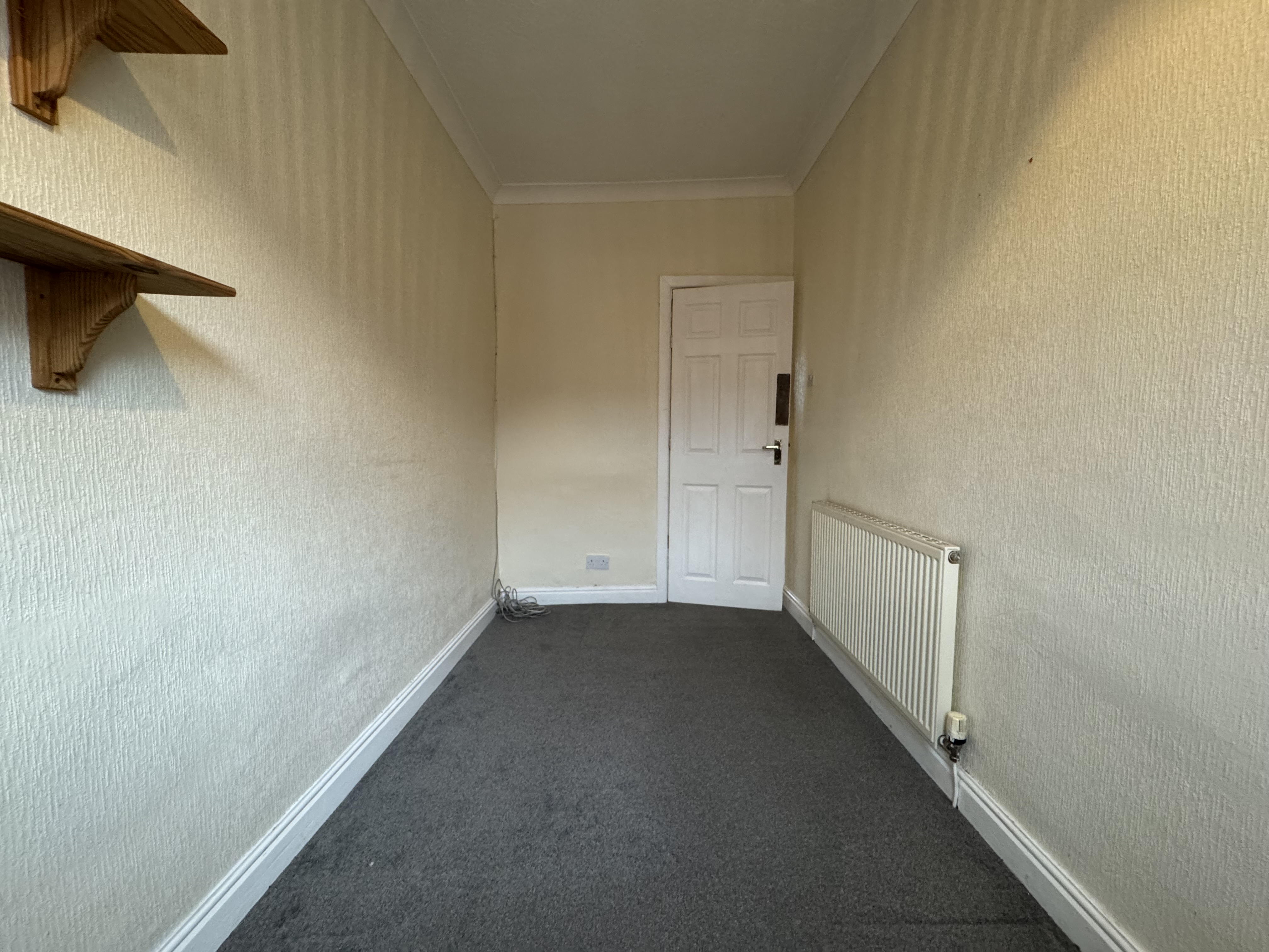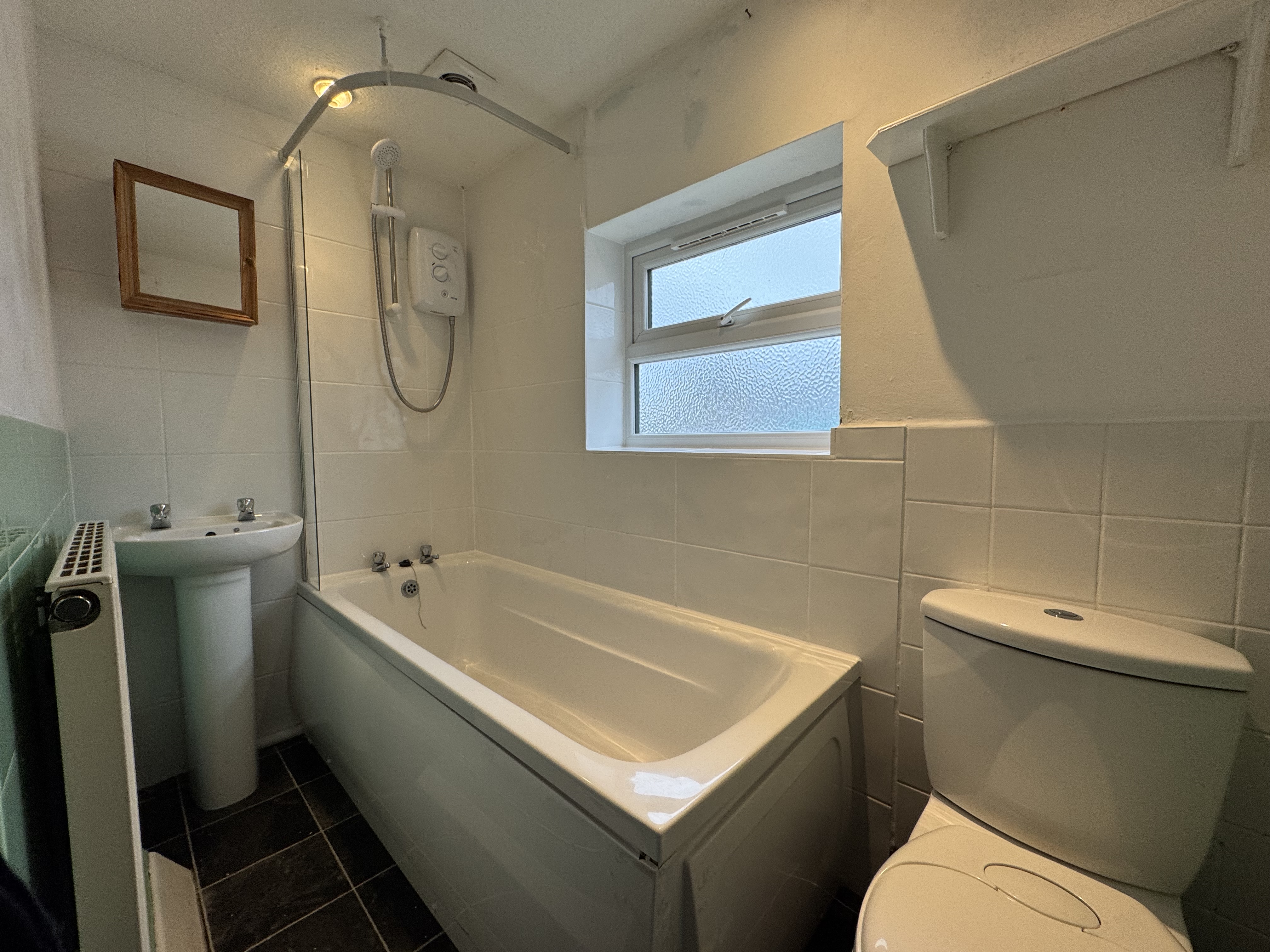 As you enter the property, you will find yourself in a small entrance vestibule which leads through to the first of the two reception rooms. This room has some cupboard space, and a fire in the centre of the main wall, it also gives access to the second reception room and subsequently the kitchen which is at the back of the house. The second reception room houses the stairs with a storage cupboard underneath, and is ideal for a dining room as it leads through to the kitchen. The kitchen is spread across two levels and provides plenty of cupboard and counter space, as well as a sink and hobs with oven and overhead extractor fan. There’s also space for appliances under the sink and countertop to the right of the door.