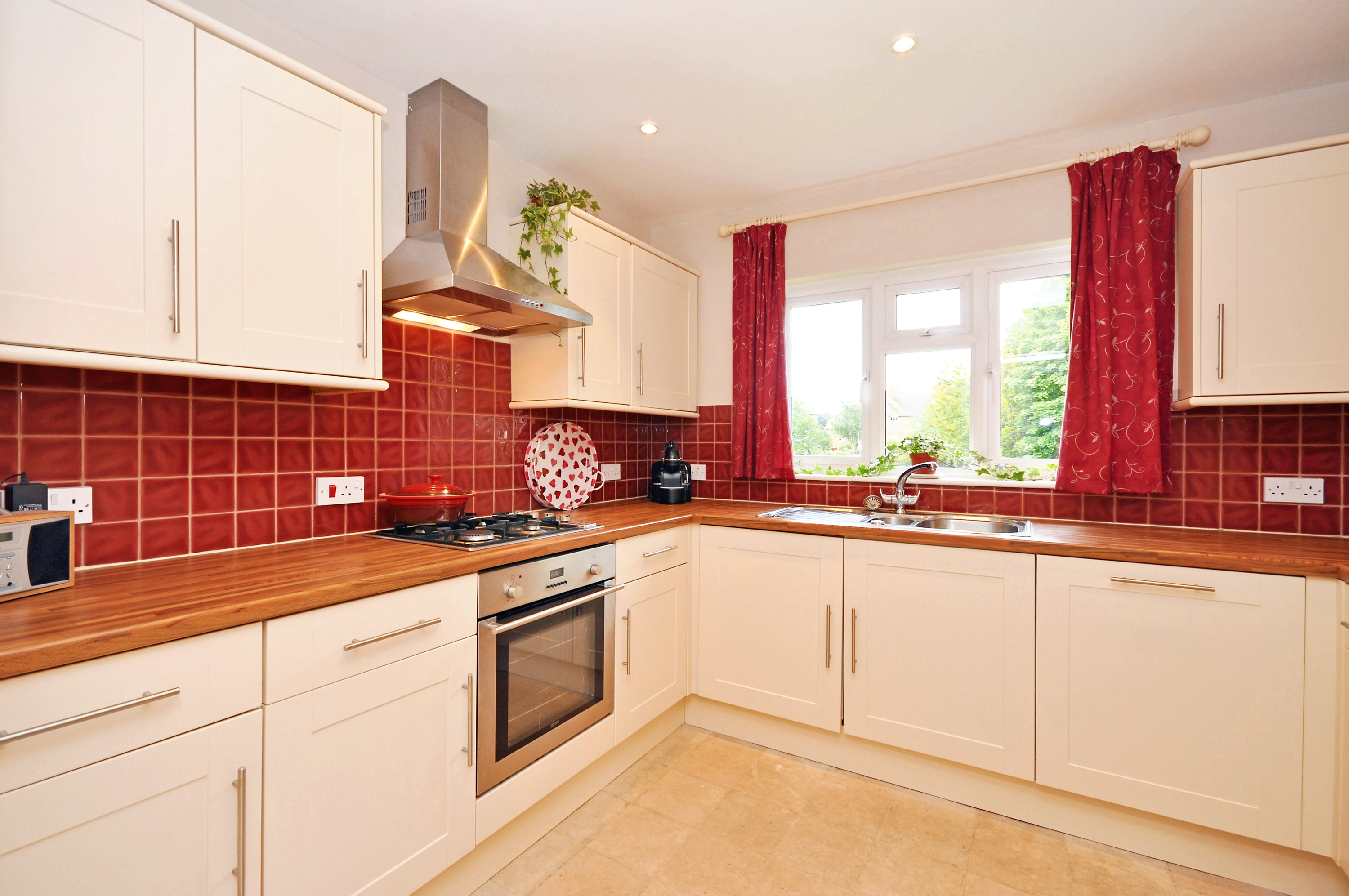 The fitted kitchen boasts an array of panelled wall and base units with complementary tiling adjacent to the work surfaces. Equipped with modern conveniences, including an integrated washer/dryer, dishwasher, electric oven, gas hob with a stainless steel extractor hood, and a convenient one-and-a-half bowl single drainer stainless steel sink unit with mixer taps.