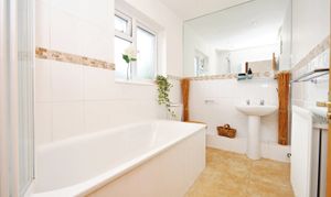 Both bedrooms are well-appointed with ample space and functionality. Completing the accommodation is the modern bathroom, accessible through a pine panelled door. A double glazed frosted window to the side ensures privacy while allowing natural light to filter through. The white bathroom suite includes a low-level WC, pedestal wash hand basin, and a large fitted panelled bath with a shower over. The space is tastefully finished with natural stone tiled flooring and half-tiled walls. Additional features include a radiator, towel rail, shaver point, half-wall feature mirror, and recessed down lights.