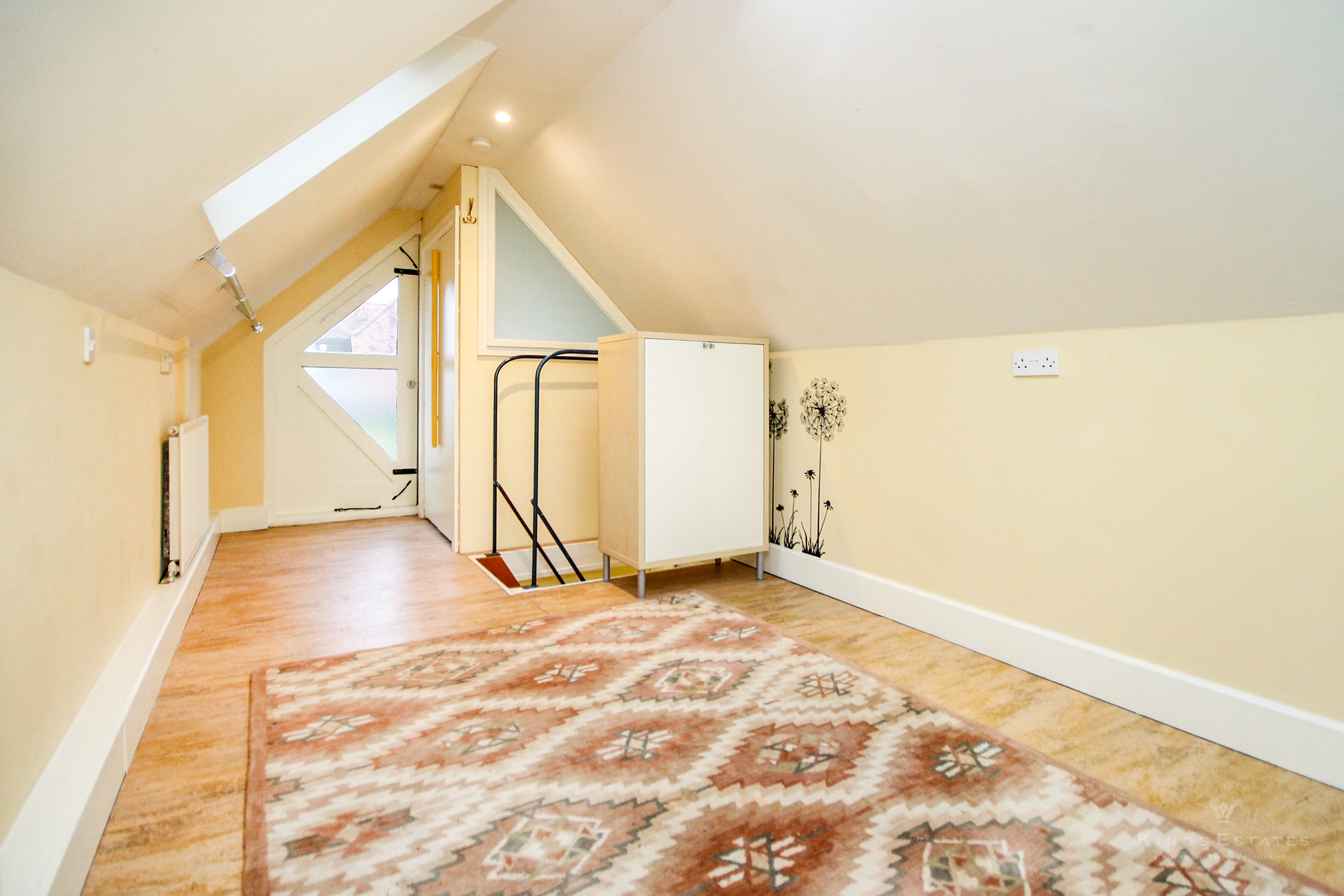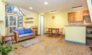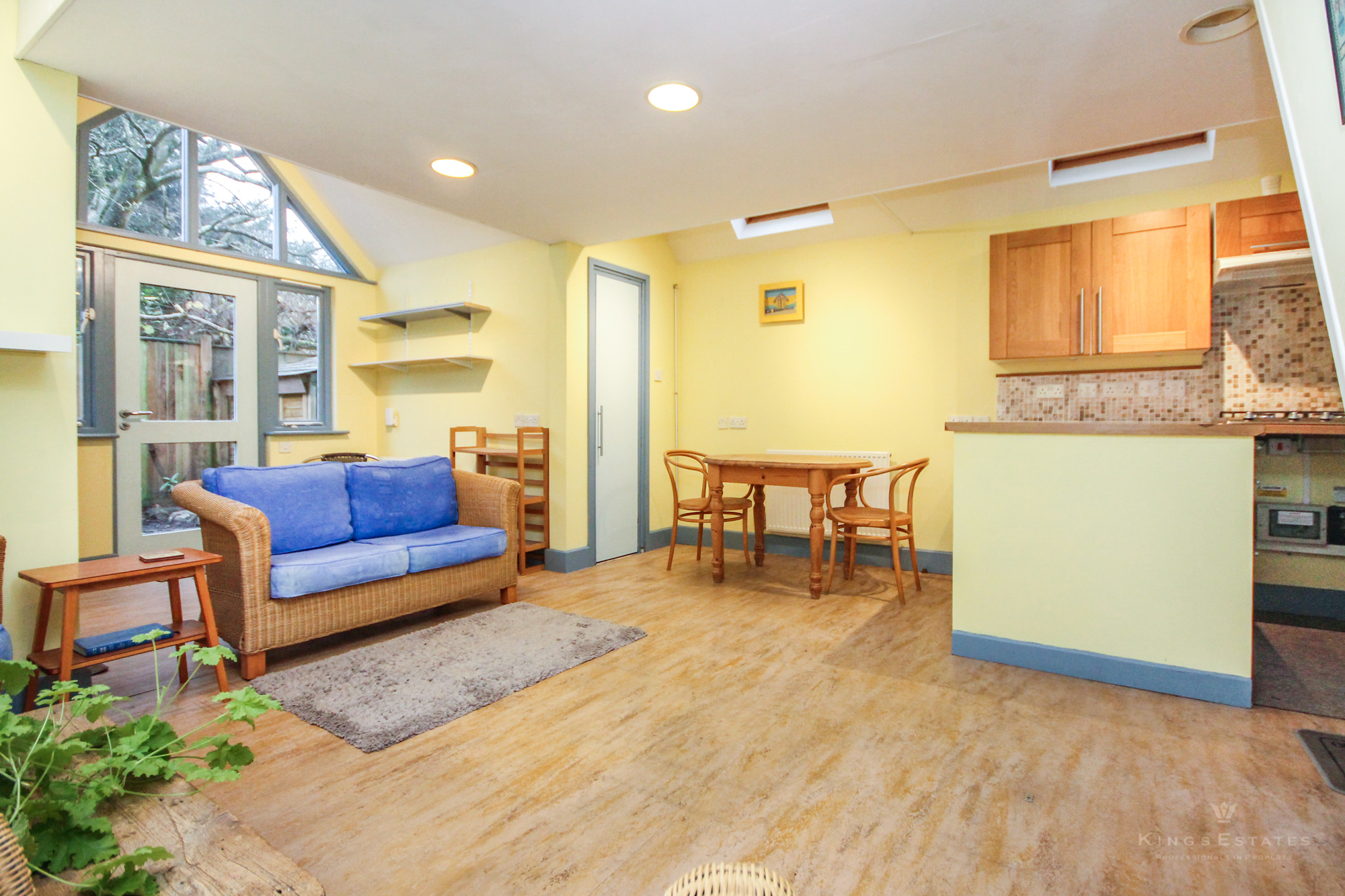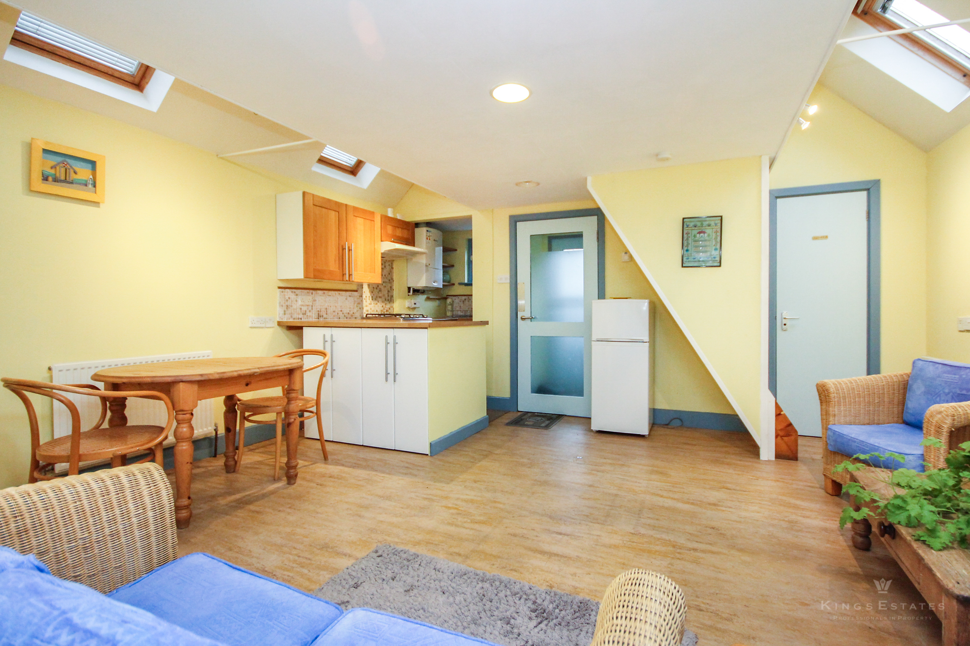 Kings Estates is delighted to present this charming and unique architect-designed one-bedroom converted studio. This detached property offers a contemporary and stylish living space, ideal for a single professional seeking a quiet retreat close to local amenities. The ground floor boasts an open-plan kitchen and living area with stunning double-height ceilings, creating a sense of space and light. The kitchen comes fully equipped with a gas hob, electric oven, fridge freezer, and washing machine, and features a dedicated dining area. The living space opens directly onto a small, enclosed garden, perfect for relaxing outdoors.
