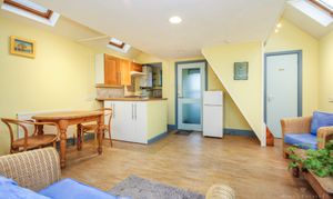 Space-saving stairs lead to the first-floor bedroom, located under a characterful pitched roof, which adds a cosy yet airy feel to the space. The property benefits from a shower room with an en-suite WC, a private entrance, gas central heating, and on-street parking.
