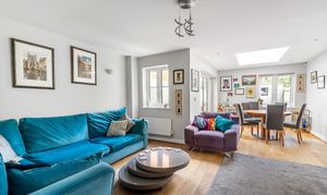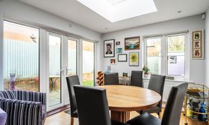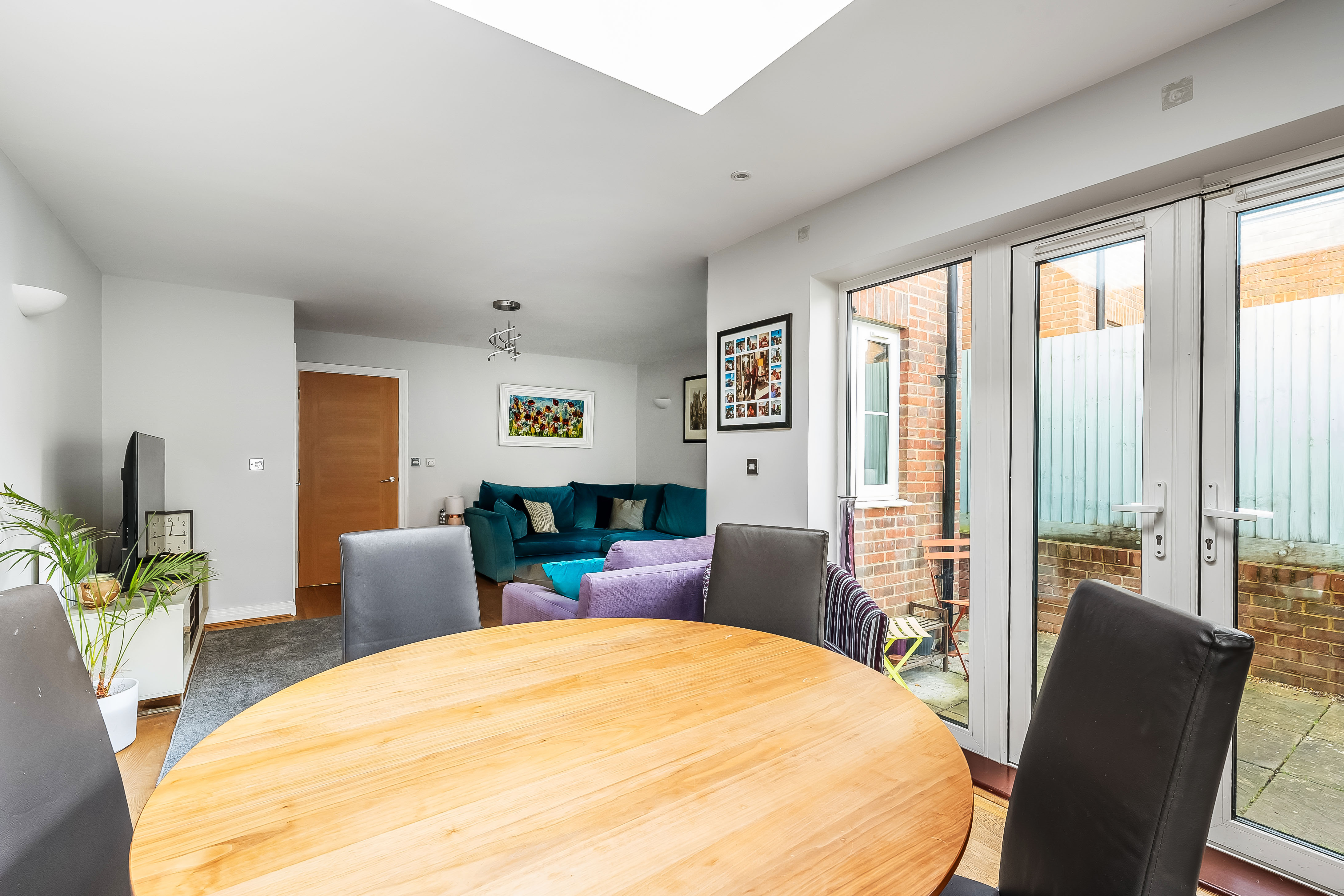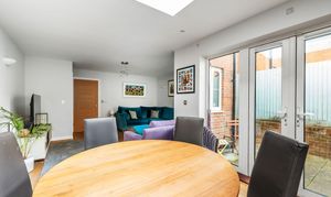 The entrance hall gives a welcoming first impression and leads to a downstairs WC. The modern fitted kitchen features tiled flooring and integrated appliances, creating a practical yet stylish space for cooking and daily life. To the rear, the open plan sitting and dining room forms the heart of the home, bathed in natural light with a skylight roof window in the dining area and opening through double French doors to the private garden. The layout lends itself well to family living and relaxed entertaining.