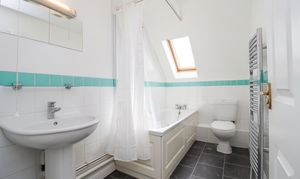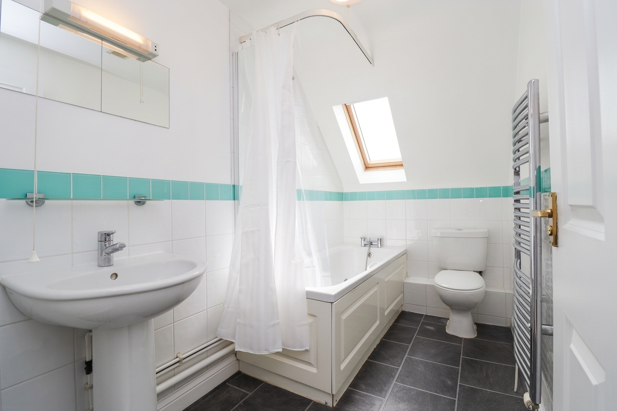 The bathroom is fitted with a modern white suite comprising a panelled bath with shower over, low level WC and pedestal wash hand basin, complemented by tiled surrounds, a heated towel rail and a Velux window which allows in natural light and ventilation.