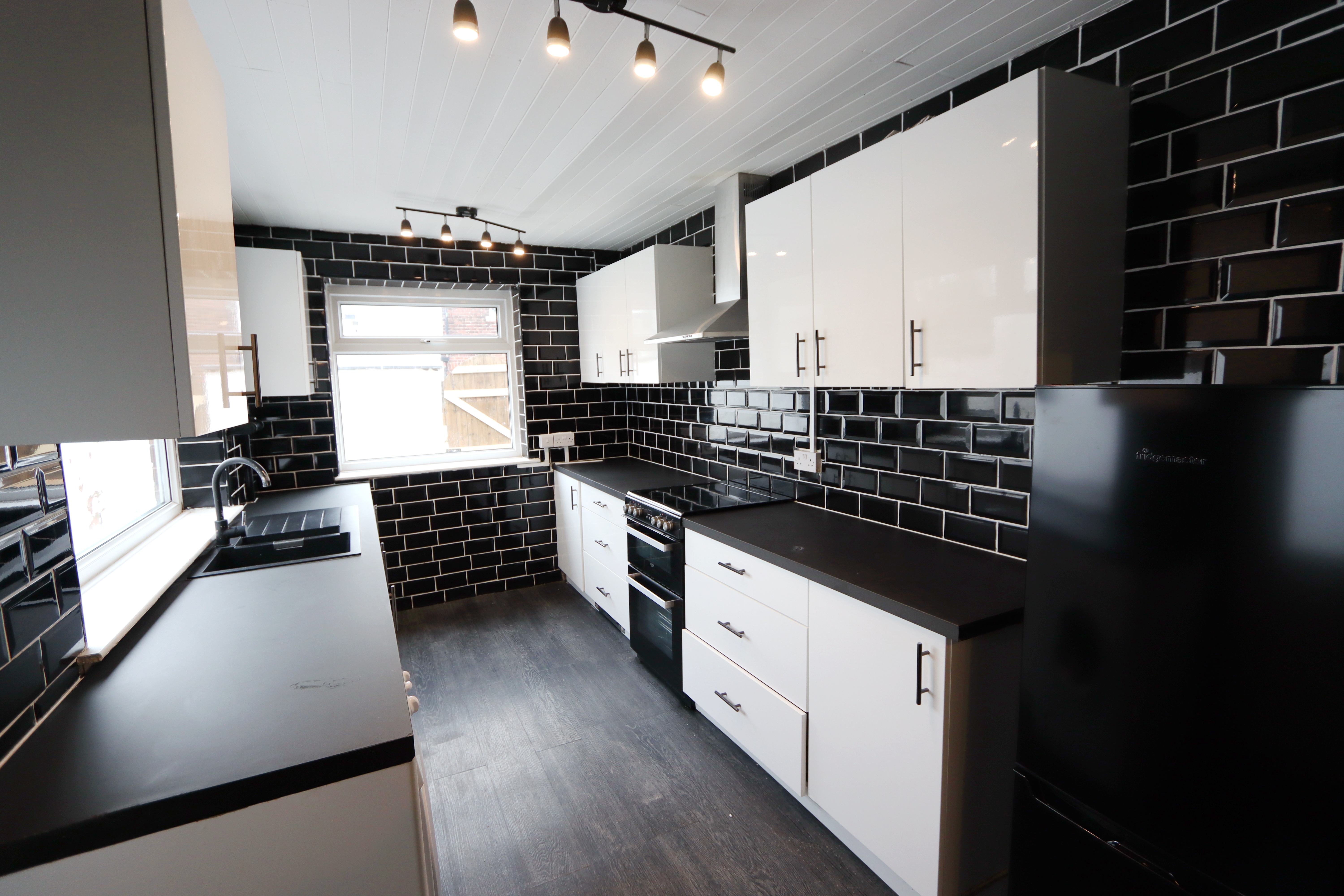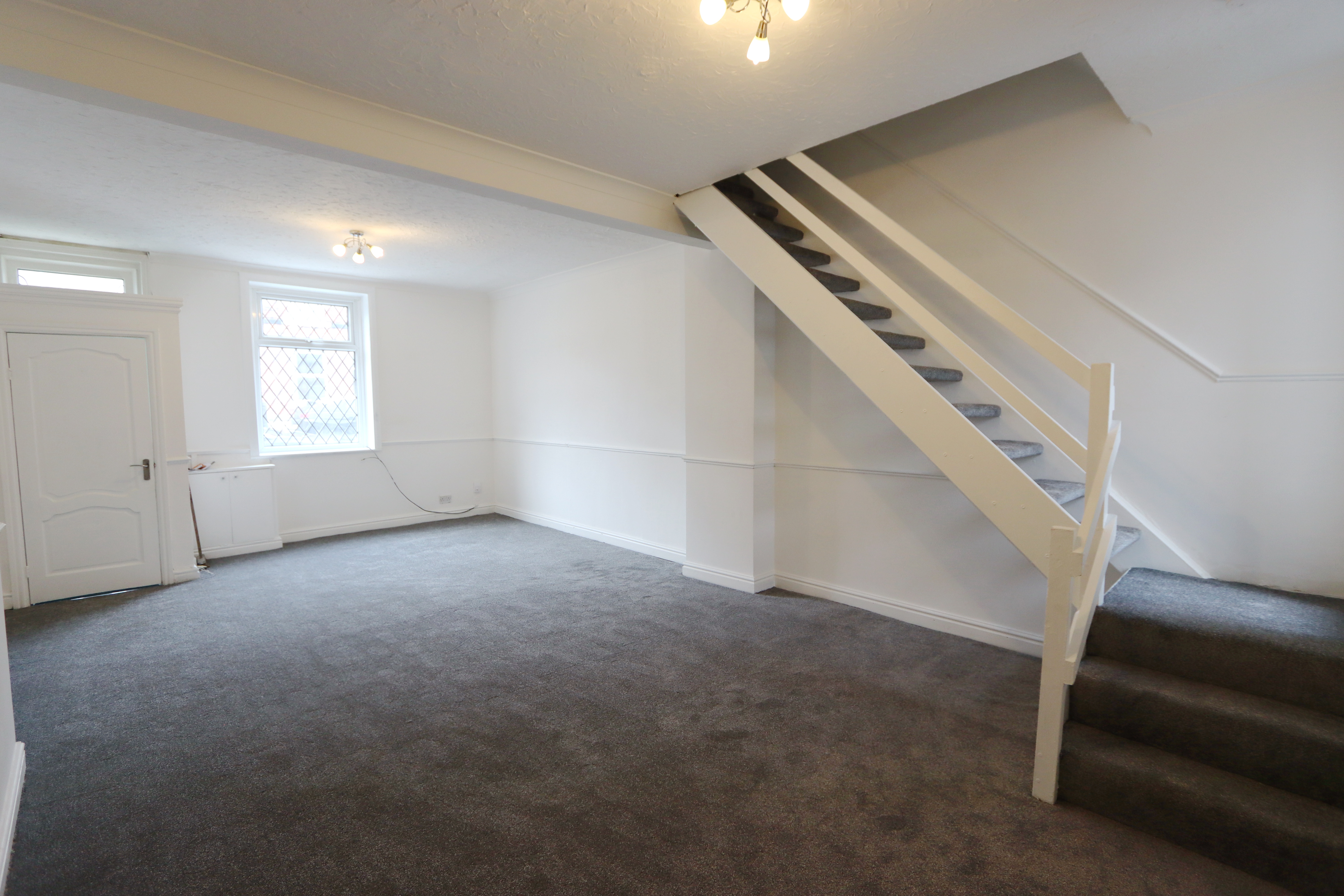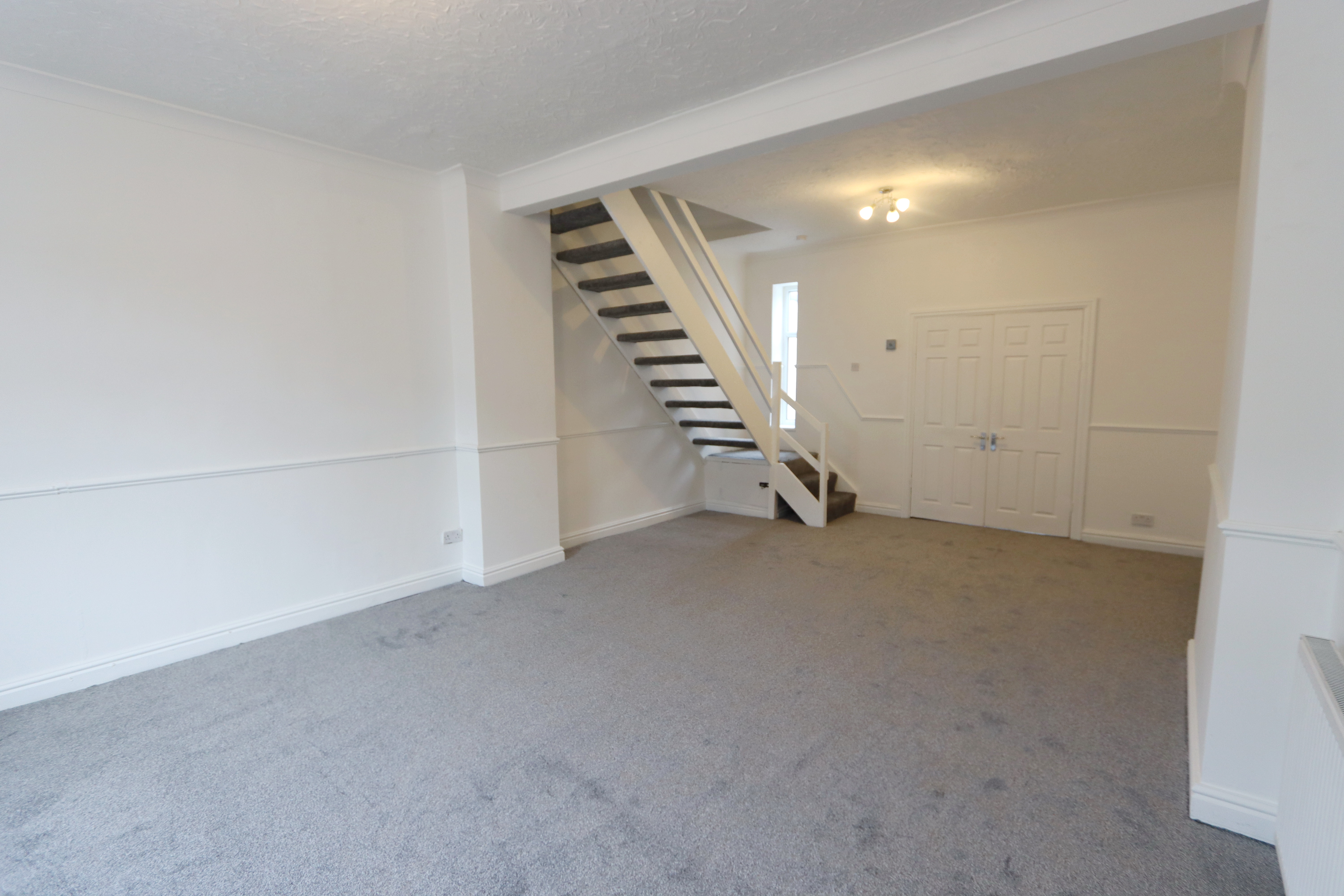 The entrance door leads into a vestibule which opens into the spacious open plan lounge/dining room which has a stairway leading to the first floor landing, newly carpeted flooring in bedroom and lounge , double glazed window with front views, allows ample space for lounge and dining furniture and has double opening doors which open through into the kitchen which has a range of matching wall and base units with heat resistant work surfaces, inset sink with mixer tap, free standing cooker with halogen hob and extractor above, with free standing standing fridge freezer There is attractive laminate flooring and a rear doorway which provides access to the rear yard.