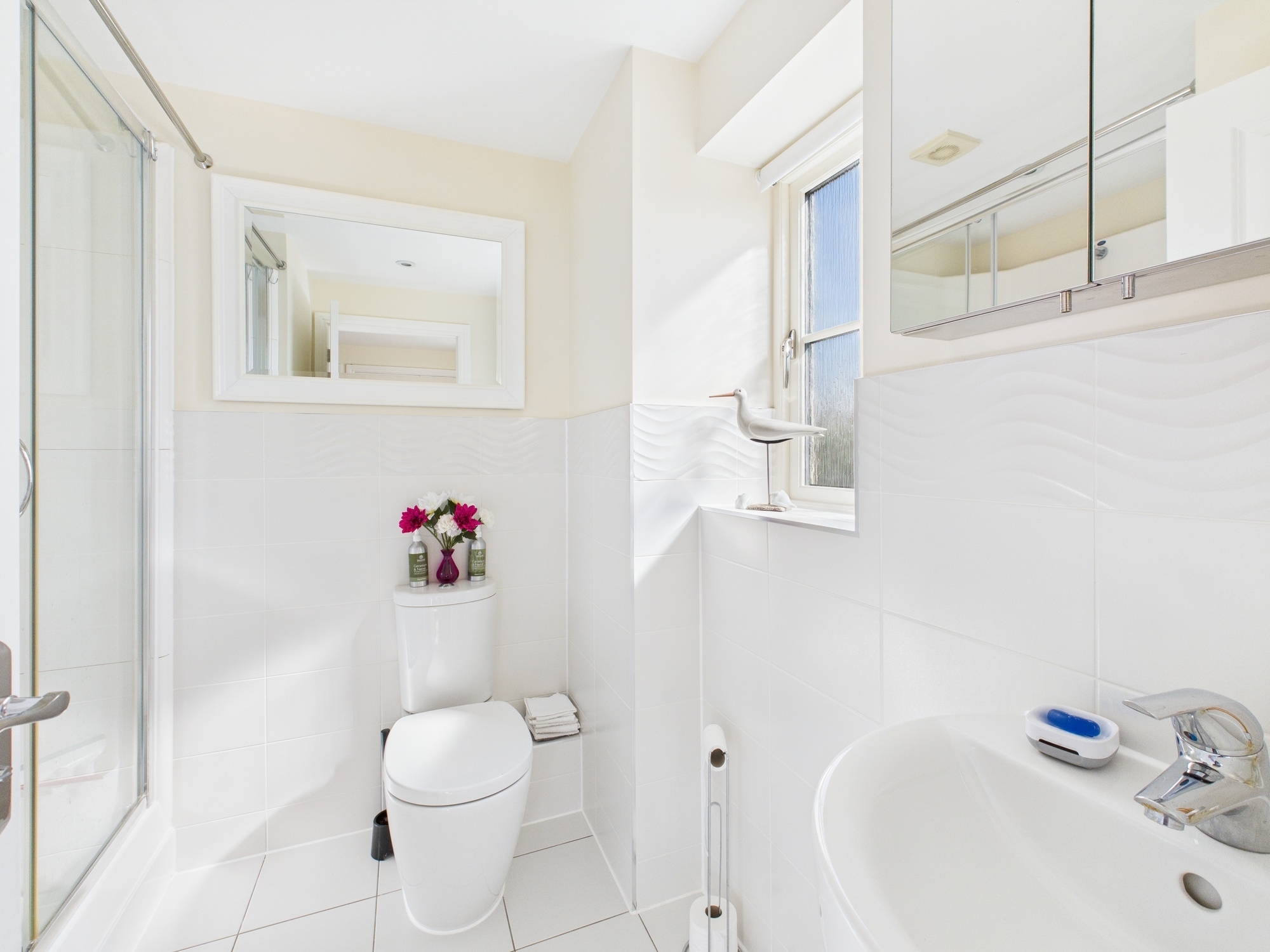Fitted with a four piece-suite comprising shower enclosure, bath, wash basin and W.C. Window to the front. Heated towel rail. Extractor fan and shaver point.