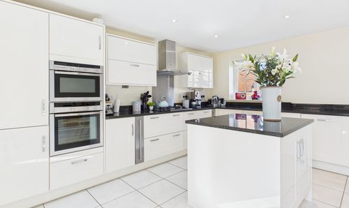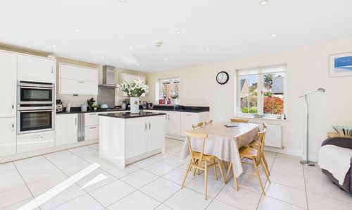 Fitted with a range of base and wall units with working surfaces including an island unit. Undermounted stainless steel sink, integrated dishwasher, fridge/freezer and microwave, double eye-level ovens and a four ring gas hob with extractor hood. A dual aspect room with two windows to one side and French doors into the garden. Two radiators.