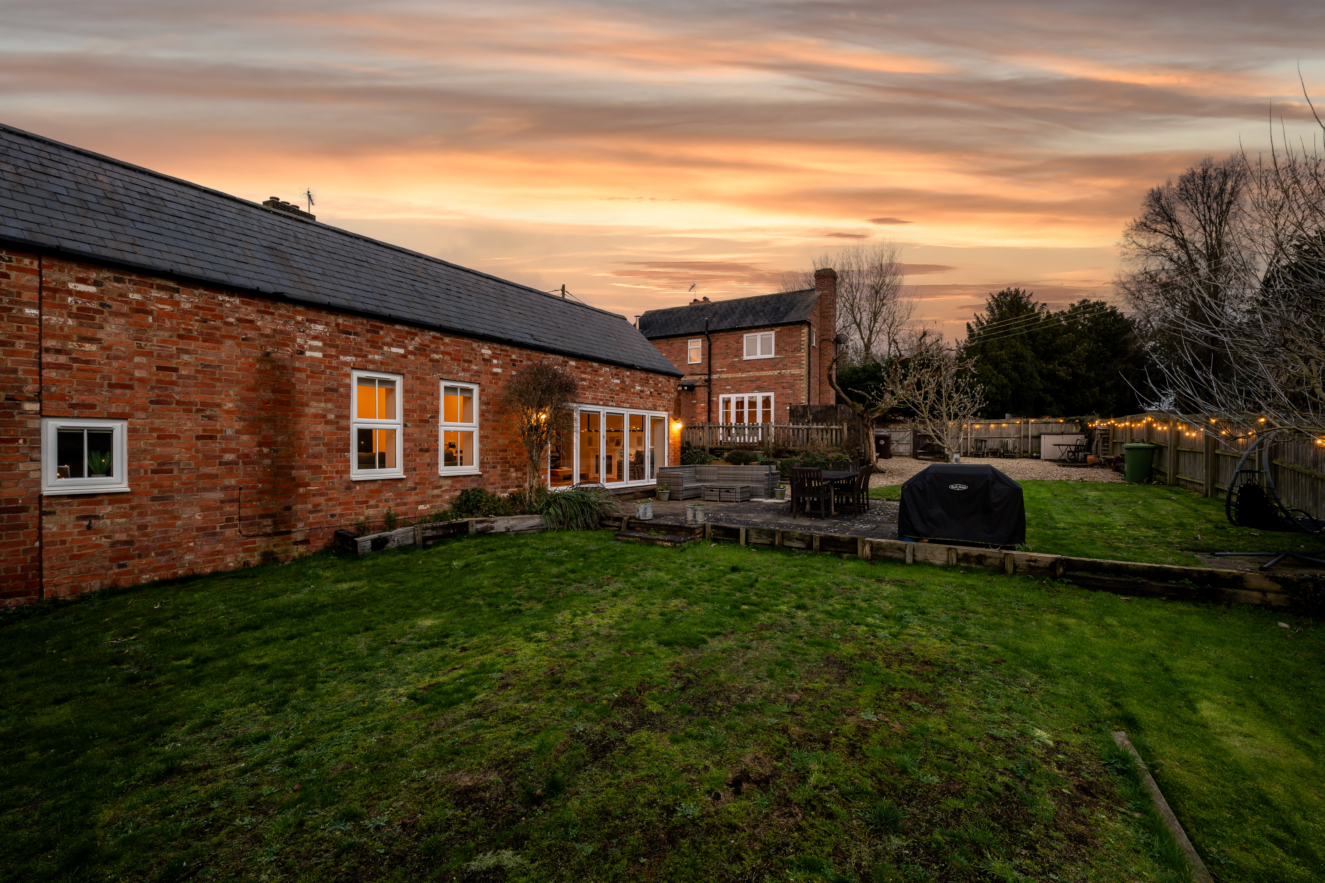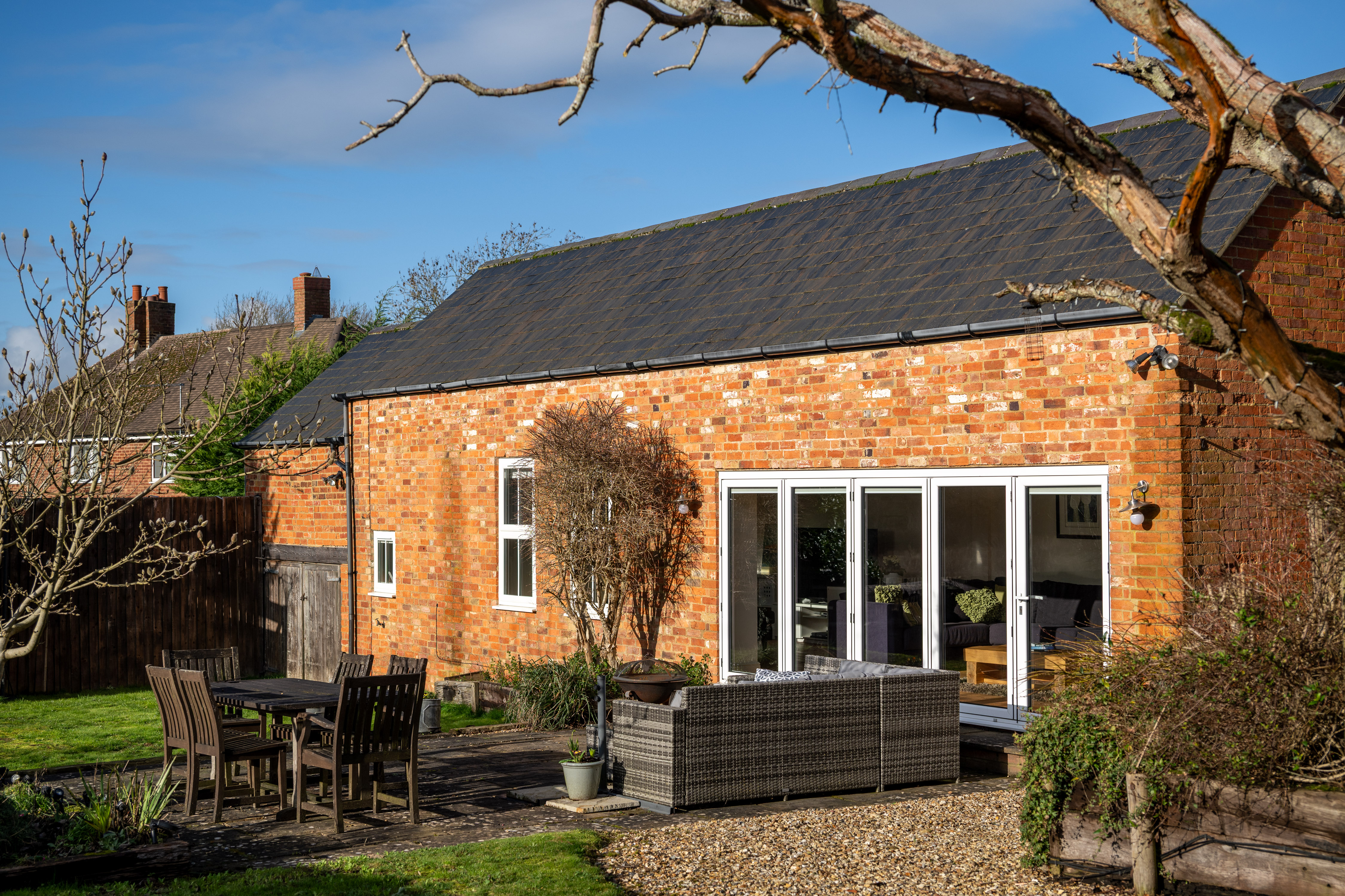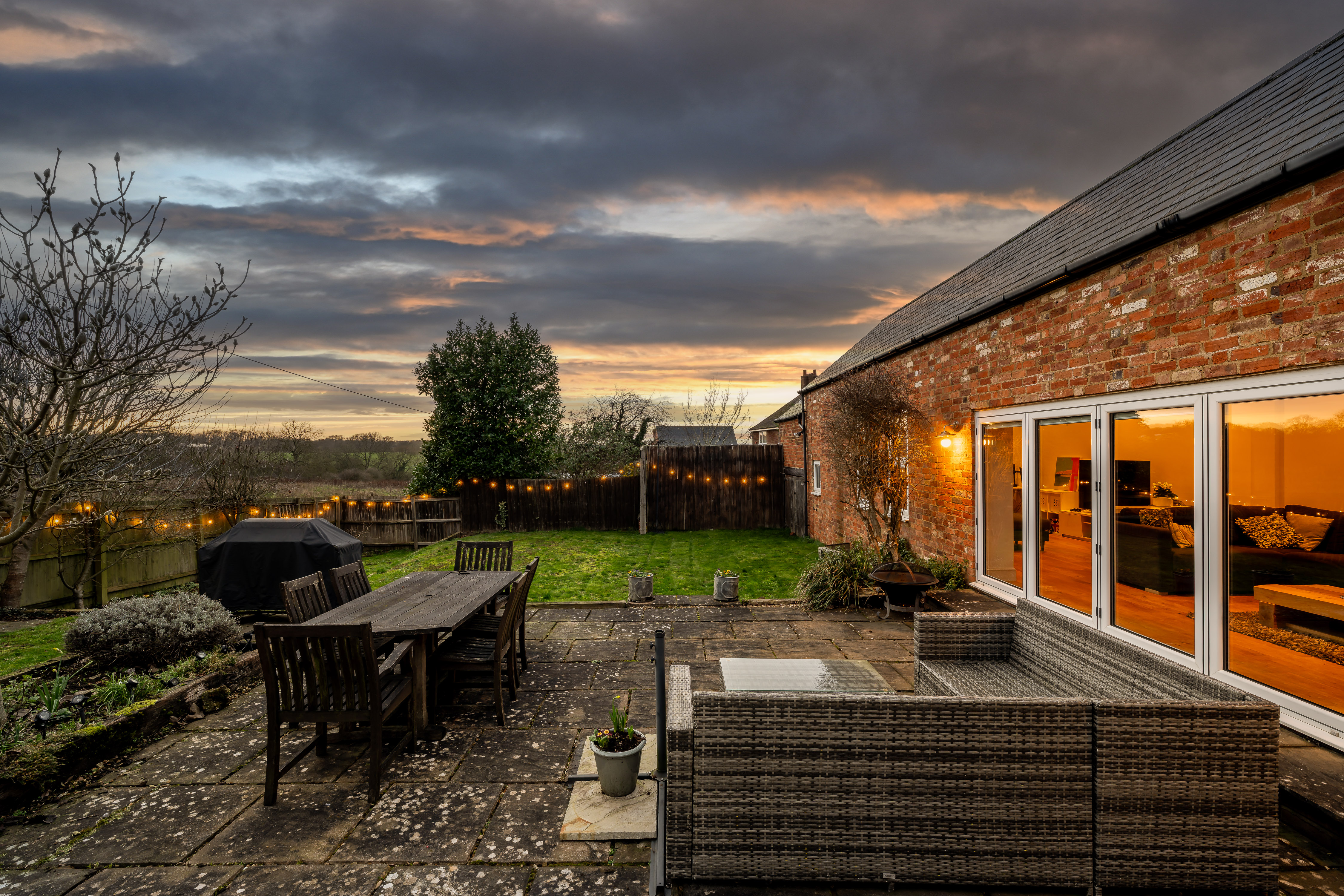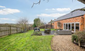 The patio, directly accessed from both the sitting room and the barn via bi-fold doors, becomes a natural extension of the house in warmer months. Beyond, the lawn provides space for play, planting and peaceful enjoyment of the surroundings.