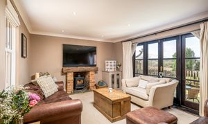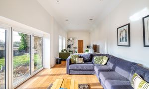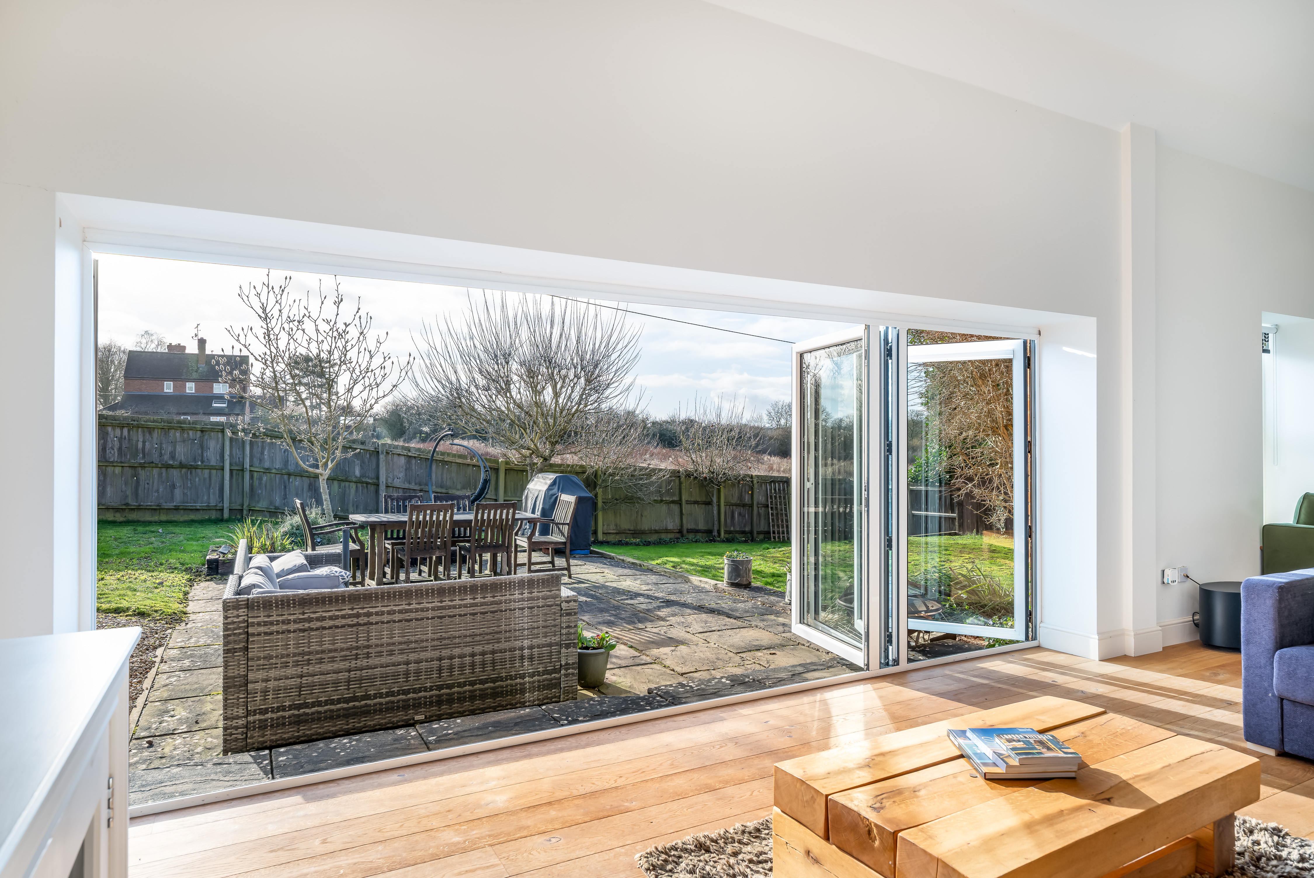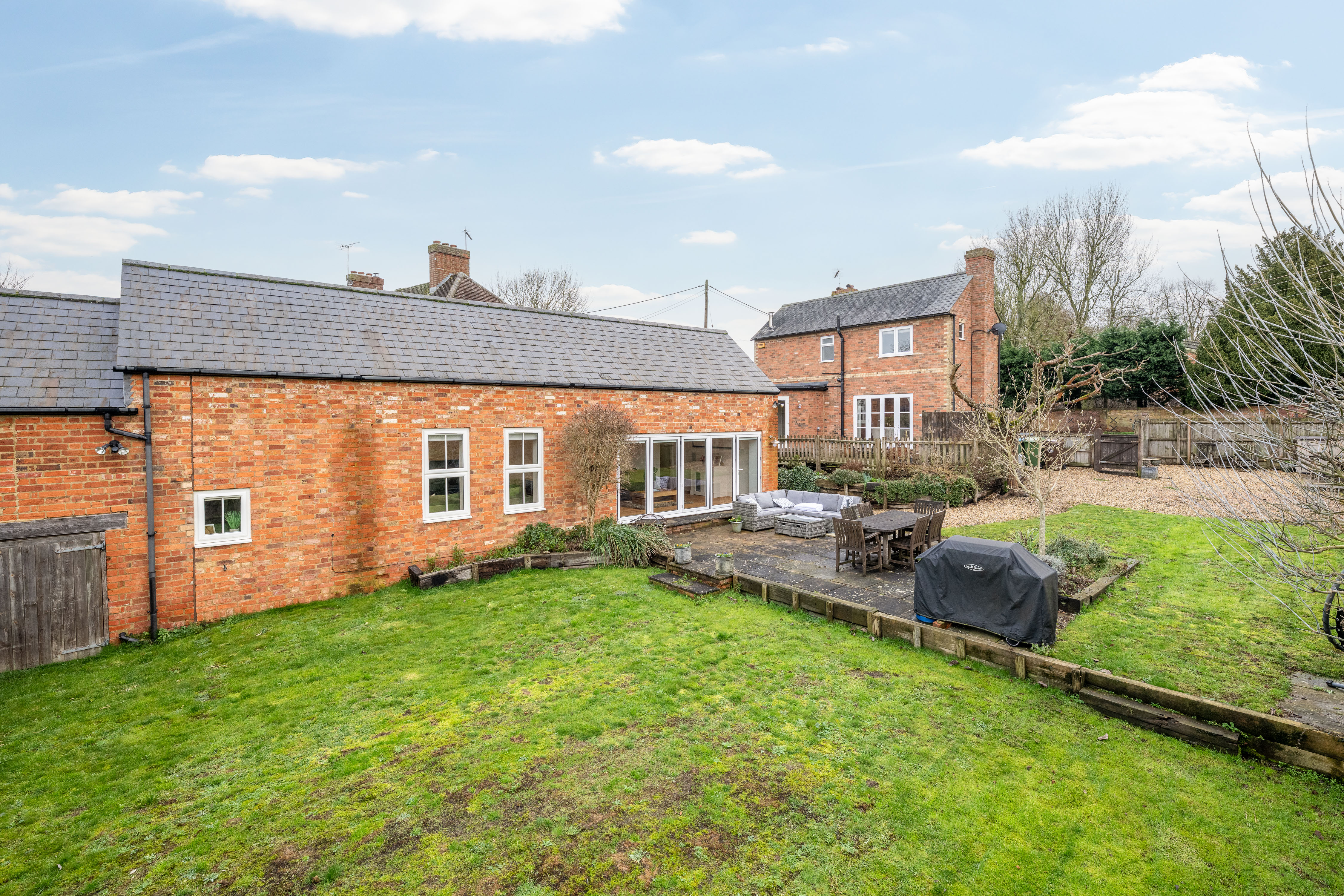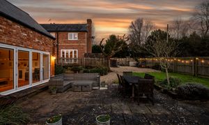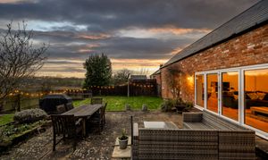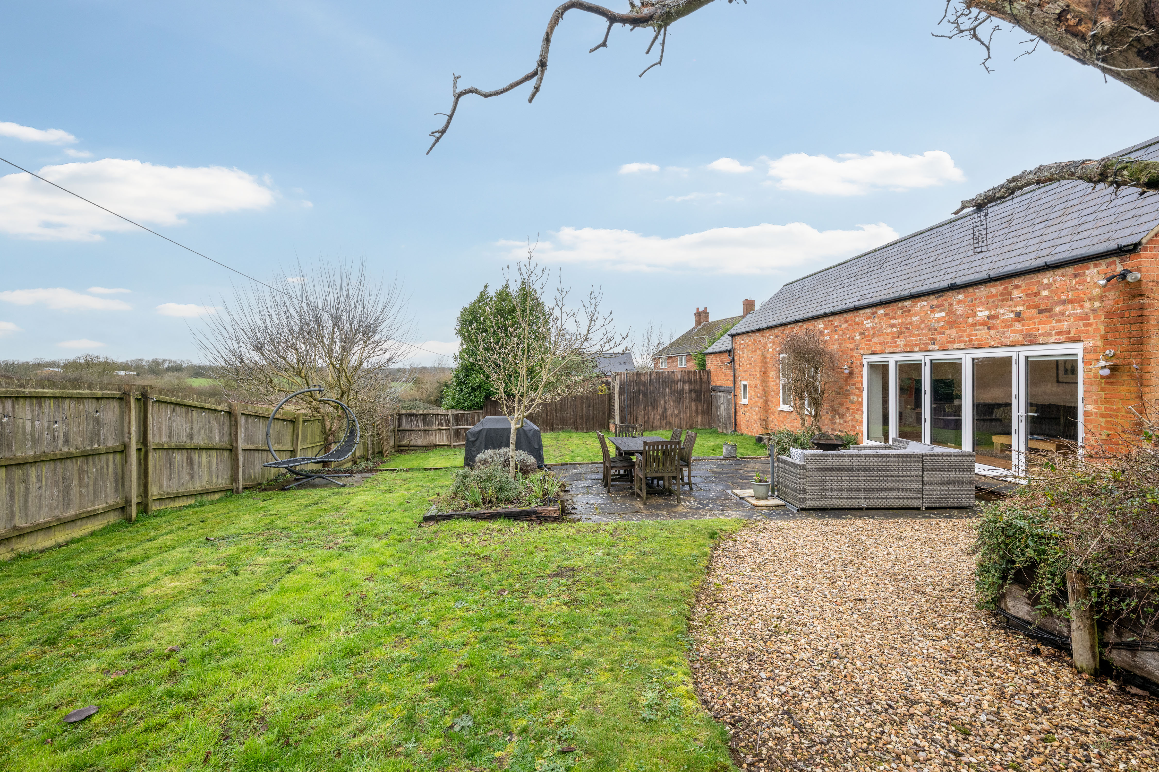The patio, directly accessed from both the sitting room and the barn via bi-fold doors, becomes a natural extension of the house in warmer months. Beyond, the lawn provides space for play, planting and peaceful enjoyment of the surroundings.