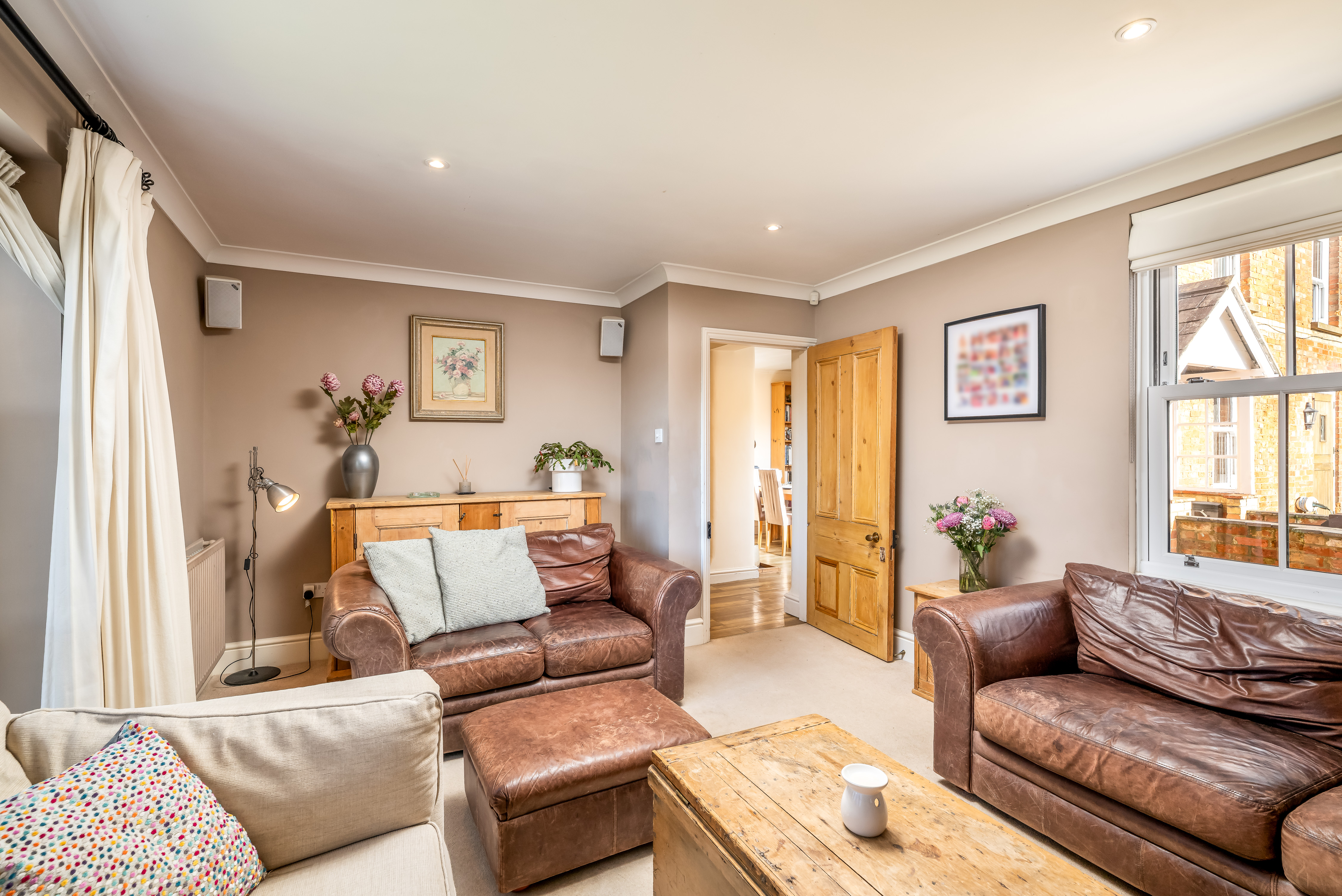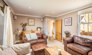Stepping inside, the entrance hall offers a warm welcome and access to the cellar, now used as a cosy television room, providing valuable additional living space. The ground floor unfolds into three principal reception areas, each with its own atmosphere and purpose.