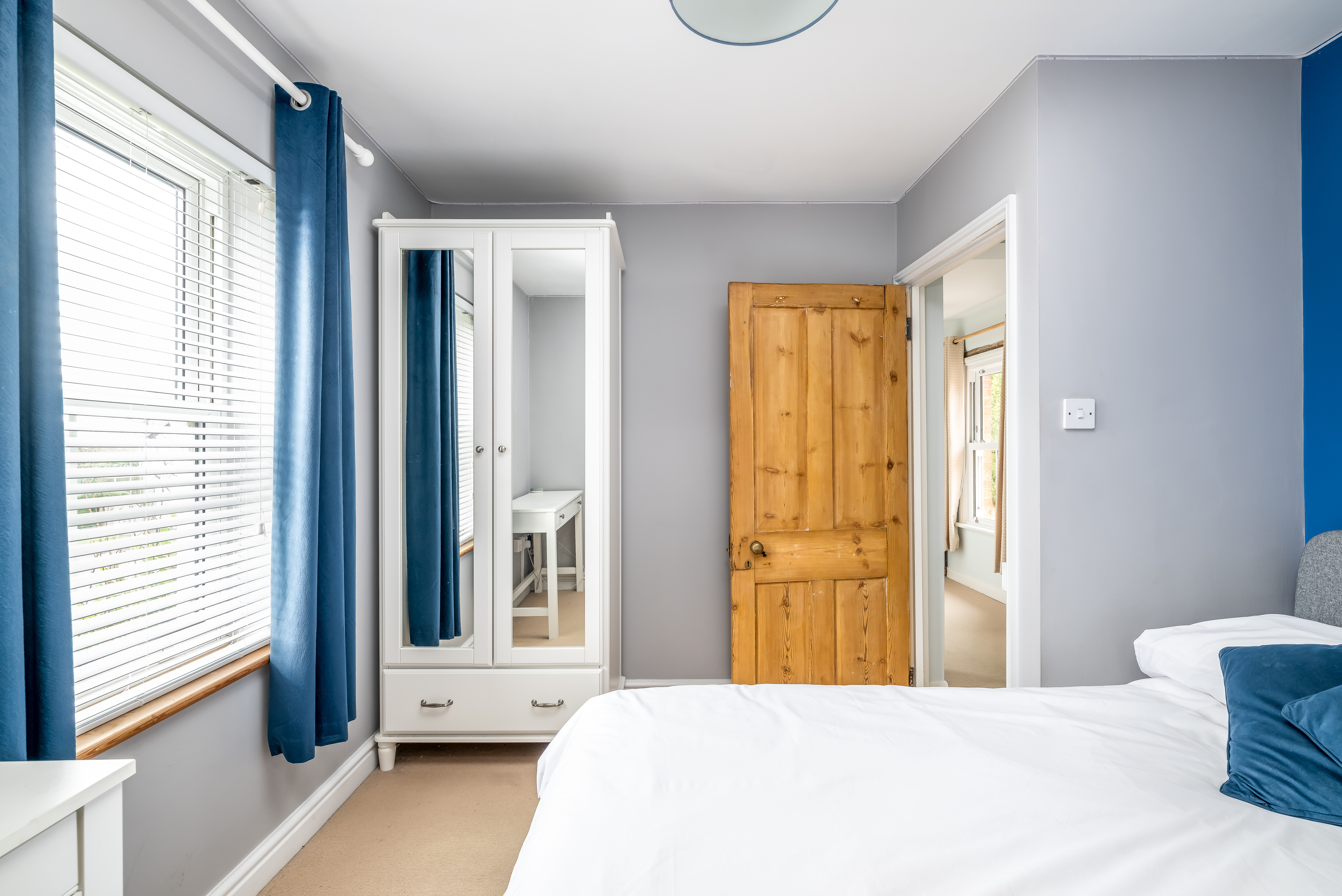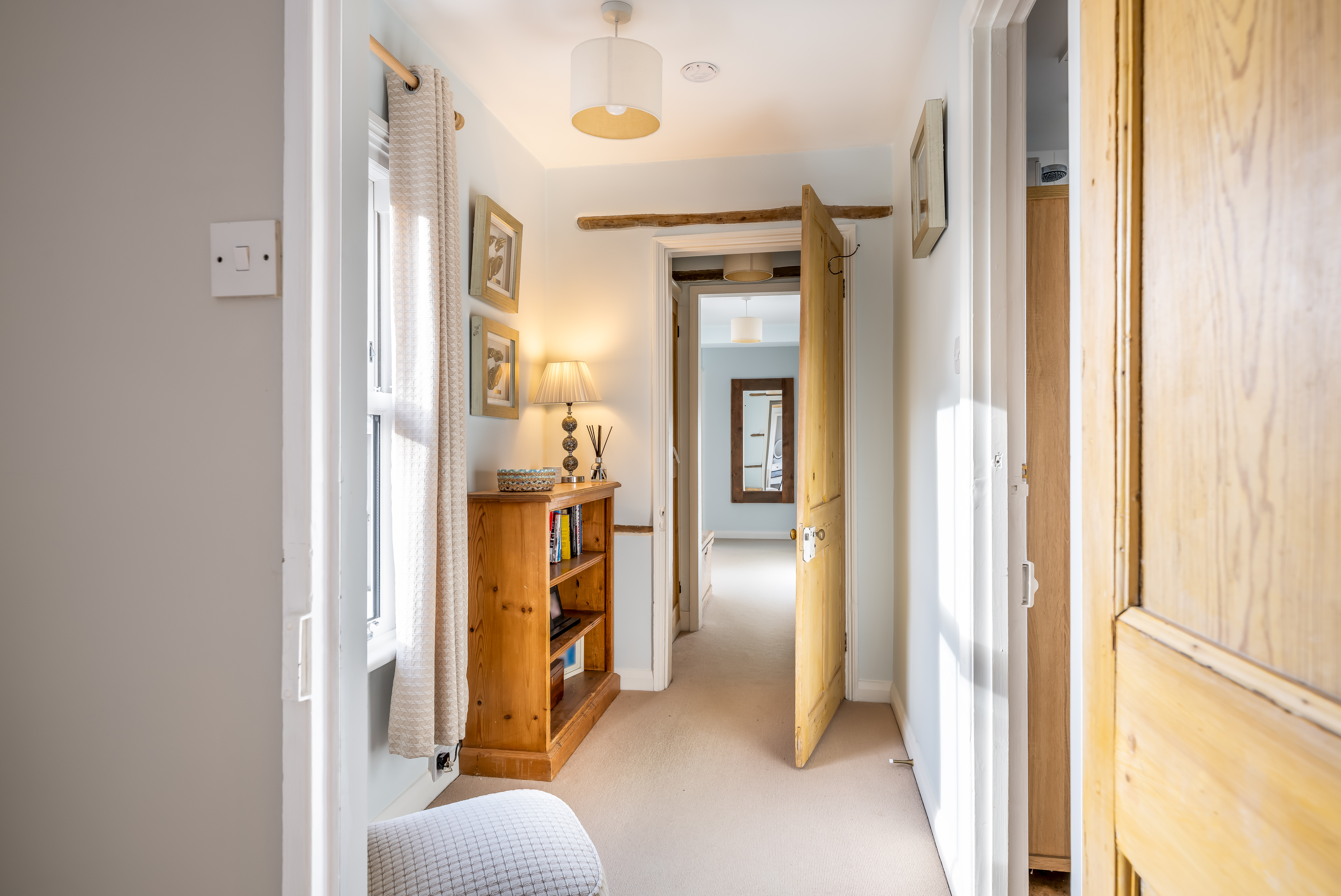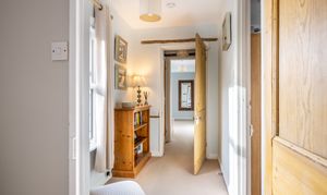 At the heart of the home lies the kitchen diner, a generous and welcoming space designed for everyday family life. The handmade bespoke kitchen, crafted by a joinery company based in Akeley, brings quality and craftsmanship to the forefront. A butler sink, integral appliances, ample preparation space and room for a family table create a kitchen that is both practical and beautiful. Windows to two elevations flood the space with light, while the stable door adds both charm and direct access to the outside.
