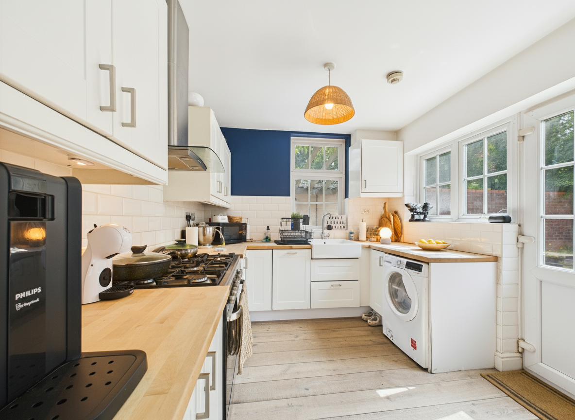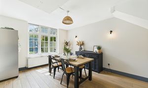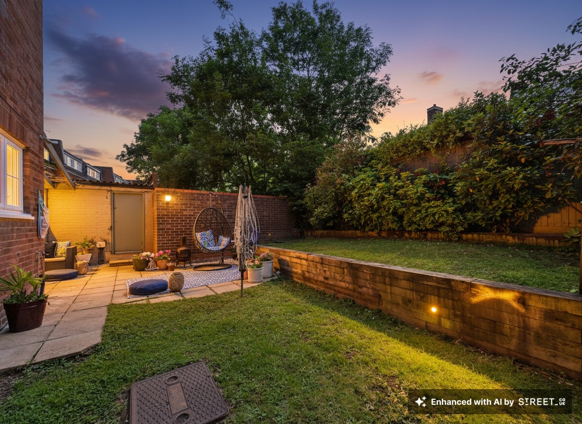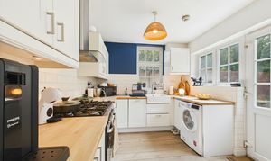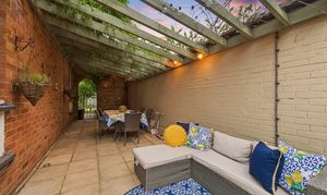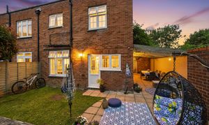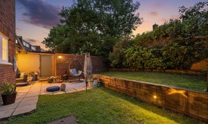 Outside, the landscaped rear garden includes a patio ideal for outdoor dining, leading to a neat lawn with mature planting. There is a garage and private parking to the side of the property, with additional on street parking available.