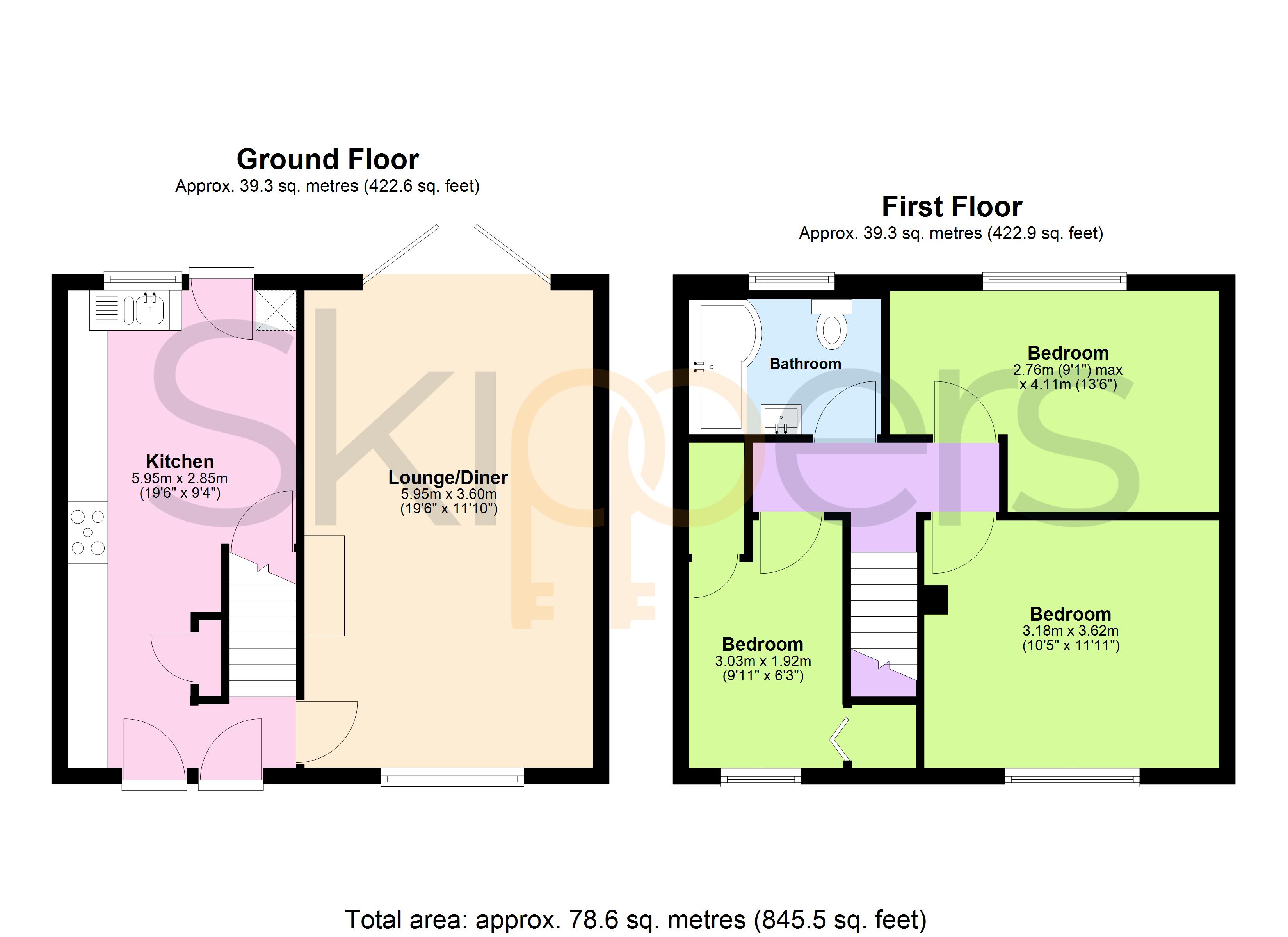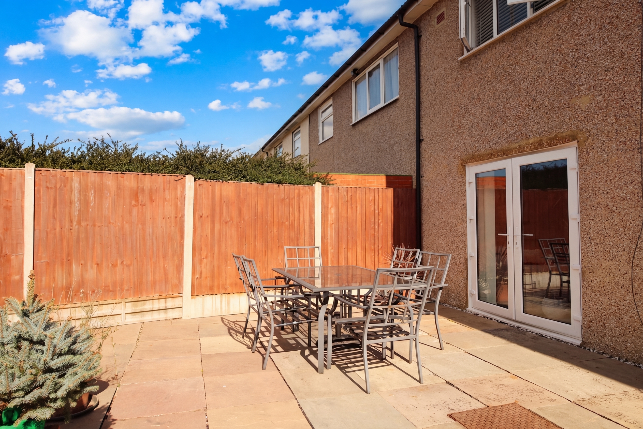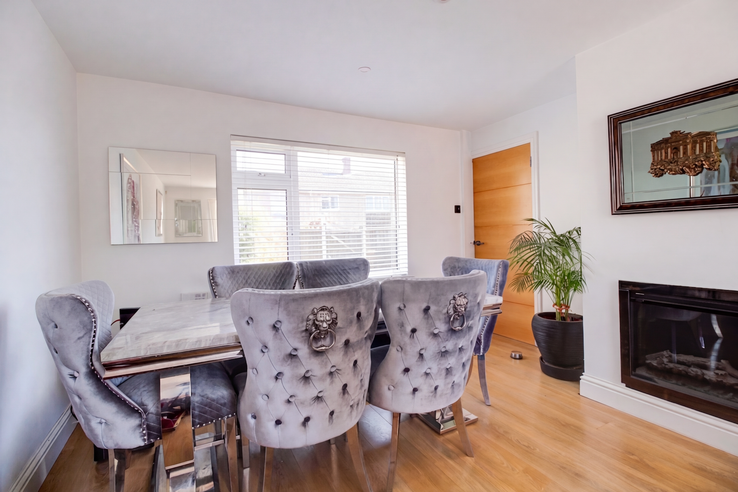 The ground floor is well arranged, featuring a dual-aspect living/dining room to one side, filled with natural light, and a spacious kitchen/breakfast room to the other, perfect for both everyday family life and entertaining. Stairs rise centrally to the first floor, where there are two generous double bedrooms, along with a third bedroom featuring built-in cupboards, offering flexibility as a child’s room, nursery, or home office. A modern family bathroom completes the accommodation.