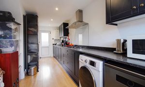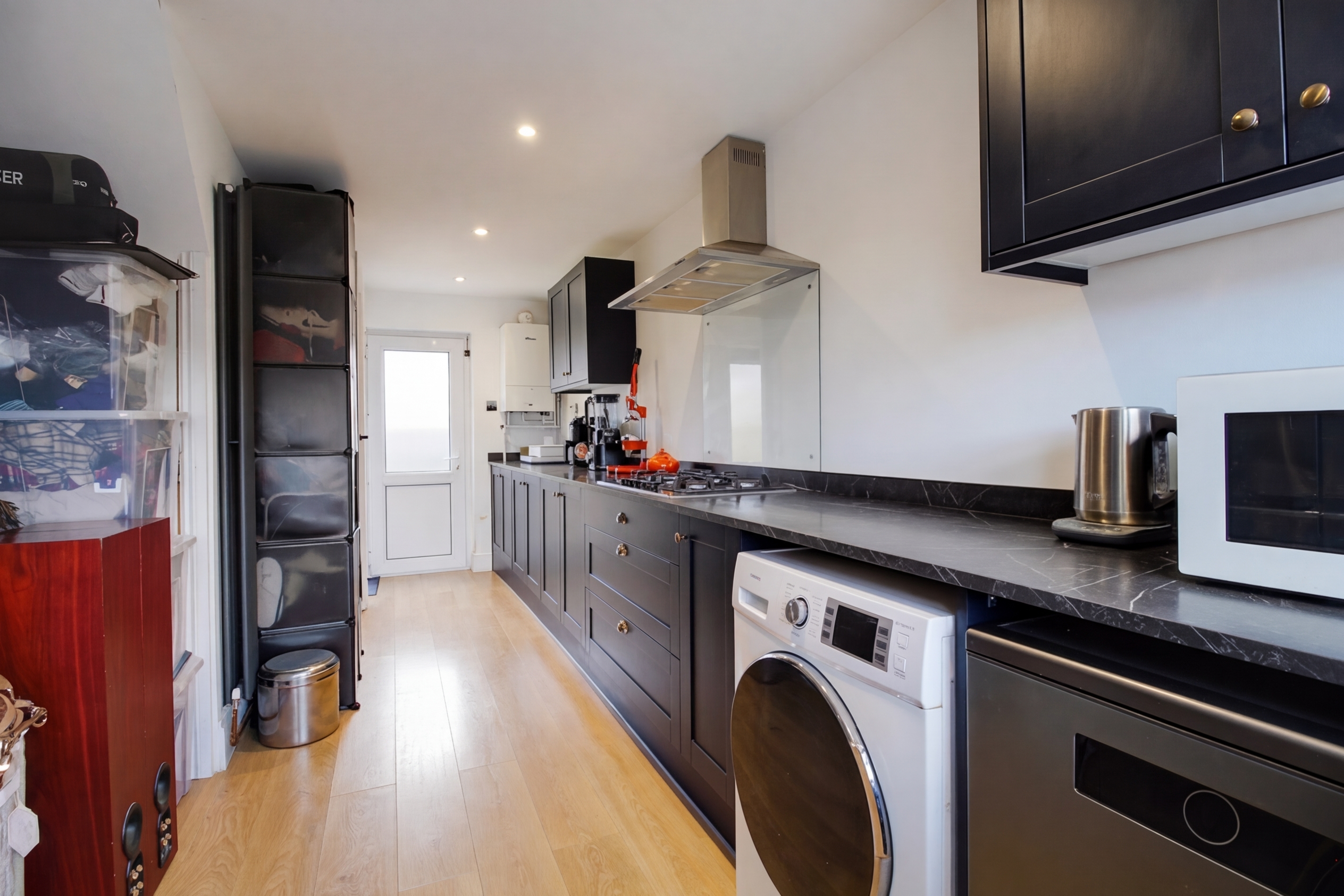 Dual aspect with doors to the front and rear and window to the rear overlooking garden, meter cupboard, under-stairs cupboard, radiator and laminate wood flooring. Stairs lead to the first floor. Modern kitchen featuring a range of fitted wall and base units with worksurfaces over, inset 1.5 bowl sink/drainer, built-in eye-level oven, 5-ring gas hob and extractor hood, plumbing and space for washing machine and dishwasher, space for fridge/freezer. Wall mounted gas-fired central heating combo boiler.