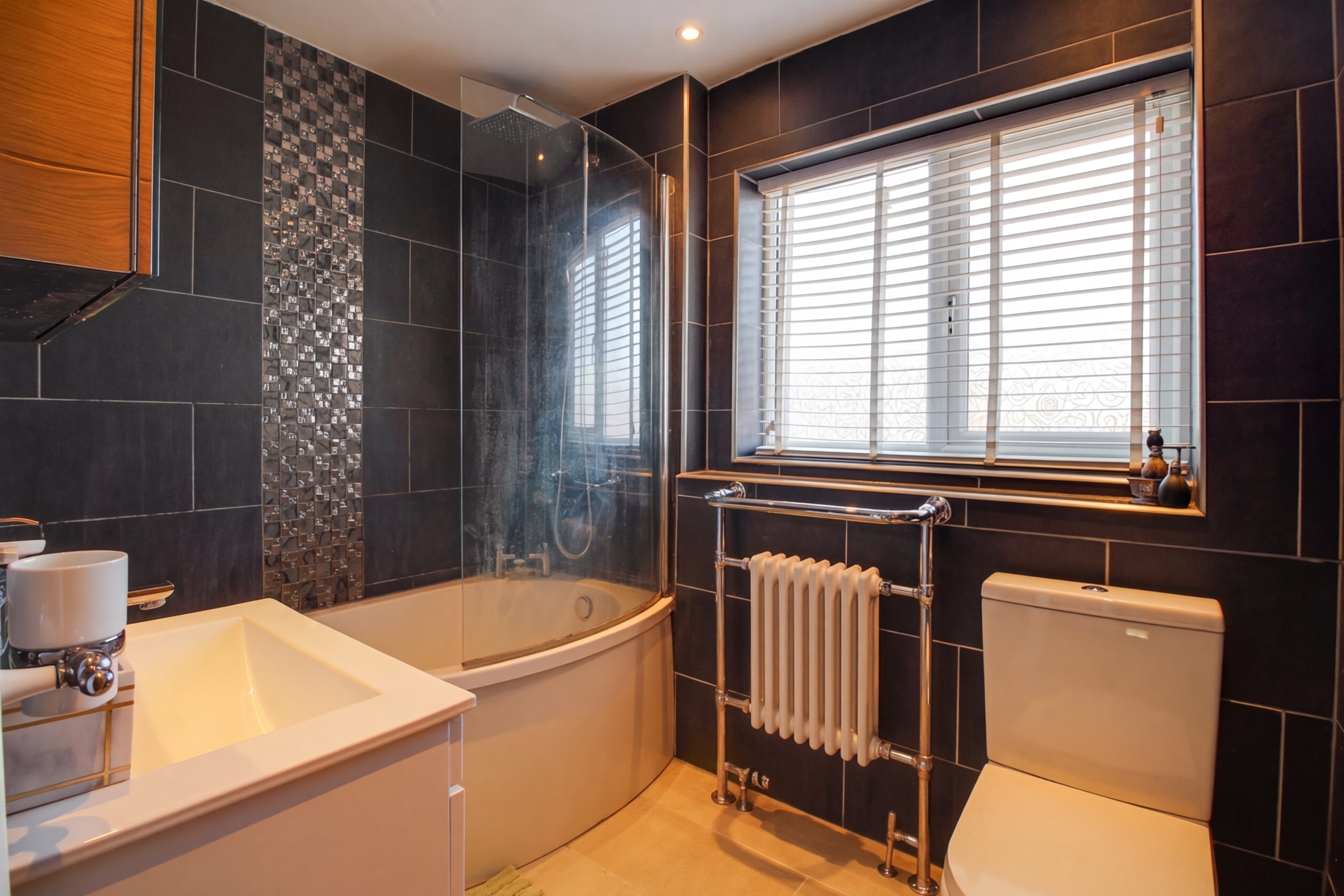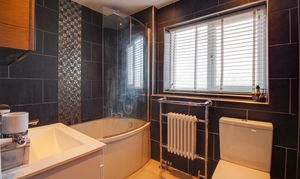 Window to the rear, 'P' shaped bath with mixer taps and thermostatic shower above with glass shower screen, WC, wash basin with storage below, towel radiator, tiled walls and flooring.