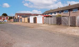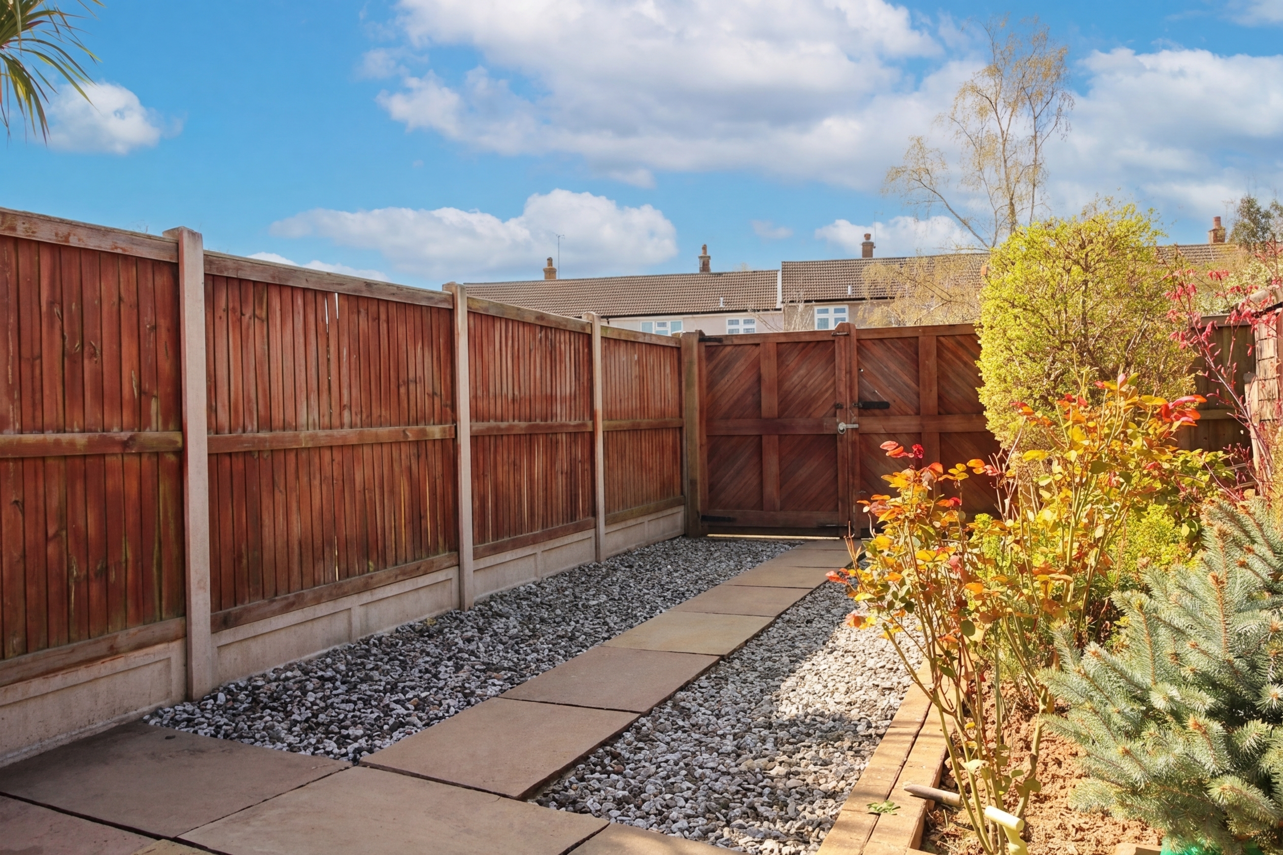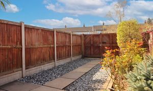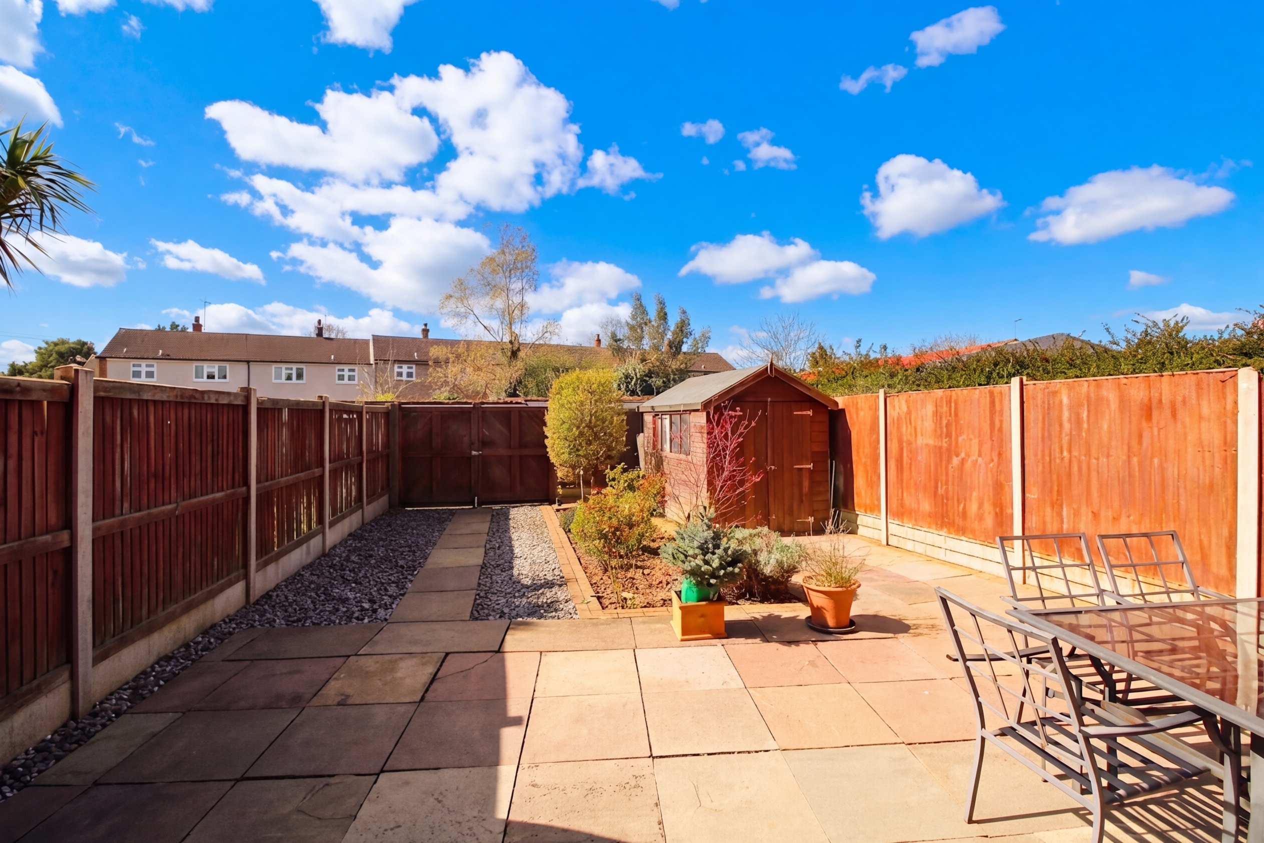 South facing rear garden, featuring Indian sandstone paving adjacent to the rear of the house, timber garden shed, space to park one car with double gates opening to allow access, planted area and fenced boundaries.