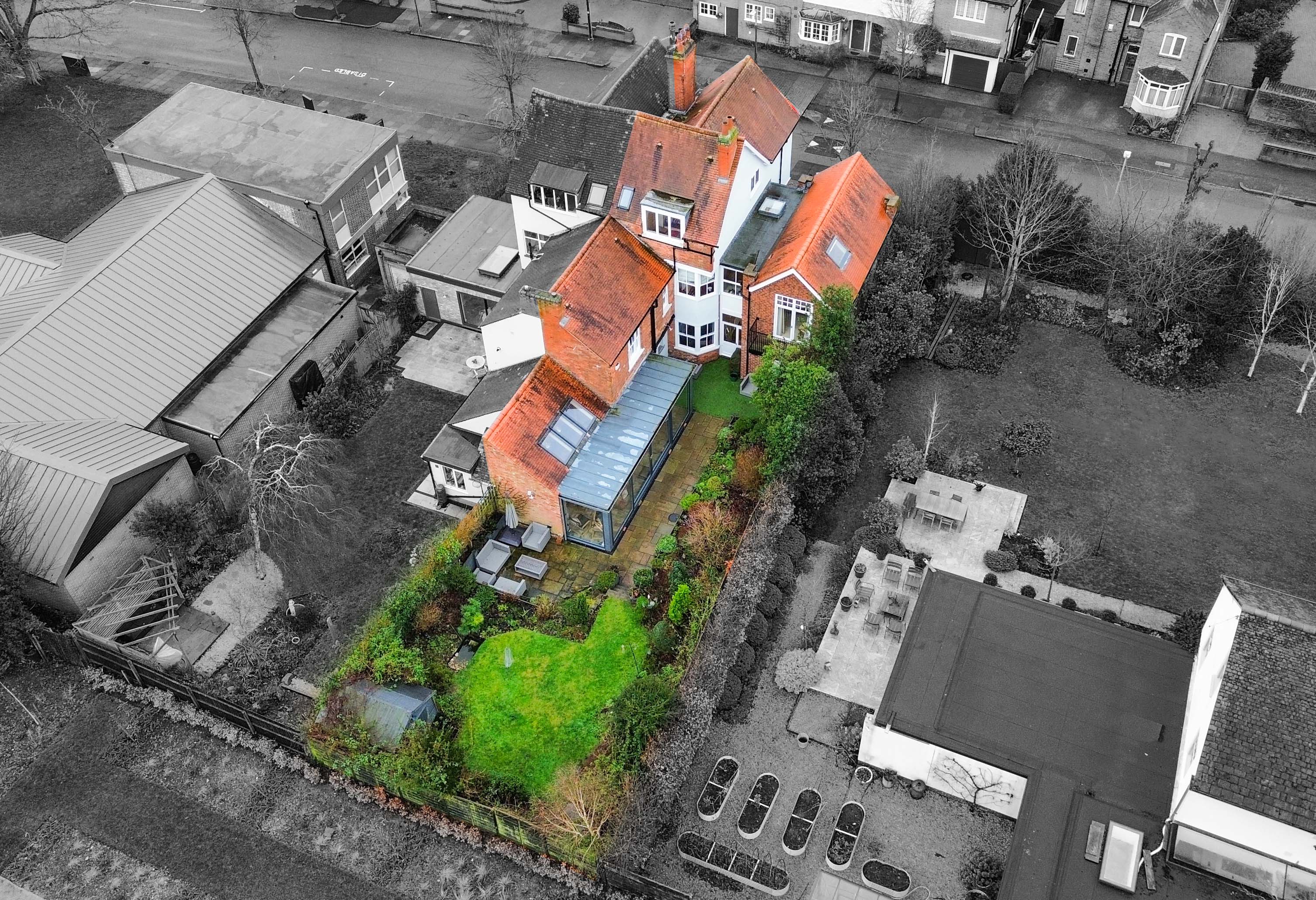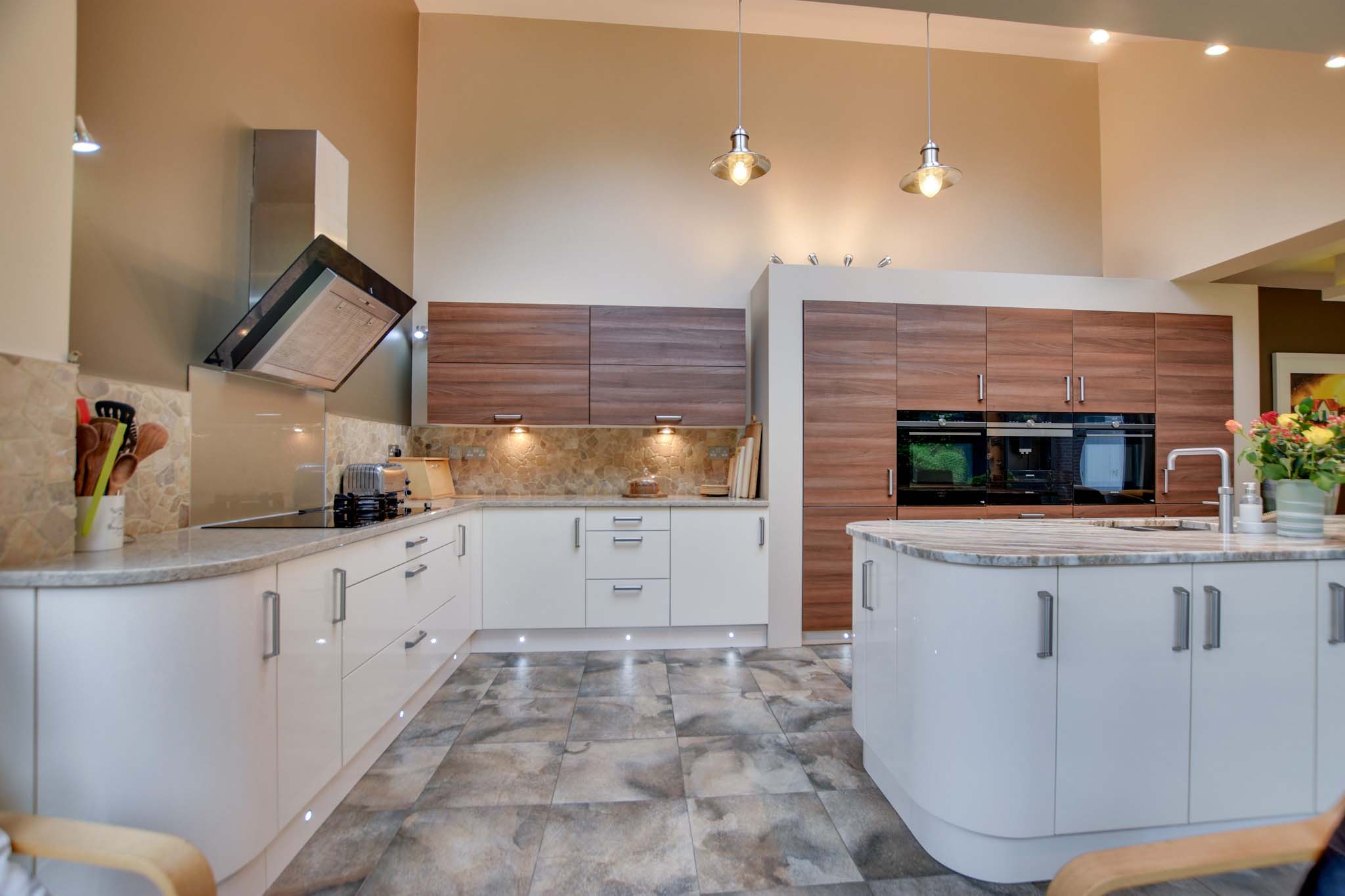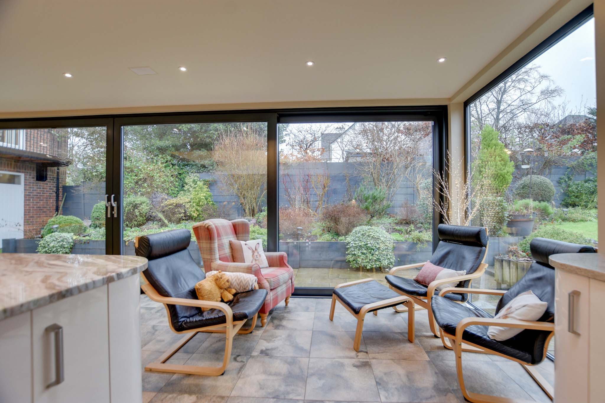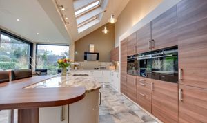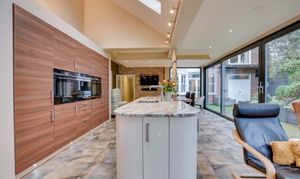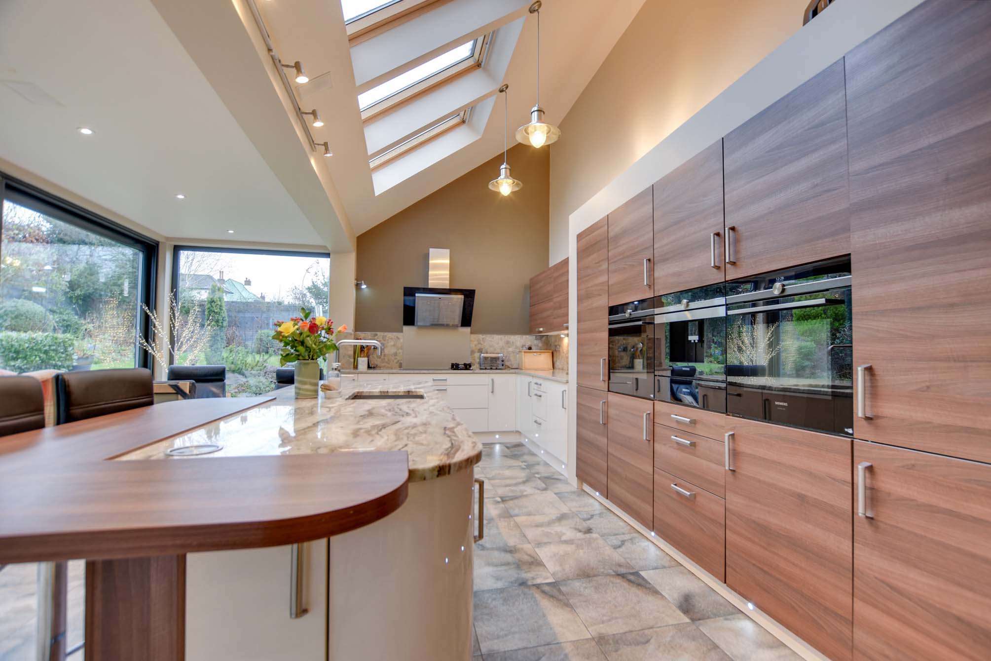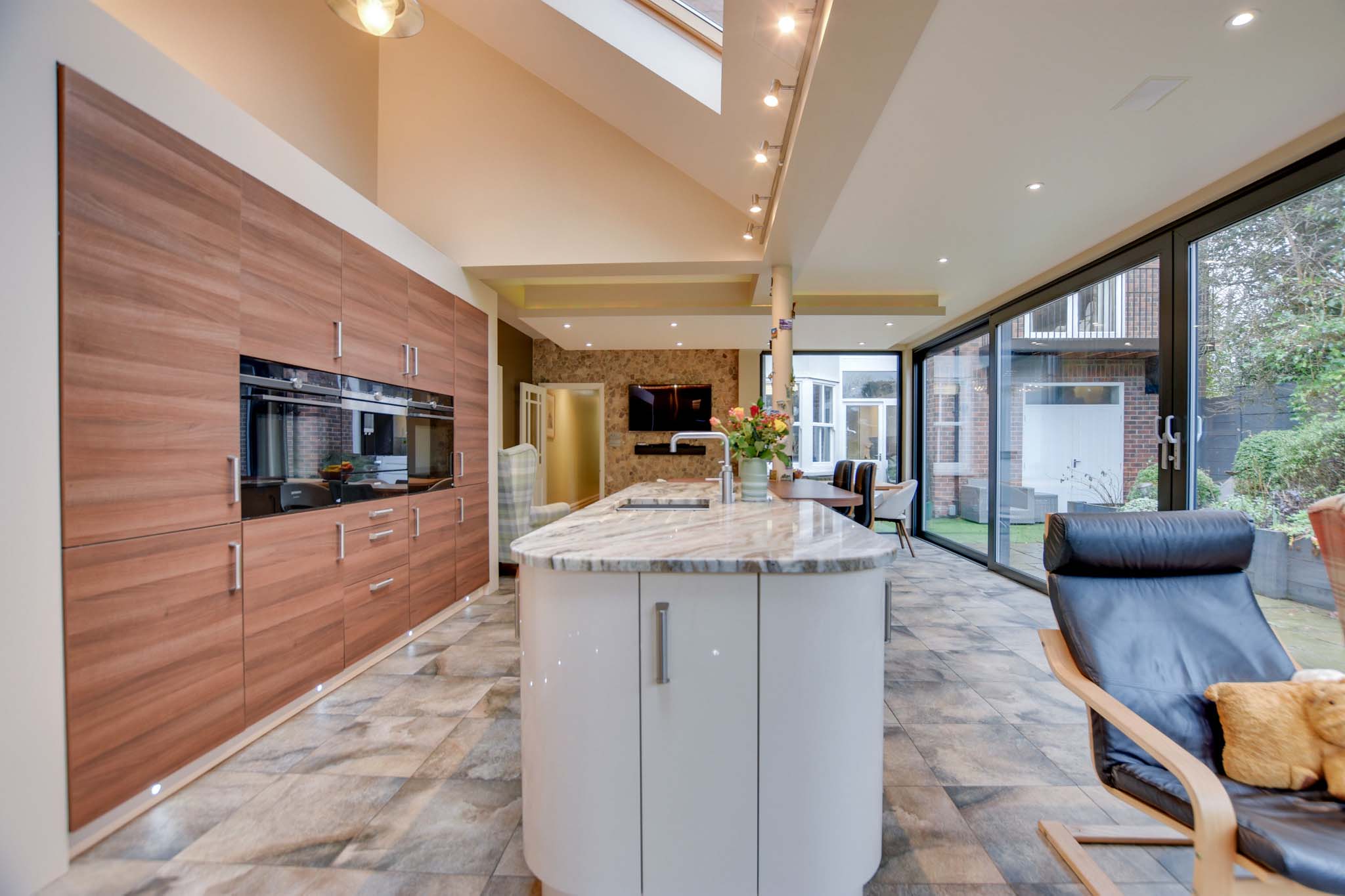 With feature triple-glazed large sliding doors to the side elevation and two picture windows to the front and rear elevations, which give views and access to the rear garden beyond, three skylight windows to the side elevation, inset ceiling lighting, centre island with built-in one and a half bowl stainless steel sink, breakfast bar, base units and marble work surface over. Kitchen Area: a stylishly fitted kitchen with low-level floor lighting and over-unit lighting, two built-in Siemens ovens, coffee machine, Siemens induction hob, single gas hob with extractor over, built-in dishwasher, a range of cream and brown base units with marble work surfaces over, wall units with under-unit lighting, part mosaic tiling and tiled flooring with seating area, dining area, TV point and underfloor heating.