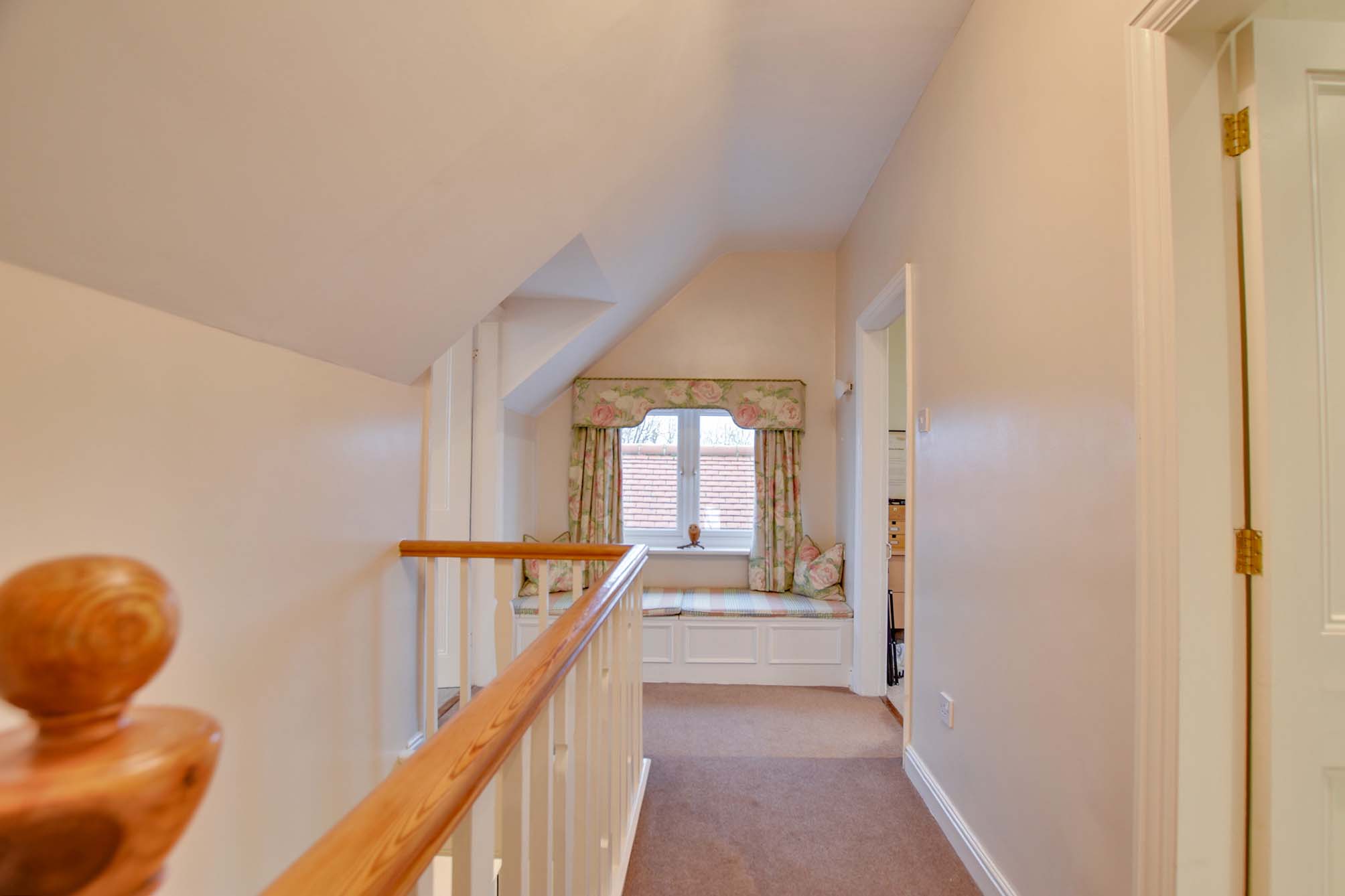 Large L-shaped landing with a feature tall window to the front elevation, storage cupboard and radiator.