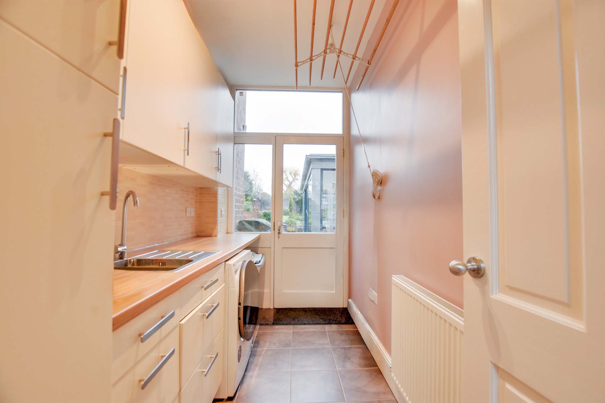 With a door leading to the rear garden, a sink and drainer unit with a range of wall and base units with work surfaces over, plumbing for a washing machine, tiled flooring and a radiator.