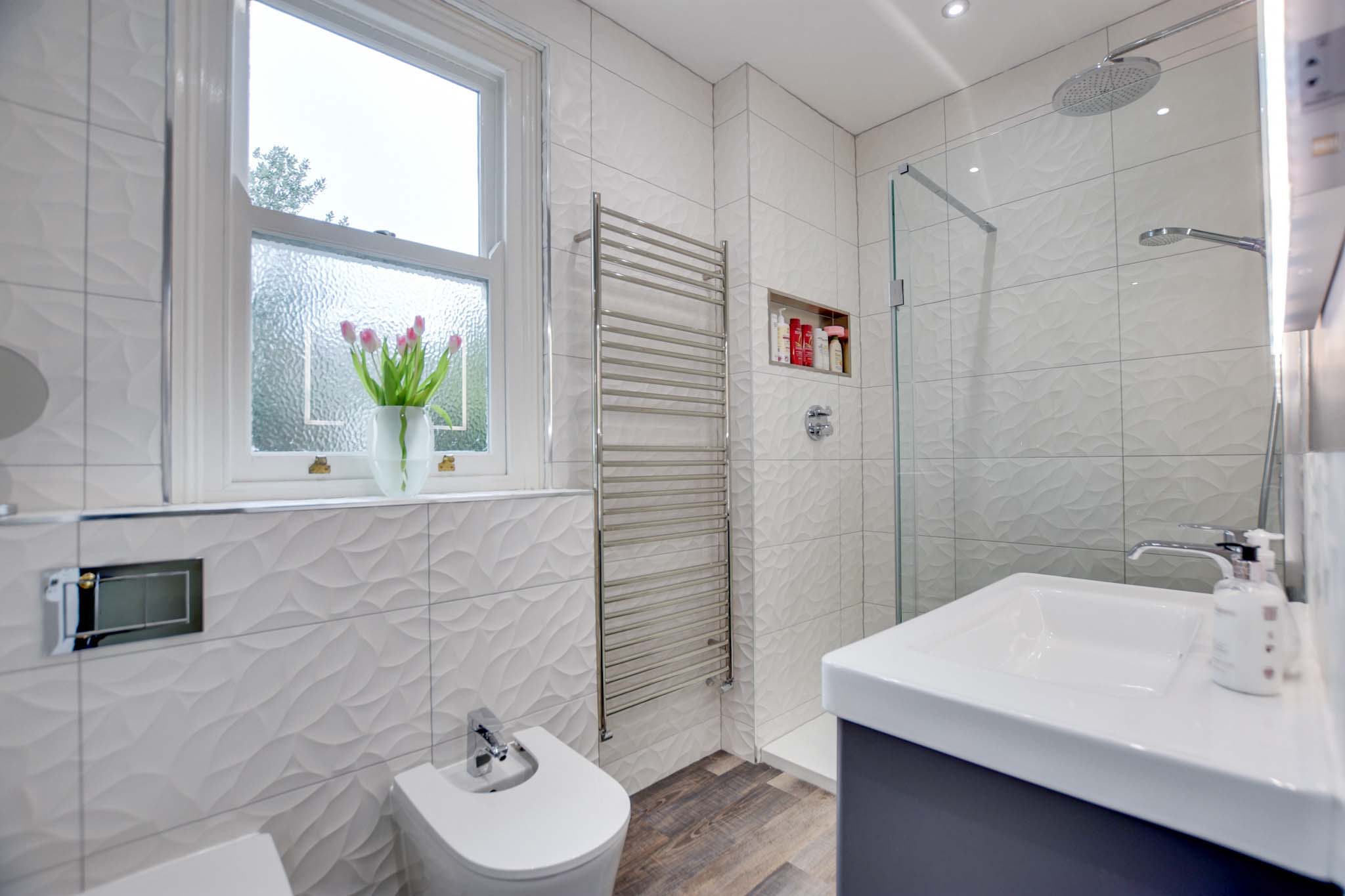 With a double-glazed sash window to the side elevation, walk-in shower cubicle with overhead rainfall shower and hand-held shower attachment, low-level WC, bidet, wash hand basin, tiled walls, built-in shelf, wood effect flooring and a heated chrome towel radiator.