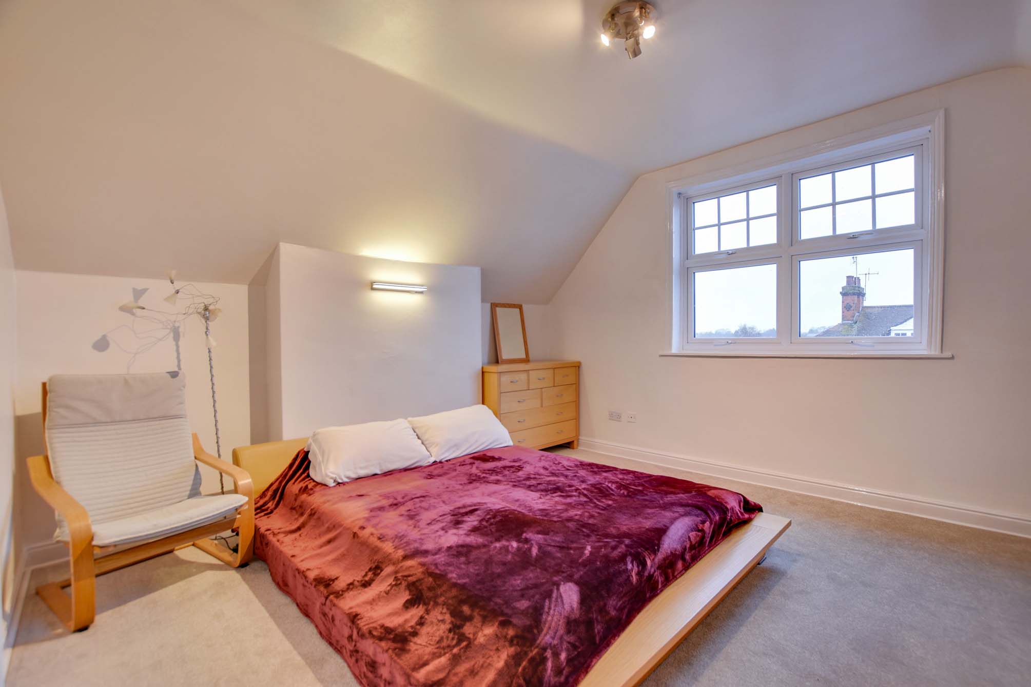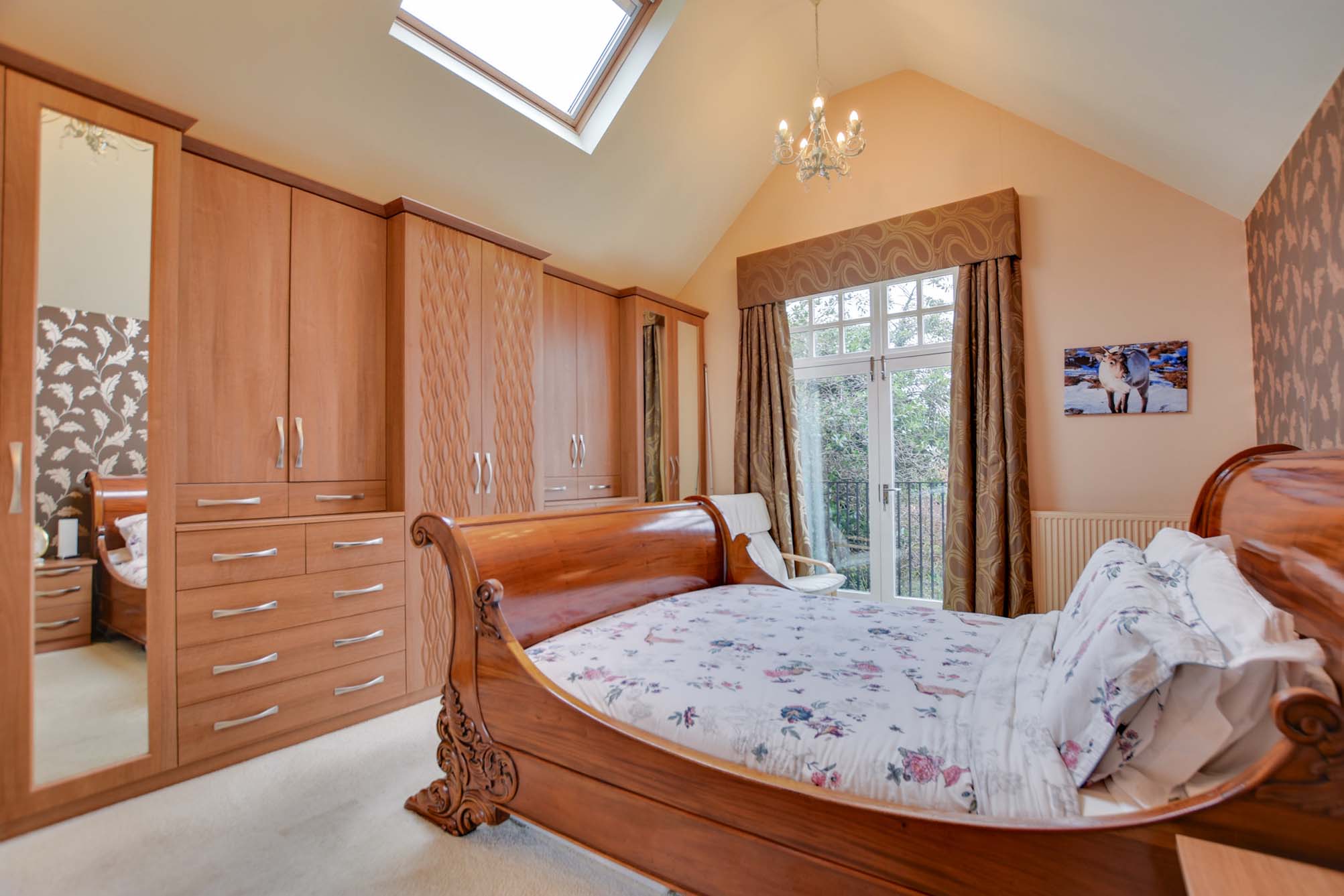 With double-glazed French doors leading to the decked balcony, a skylight window to the side elevation, a vaulted ceiling, a range of mirrored fitted wardrobes and drawers, and two radiators.