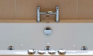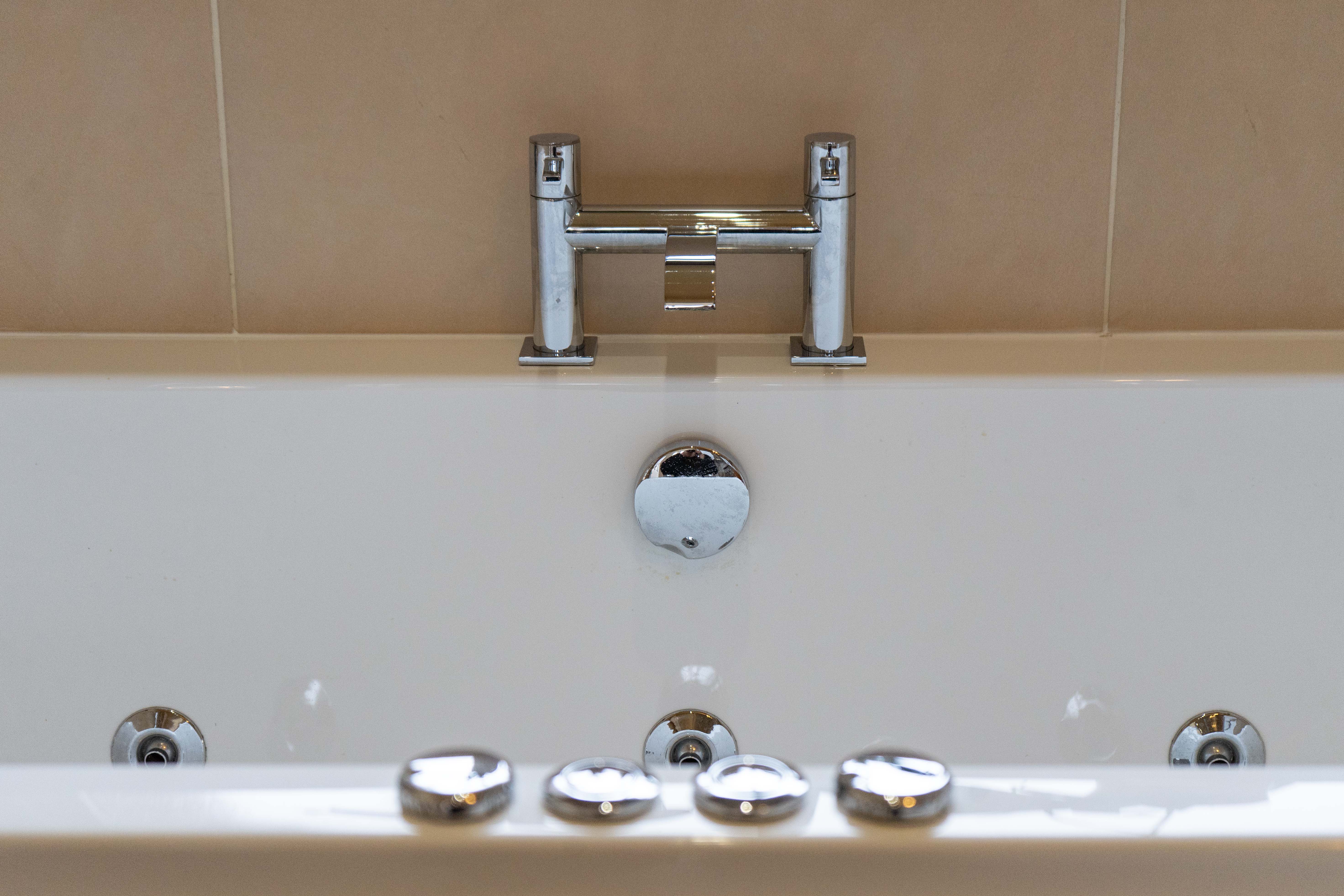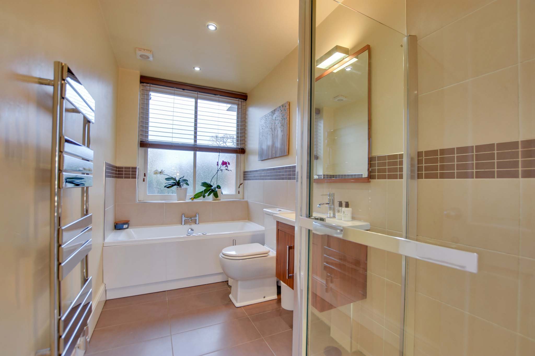 With a double-glazed window to the rear elevation, Jacuzzi bath, low-level WC, wash hand basin, walk-in shower cubicle with overhead rainfall shower and handheld shower attachment, tiled flooring, extractor fan, ceiling spotlights and a heated towel radiator.