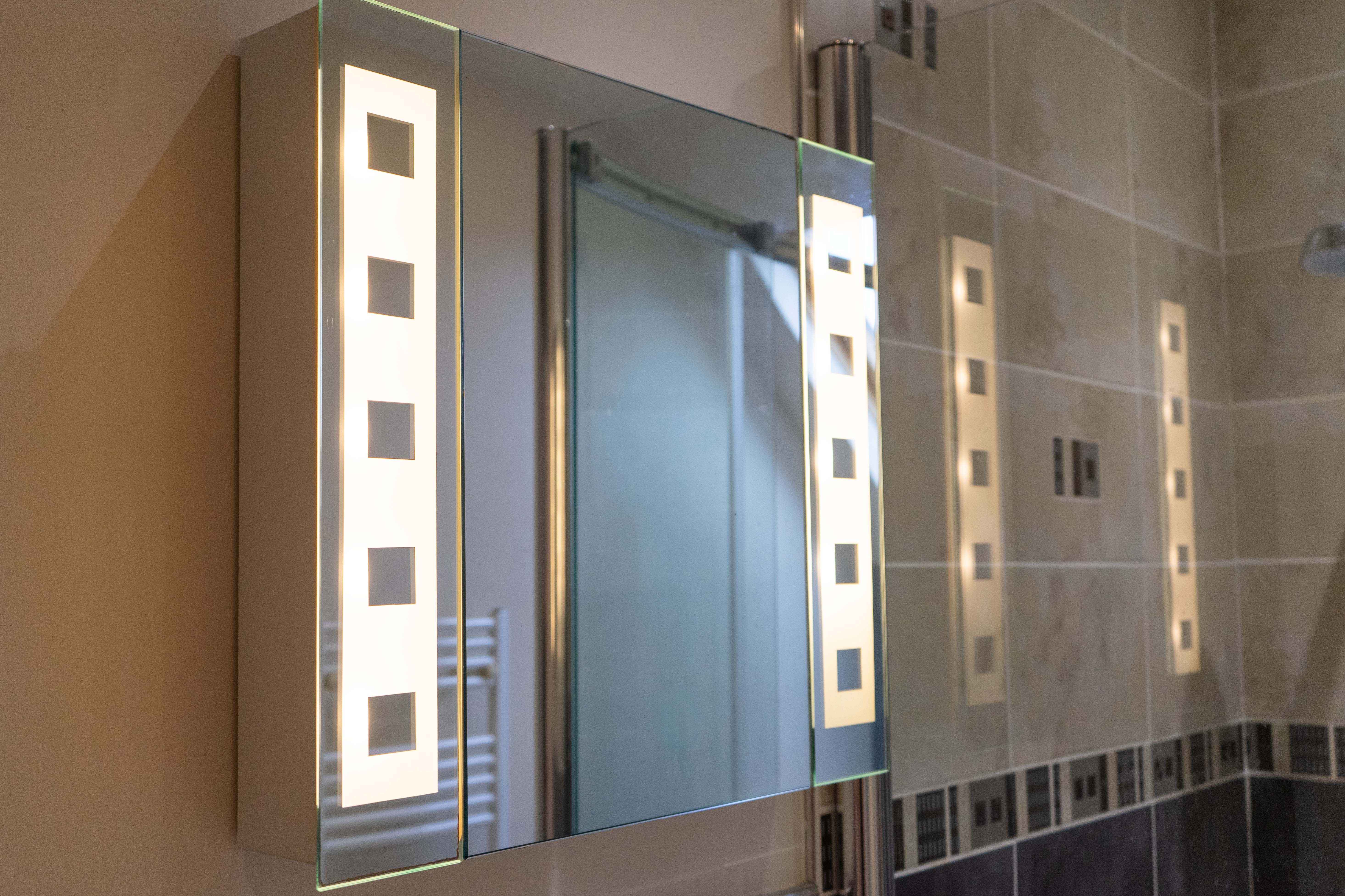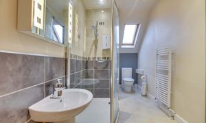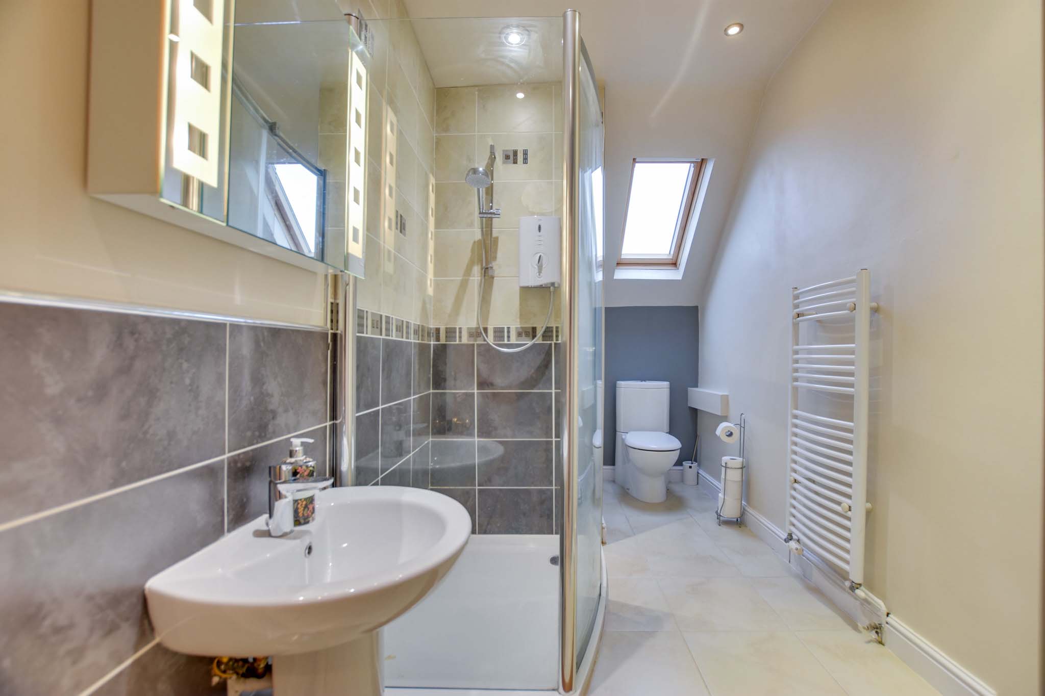 With a double-glazed skylight window to the rear elevation, ceiling spotlights, a walk-in shower cubicle with electric shower, a wash hand basin, a low-level WC, partly tiled walls, a linen cupboard, tiled flooring and a heated towel radiator.